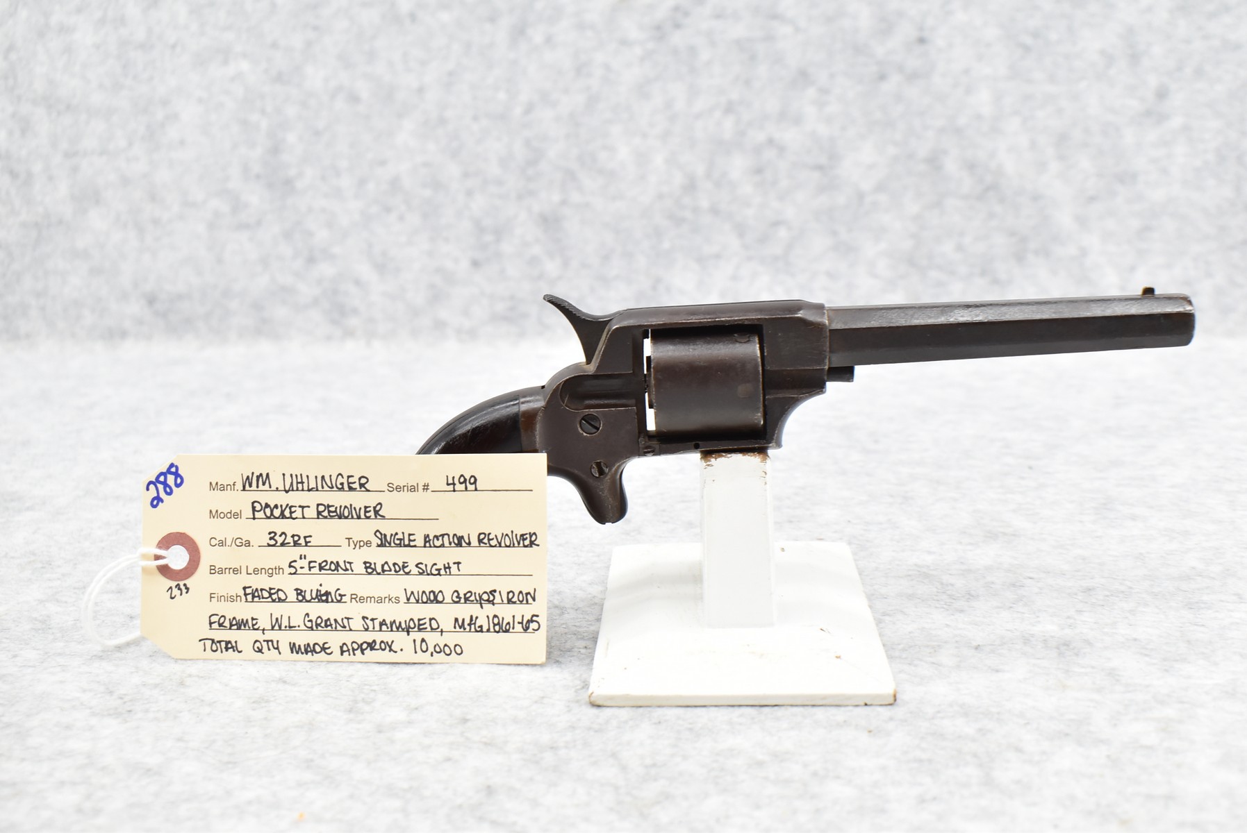 288. Wm. Uhlinger – Mod. Pocket Revolver – 32RF Cal. Single Action Revolver – w/5” Barrel w/Front Blade Sight – Faded Blued Finish – Iron Frame – w/Wood Grips – “W.L. Grant” Stamped – Mfg. 1861-65, Total Quantity Made Approx. 10,000