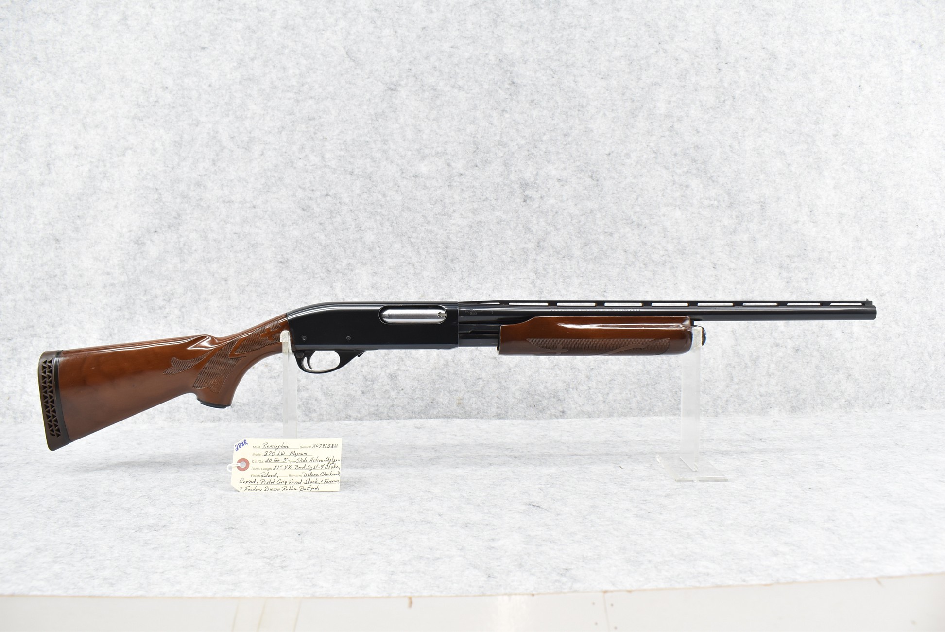 288R. Remington – Mod. 870 LW Magnum – 20ga. 3” Pump Action Shotgun – w/21” Rem Choke, Vent-Rib Barrel w/Bead Sight – Blued Finish – w/Deluxe Checkered Capped Pistol Grip Wood Stocks w/Factory Butt Pad
