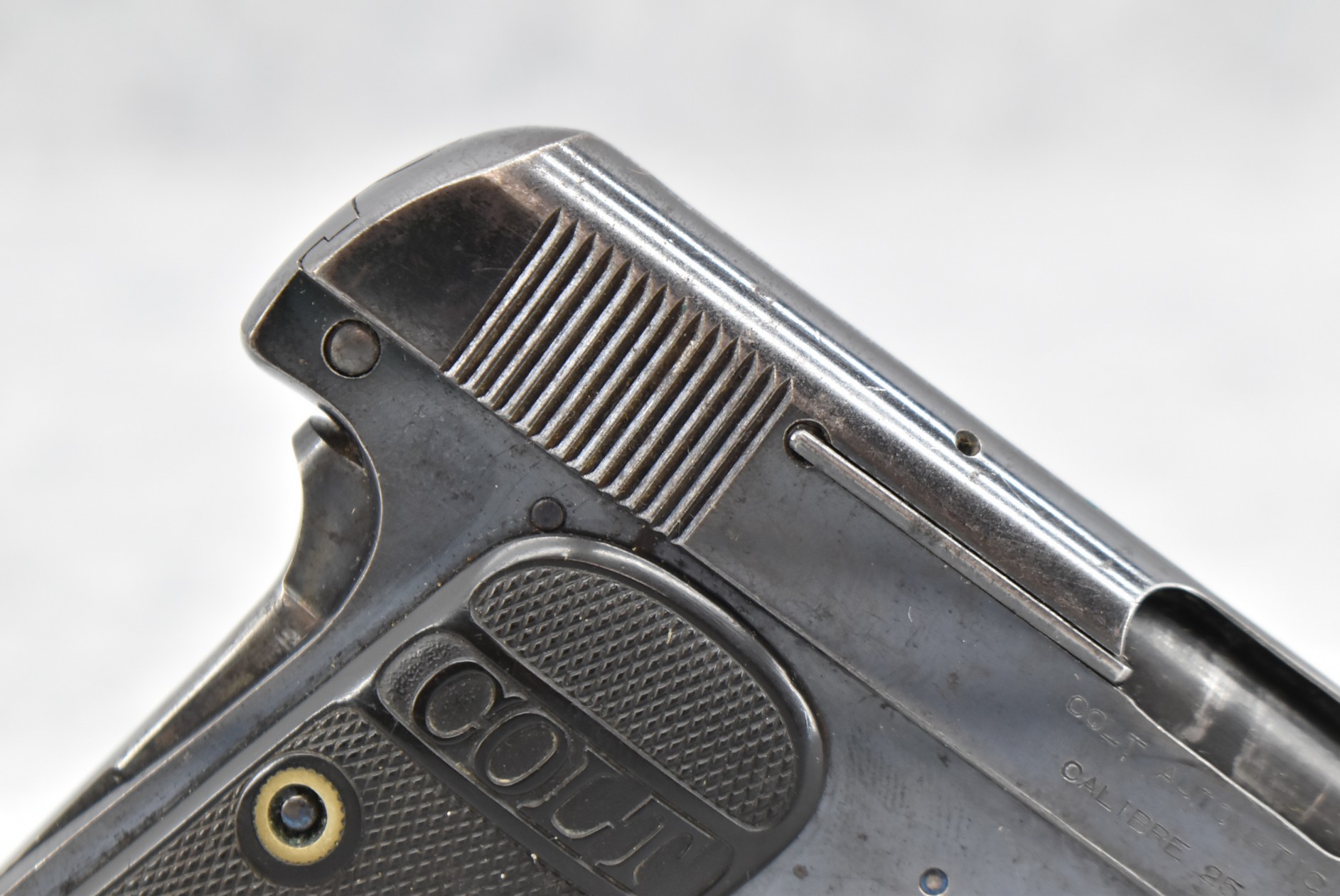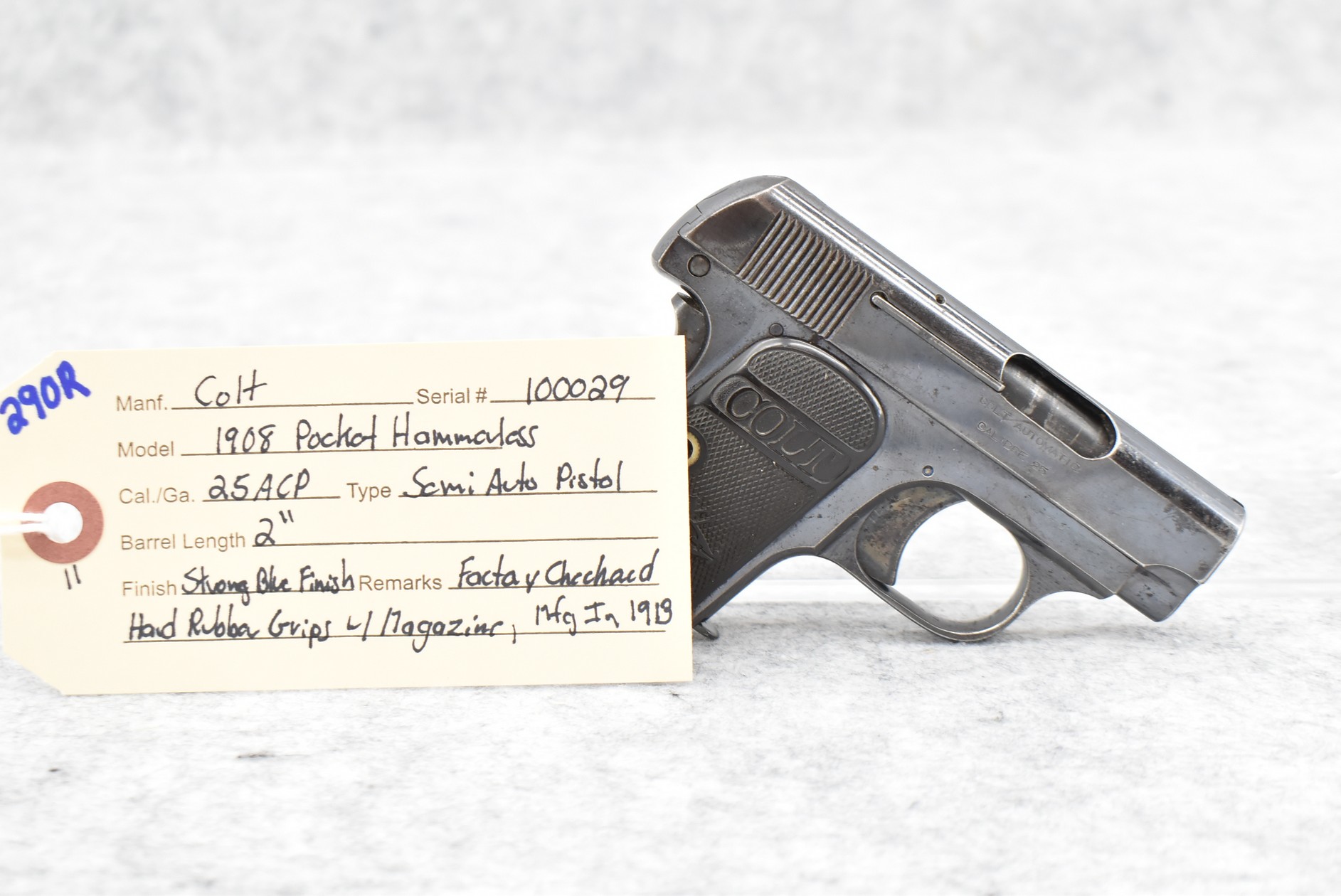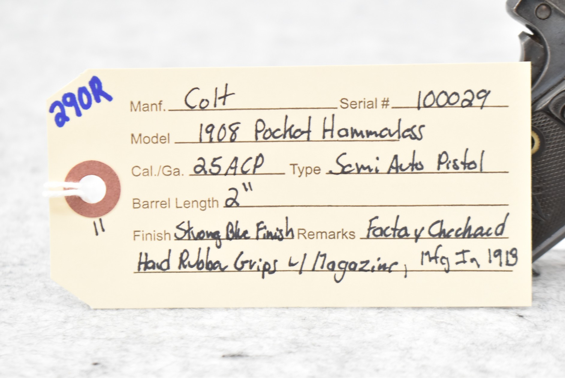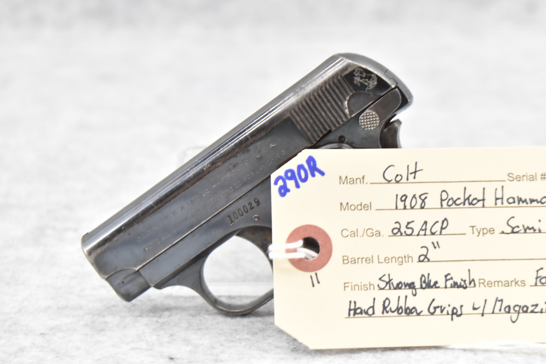 290R. Colt – Mod. 1908 Pocket Hammerless – 25 ACP Cal. Semi-Auto Pistol – w/2” Barrel – Strong Blue Finish – w/Factory Checkered Hard Rubber Grips – w/Magazine – Mfg. 1913