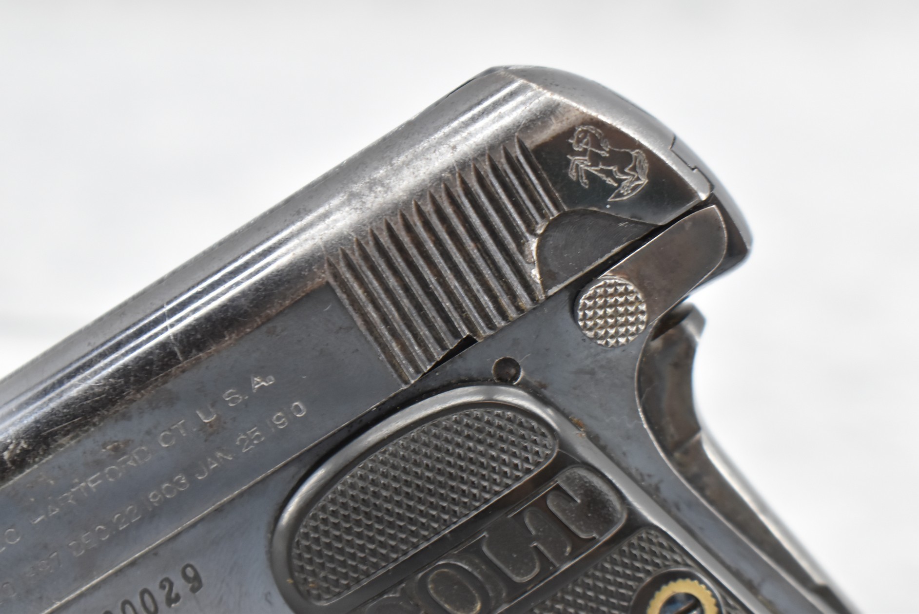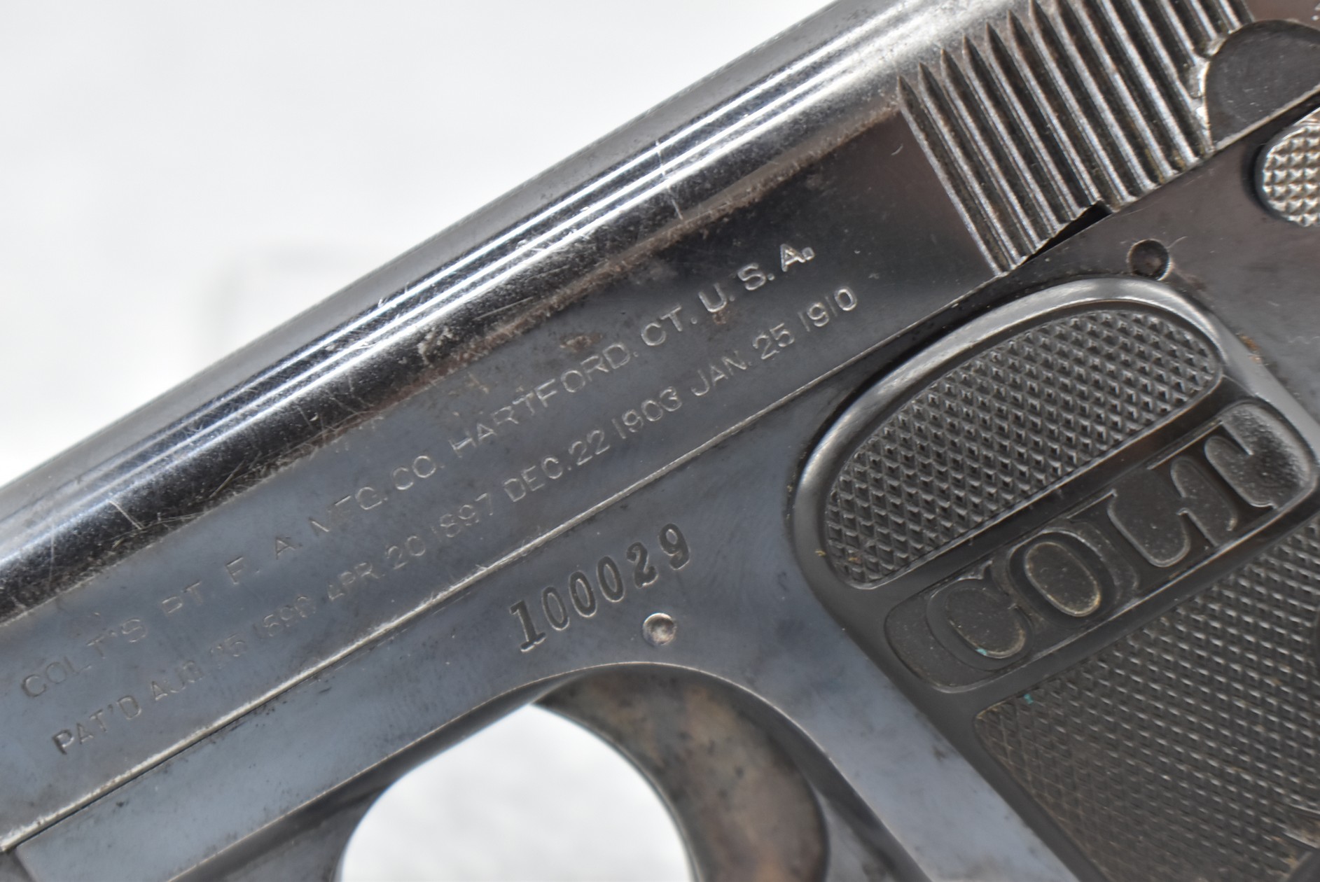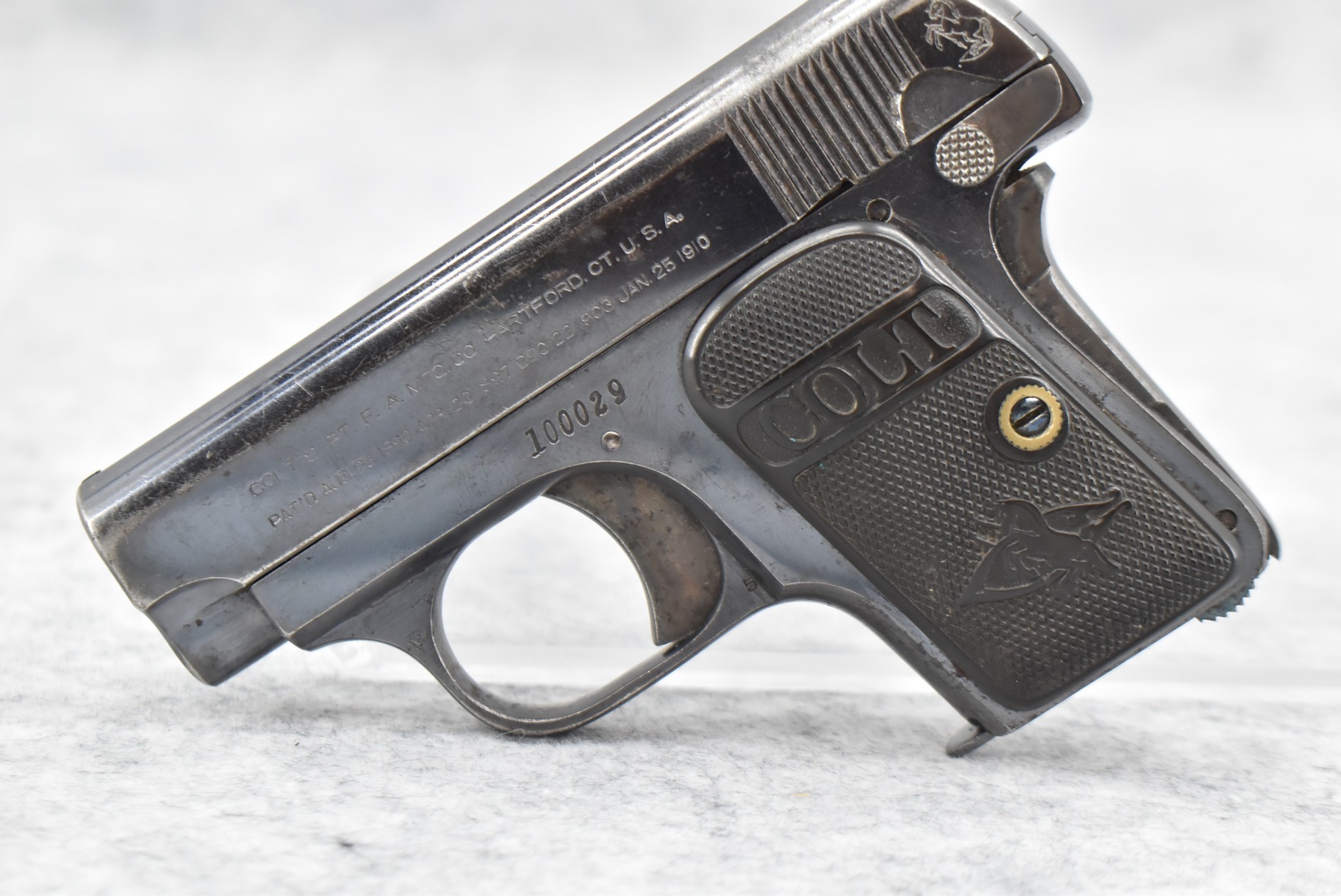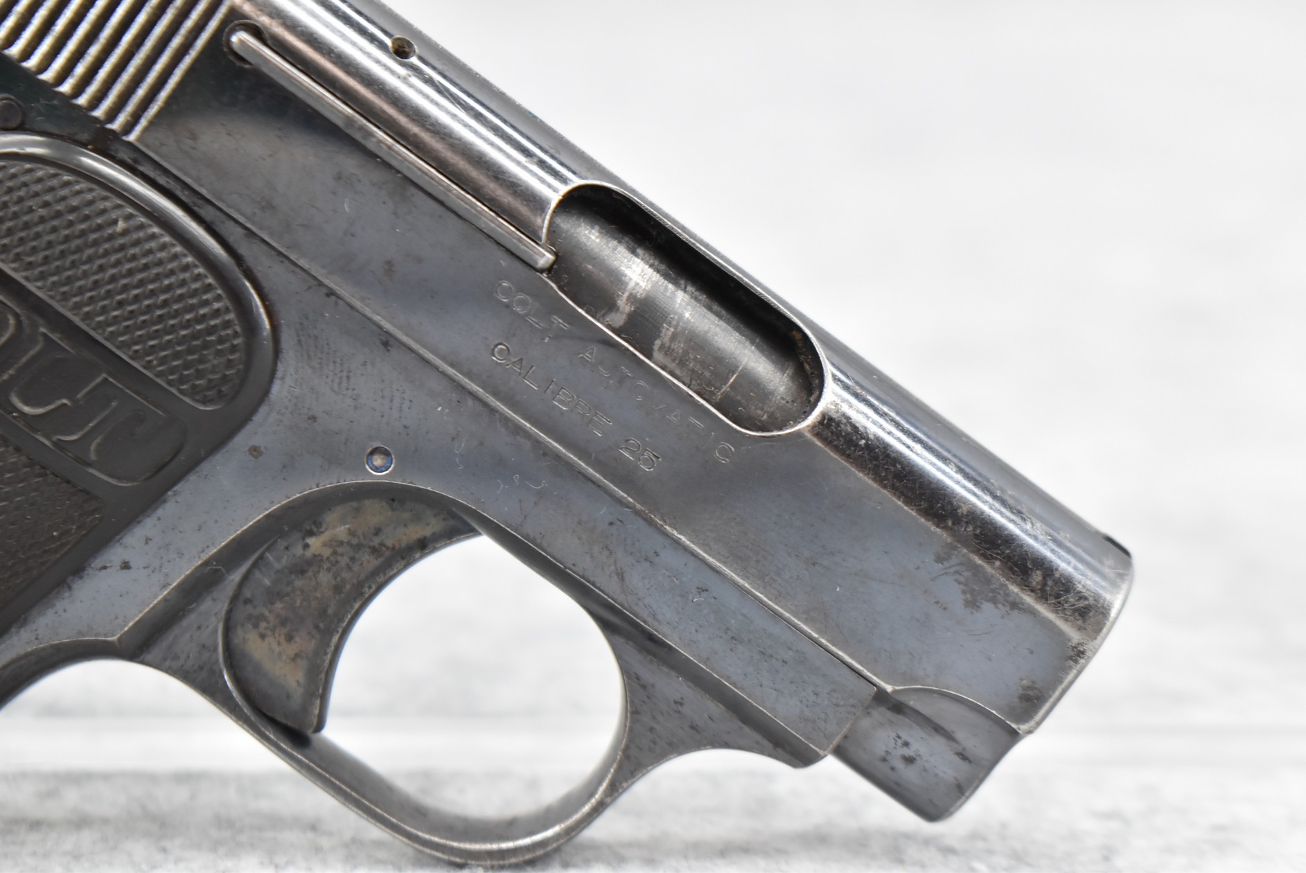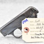 290R. Colt – Mod. 1908 Pocket Hammerless – 25 ACP Cal. Semi-Auto Pistol – w/2” Barrel – Strong Blue Finish – w/Factory Checkered Hard Rubber Grips – w/Magazine – Mfg. 1913