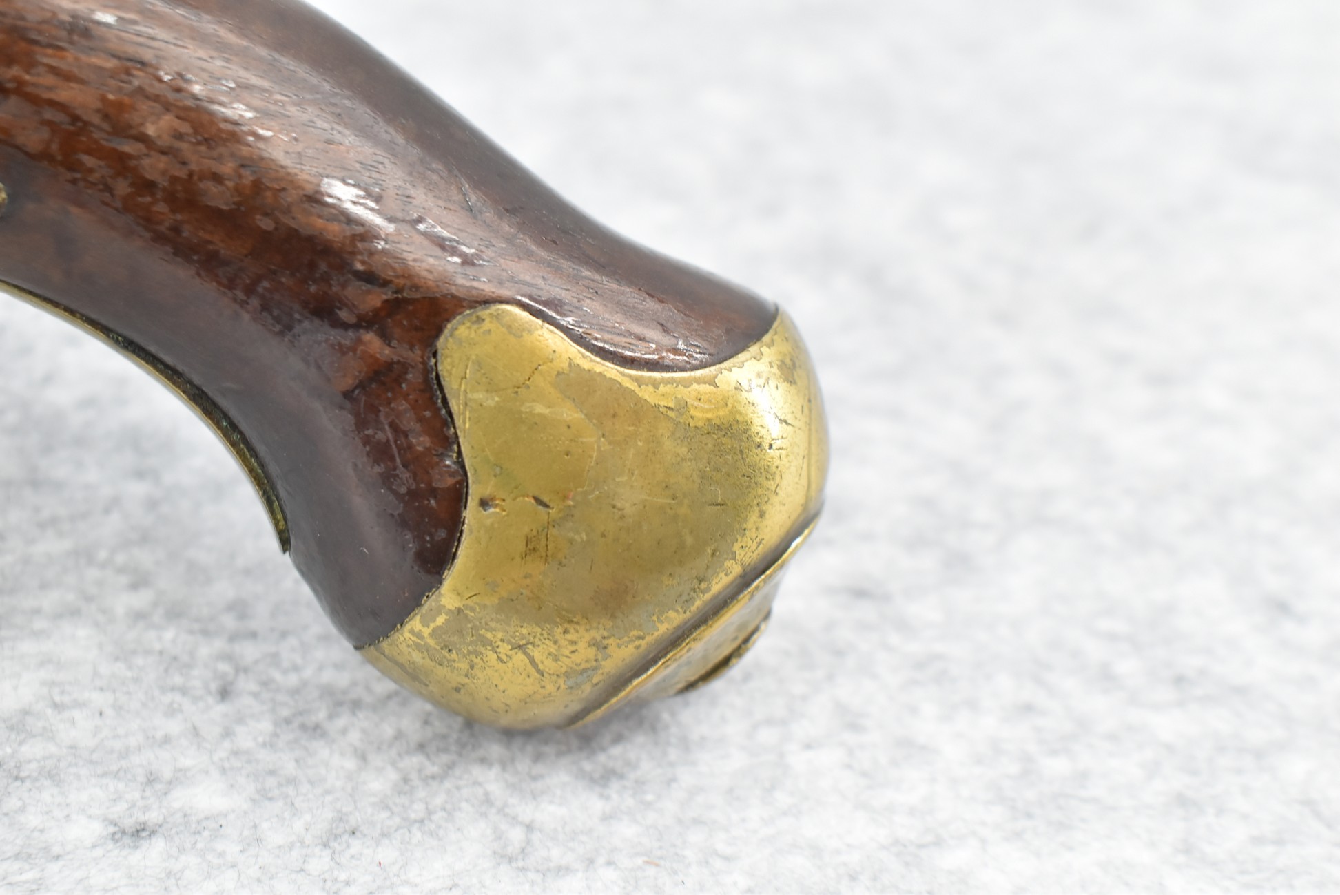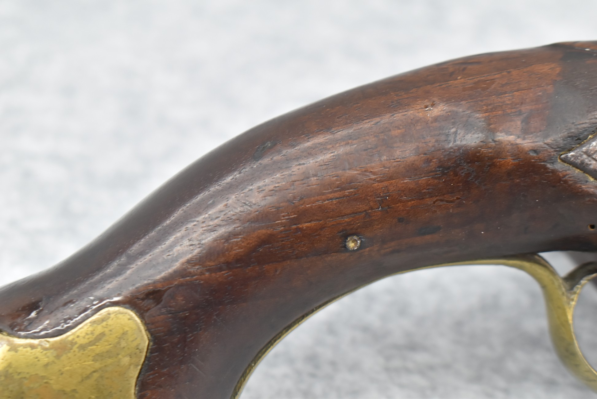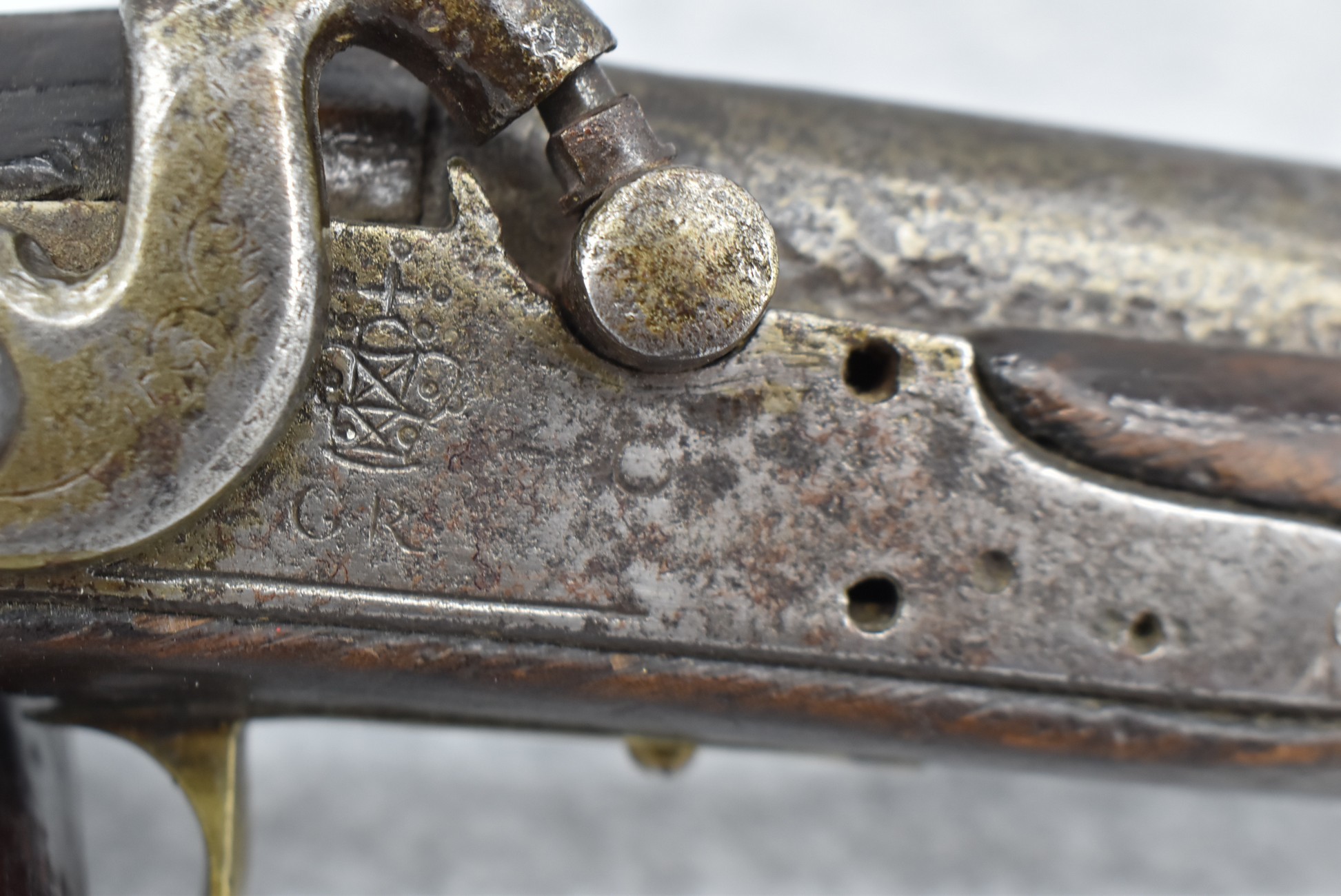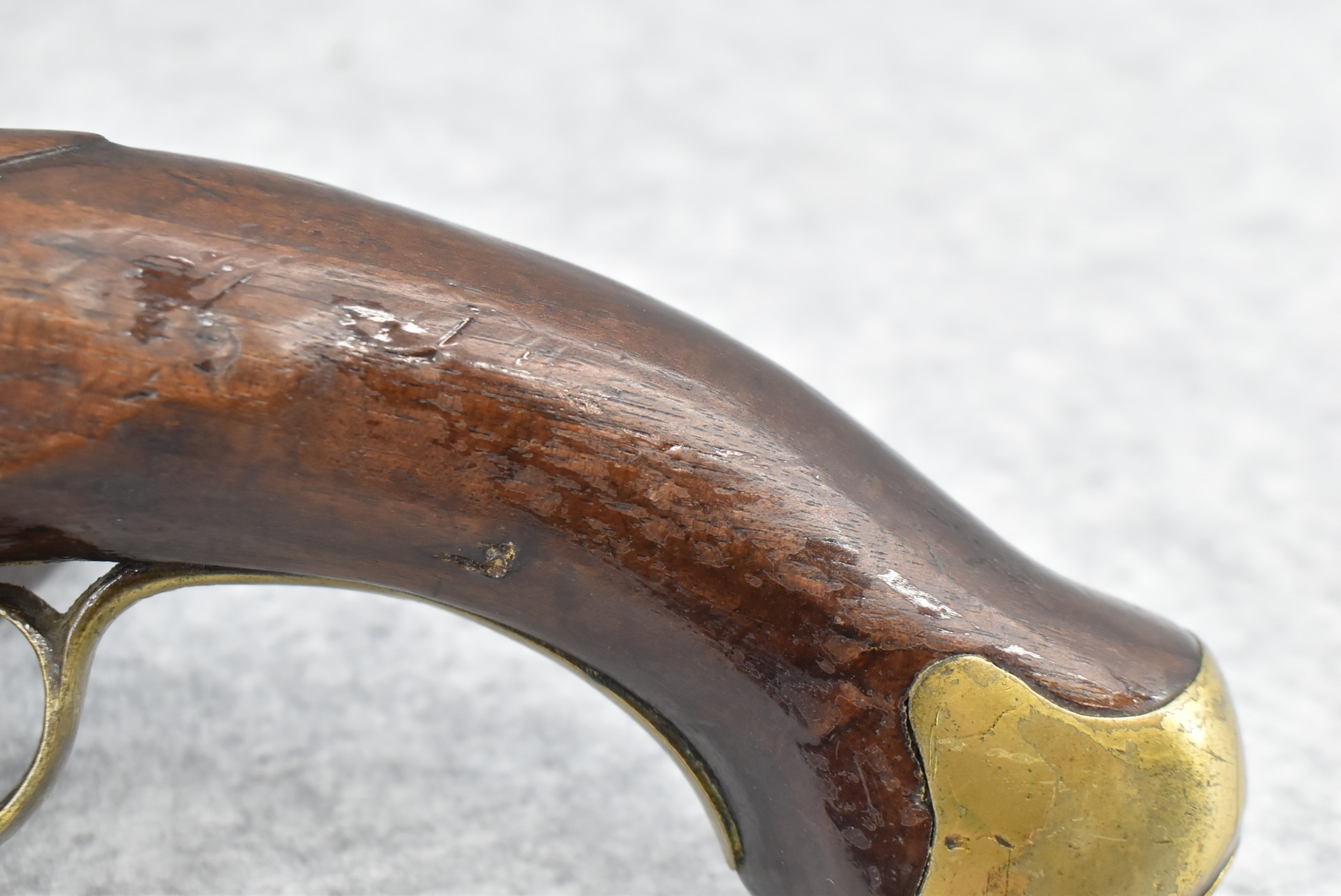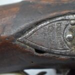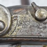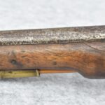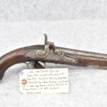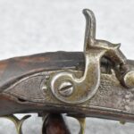 291. Dublin Castle (Ireland) – 70 Cal. Light Dragoon Pistol Converted to Percussion – w/9” Round Barrel – Gray Finish – w/Pistol Grip Wood Stock w/Brass Grip Cap & Brass Furniture – Lock Marked “G.R.” & “Dublin Castle” Marked in Shield on Tail of Lock – Top of Barrel Marked “C N 5697” – w/Ram Rod – Note: Action Needs Adjustment