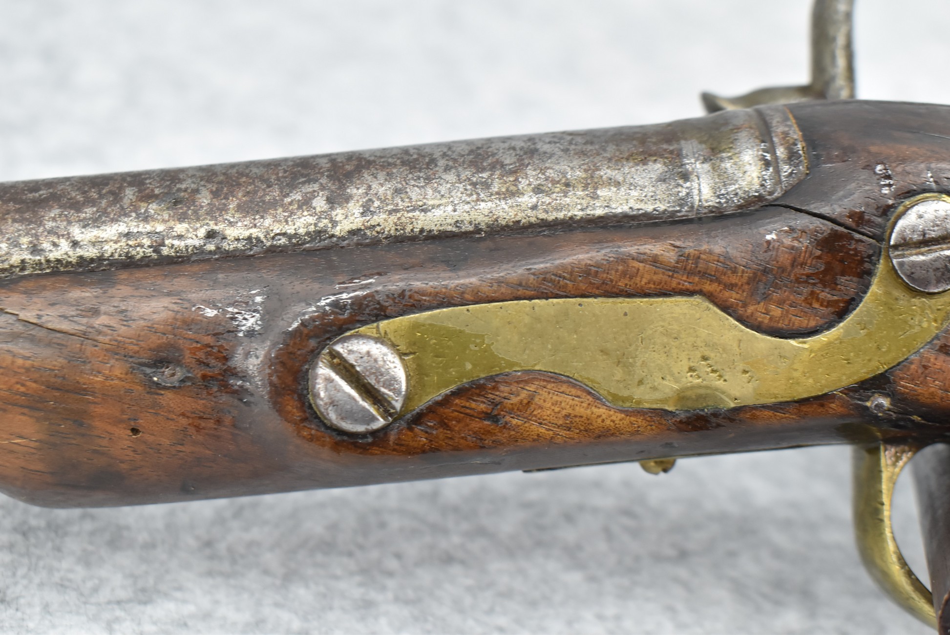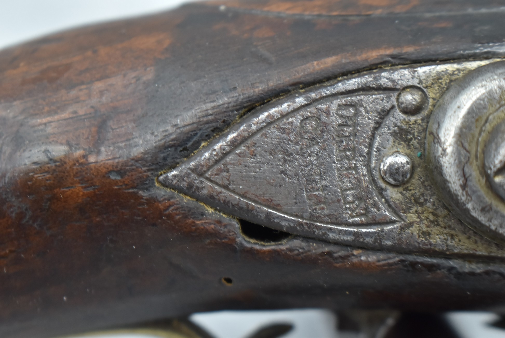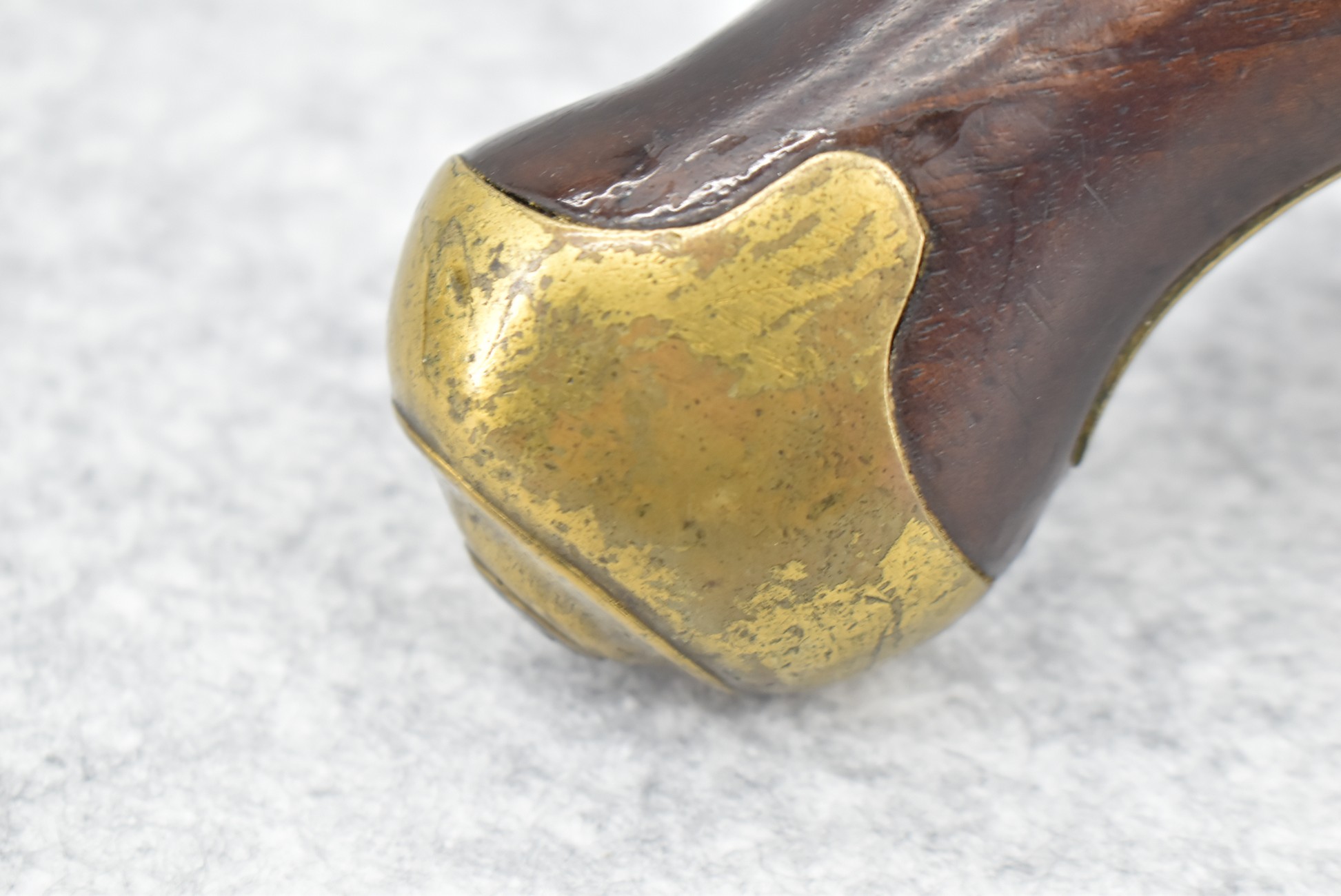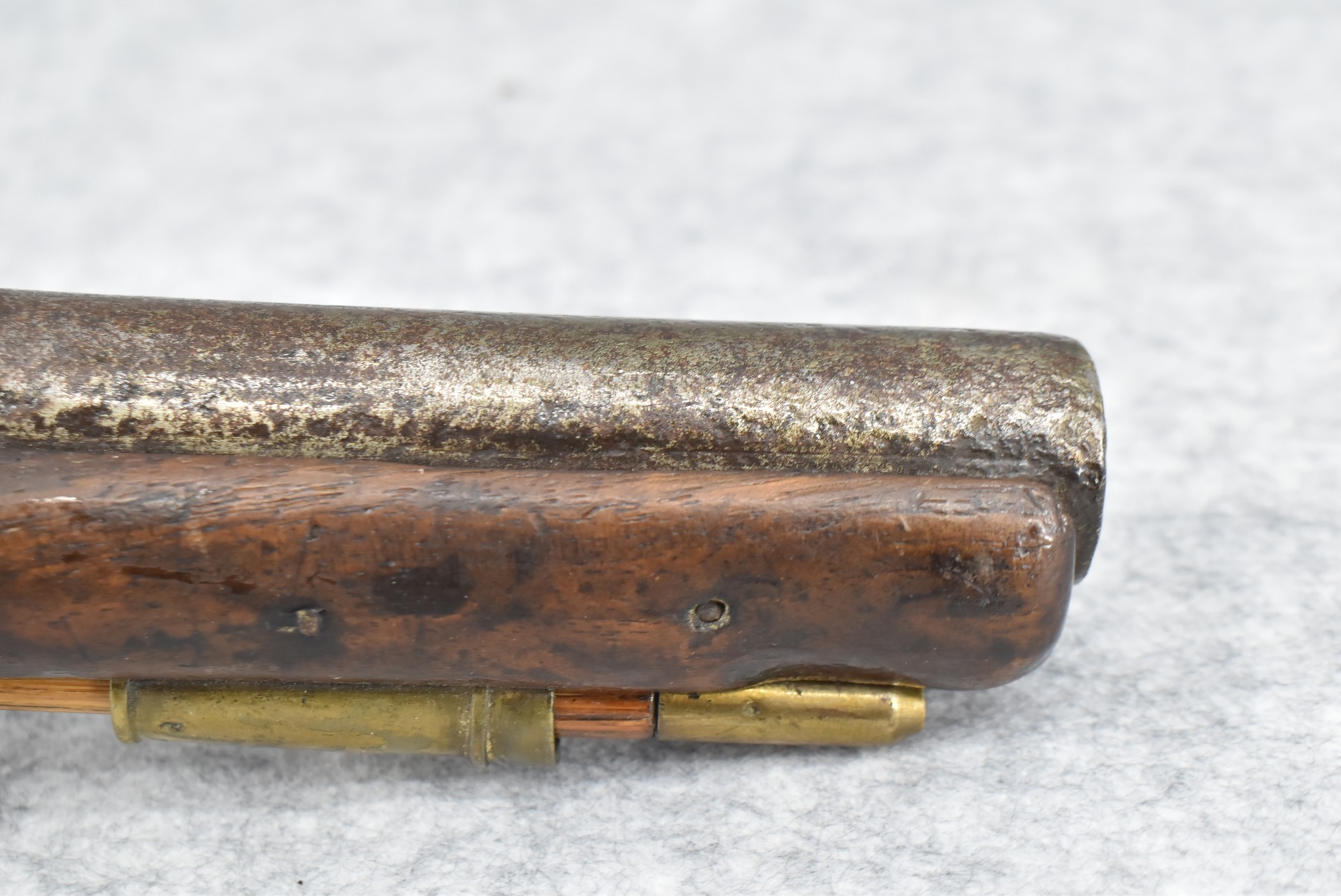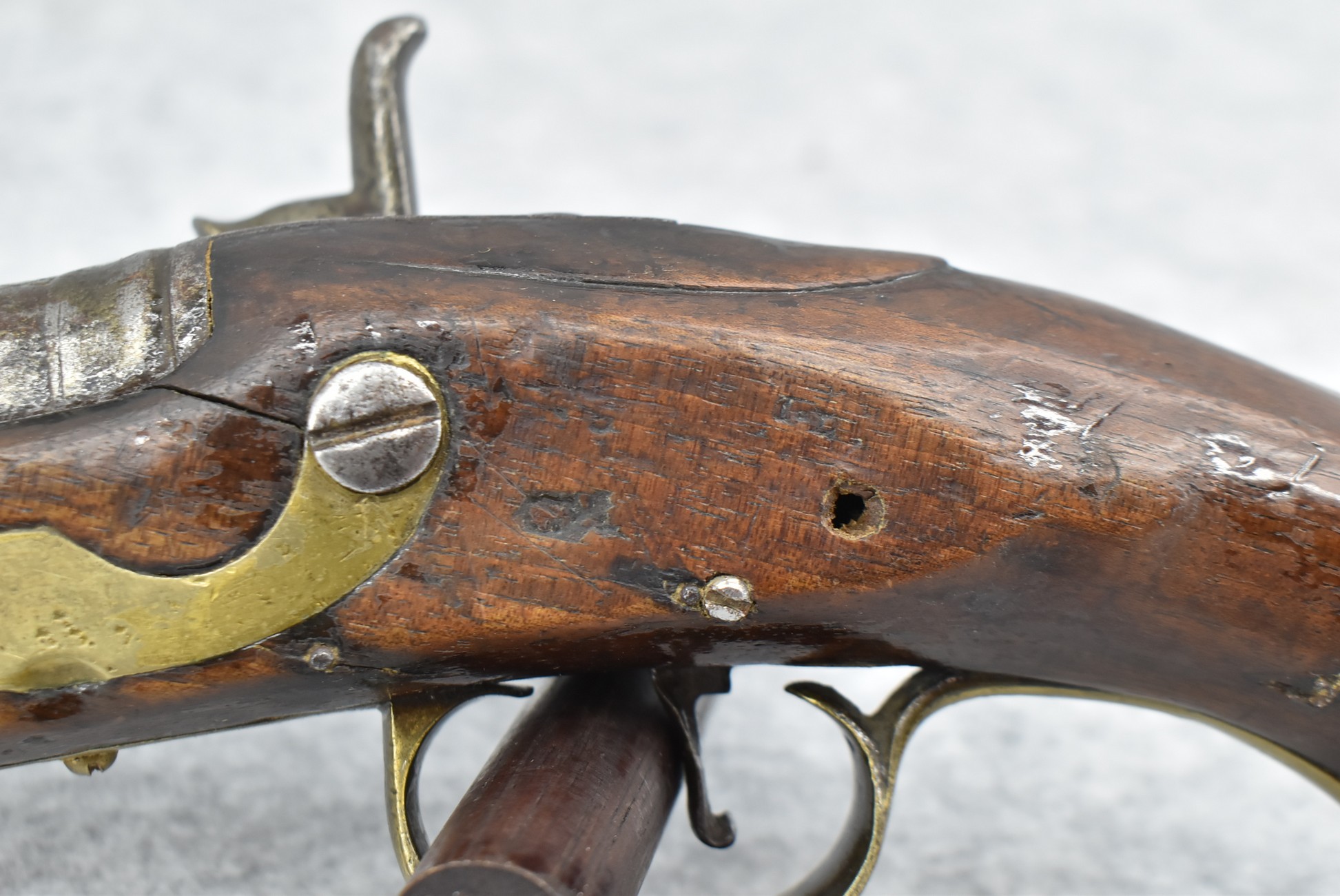 291. Dublin Castle (Ireland) – 70 Cal. Light Dragoon Pistol Converted to Percussion – w/9” Round Barrel – Gray Finish – w/Pistol Grip Wood Stock w/Brass Grip Cap & Brass Furniture – Lock Marked “G.R.” & “Dublin Castle” Marked in Shield on Tail of Lock – Top of Barrel Marked “C N 5697” – w/Ram Rod – Note: Action Needs Adjustment