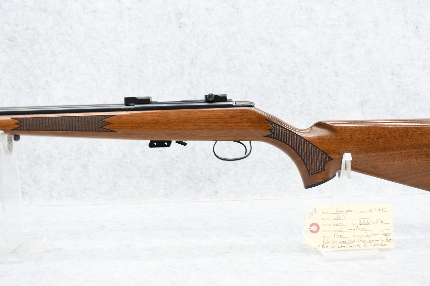 291R. Remington – Mod. 541-T – 22 Cal. Bolt Action Rifle – w/24” Heavy Barrel – Blued Finish – w/Checkered Capped Pistol Grip Wood Stock w/Factory Butt Plate w/Ebony Forearm Tip – w/Factory 5Rd Mag. – w/2pc. Leupold Bases