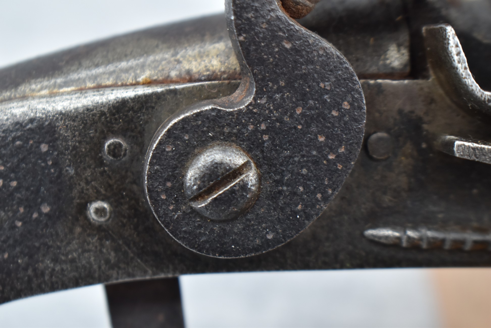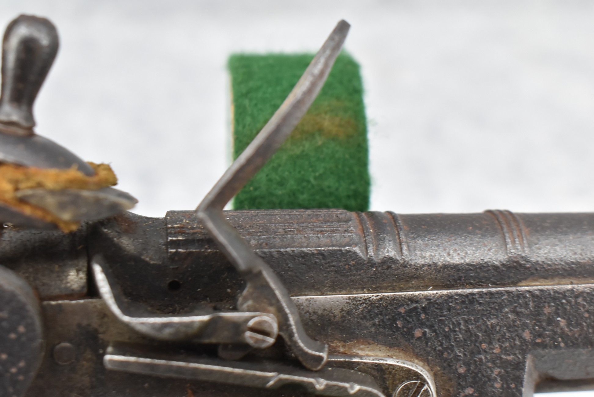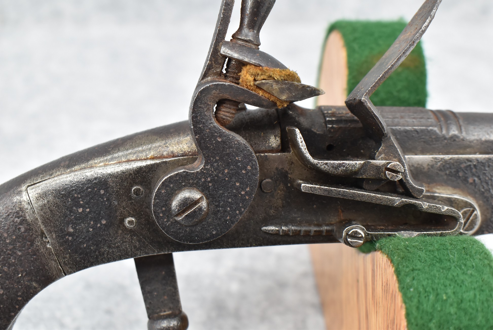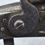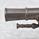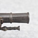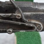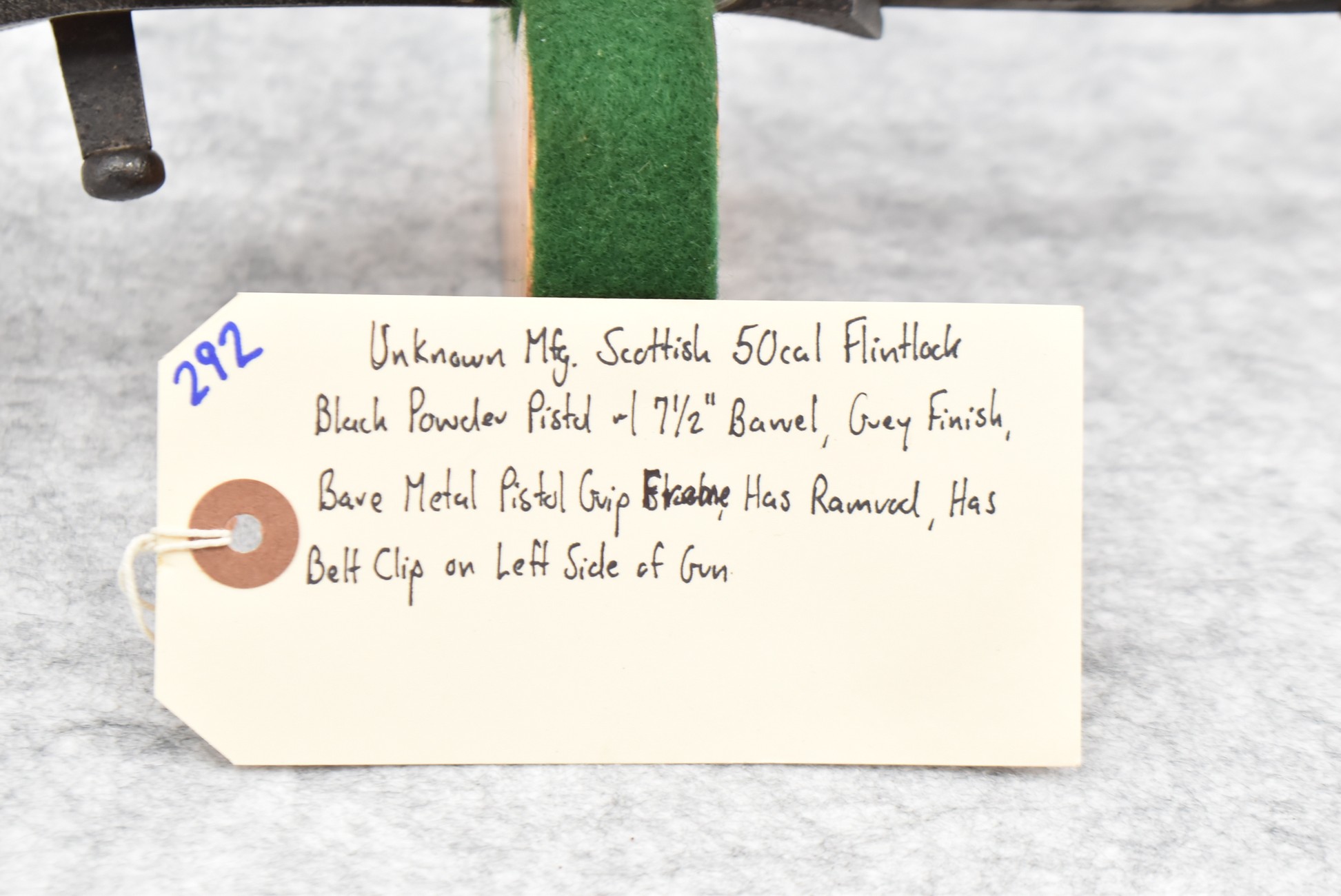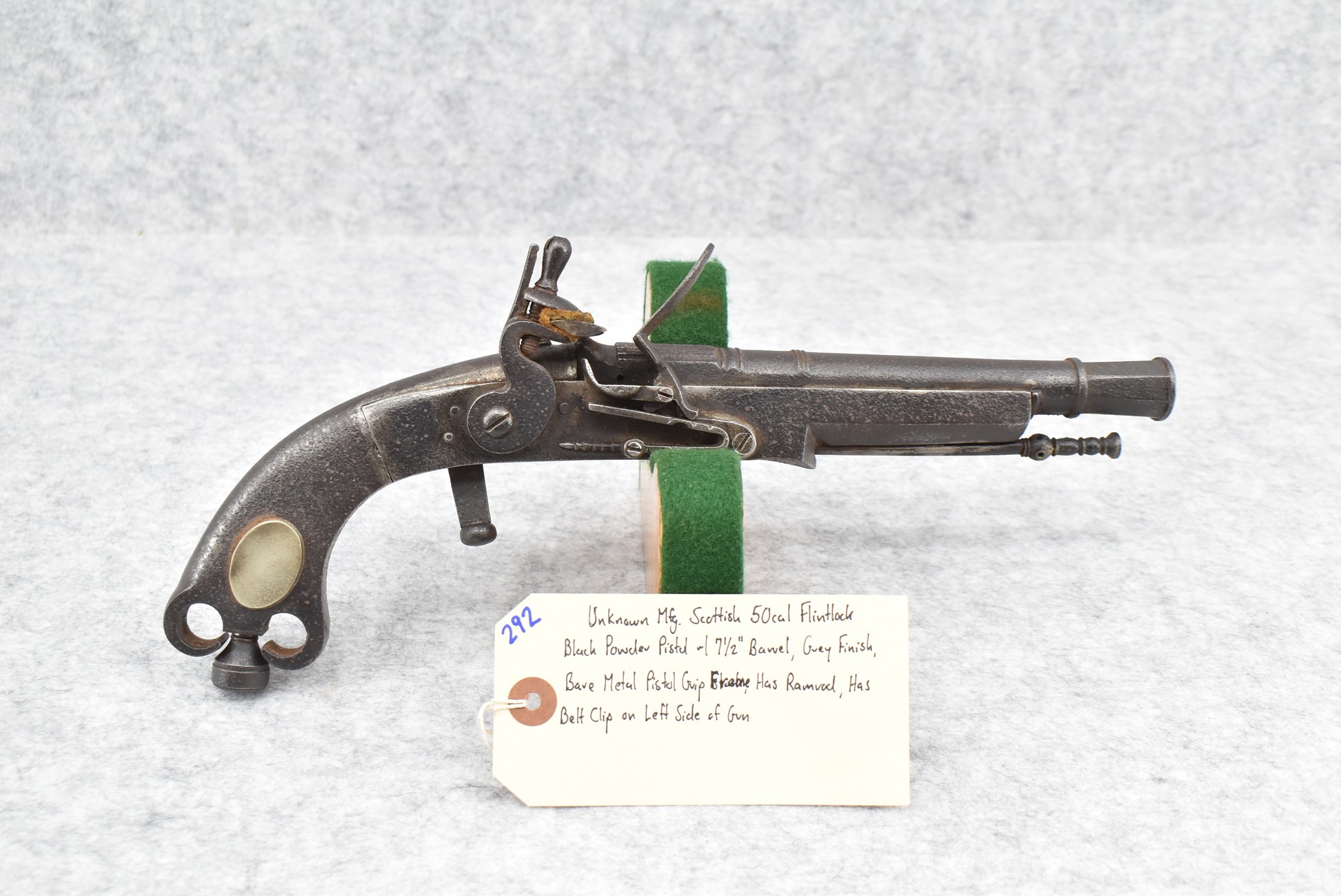292. Unknown Mfg. – Scottish 50 Cal. Flintlock Black Powder Pistol – w/7 ½” Barrel w/Flared Muzzle – Gray Finish – w/Bare Metal Pistol Grip Frame – w/Ram Rod – Has Belt Clip on Left Side of Gun