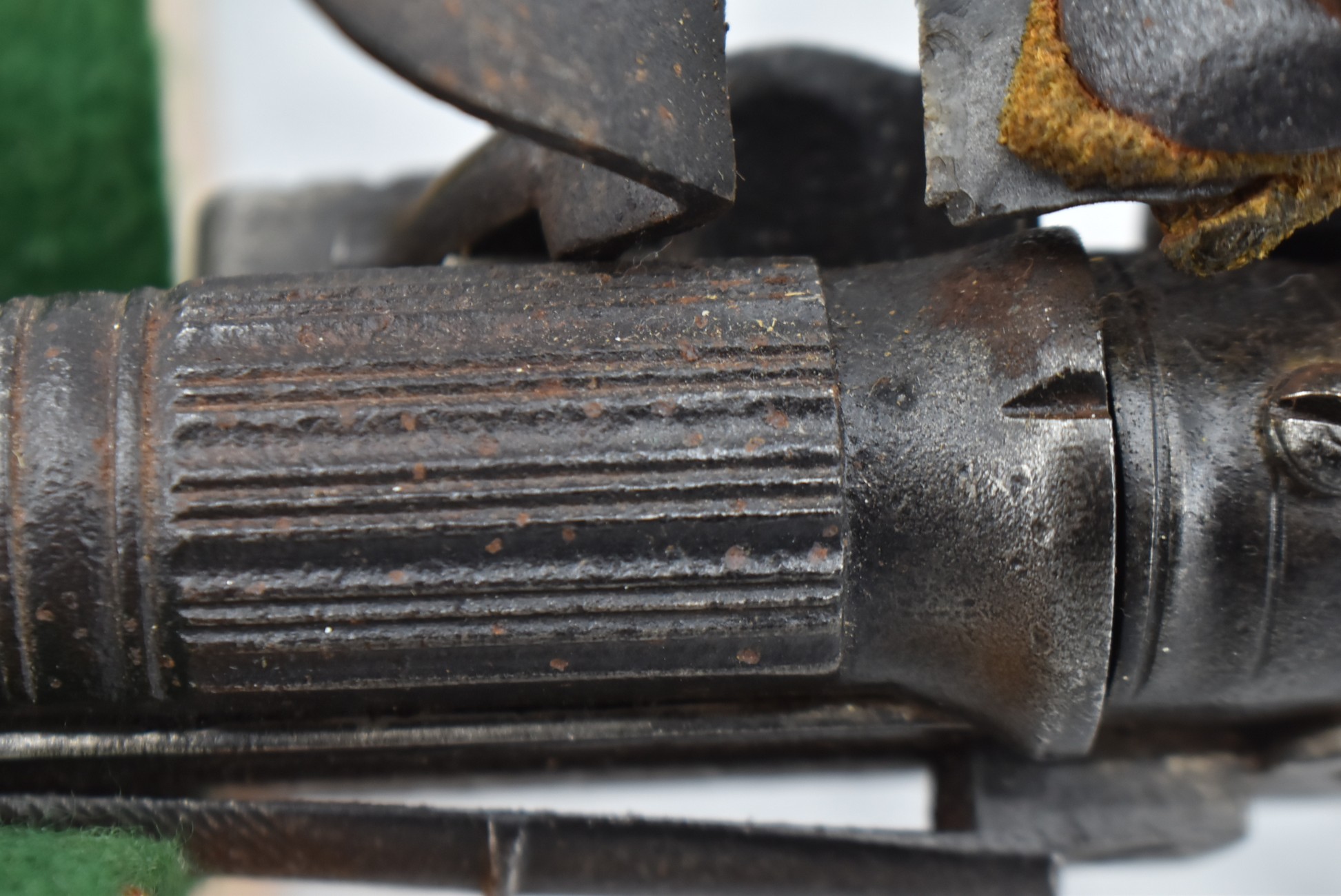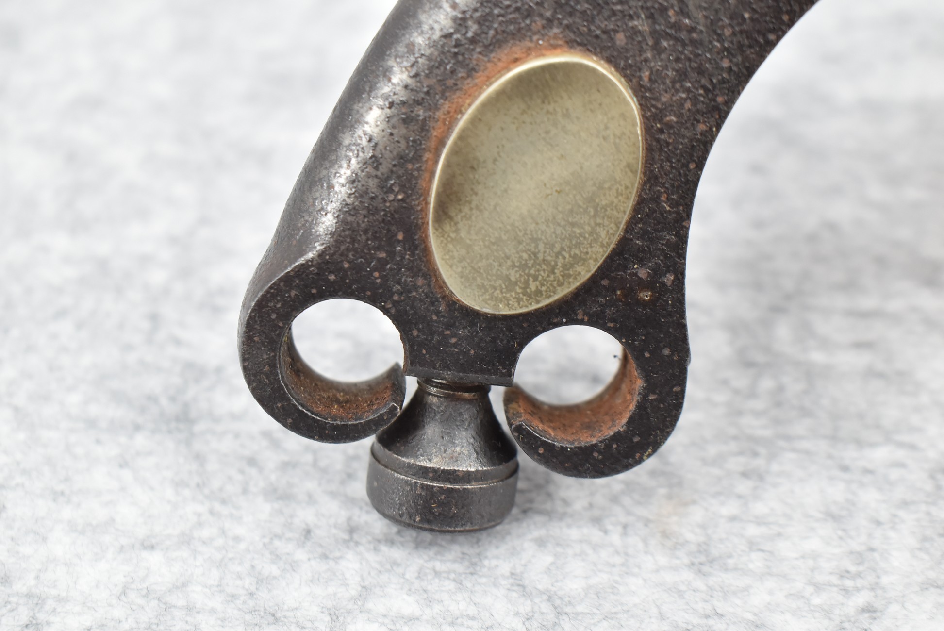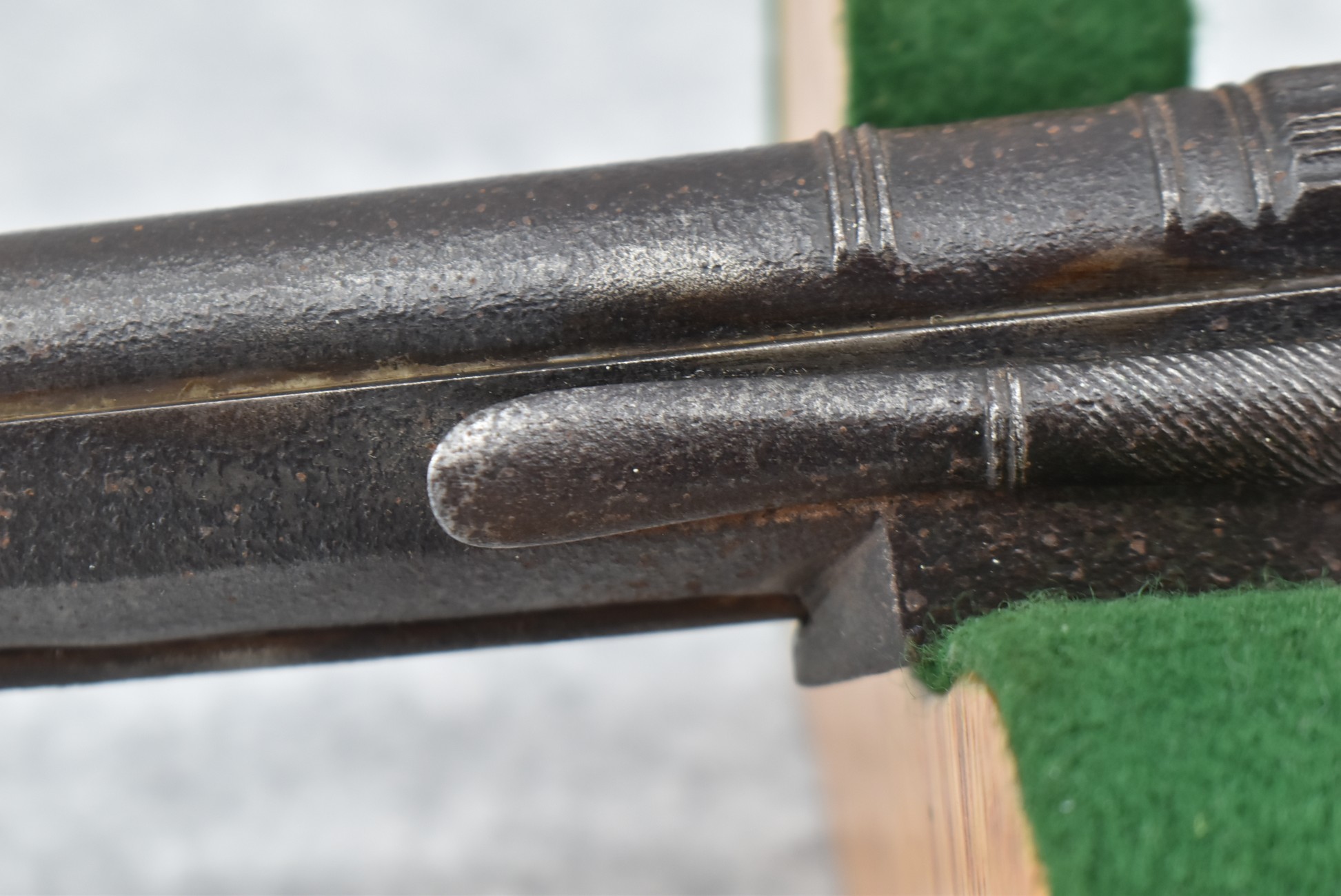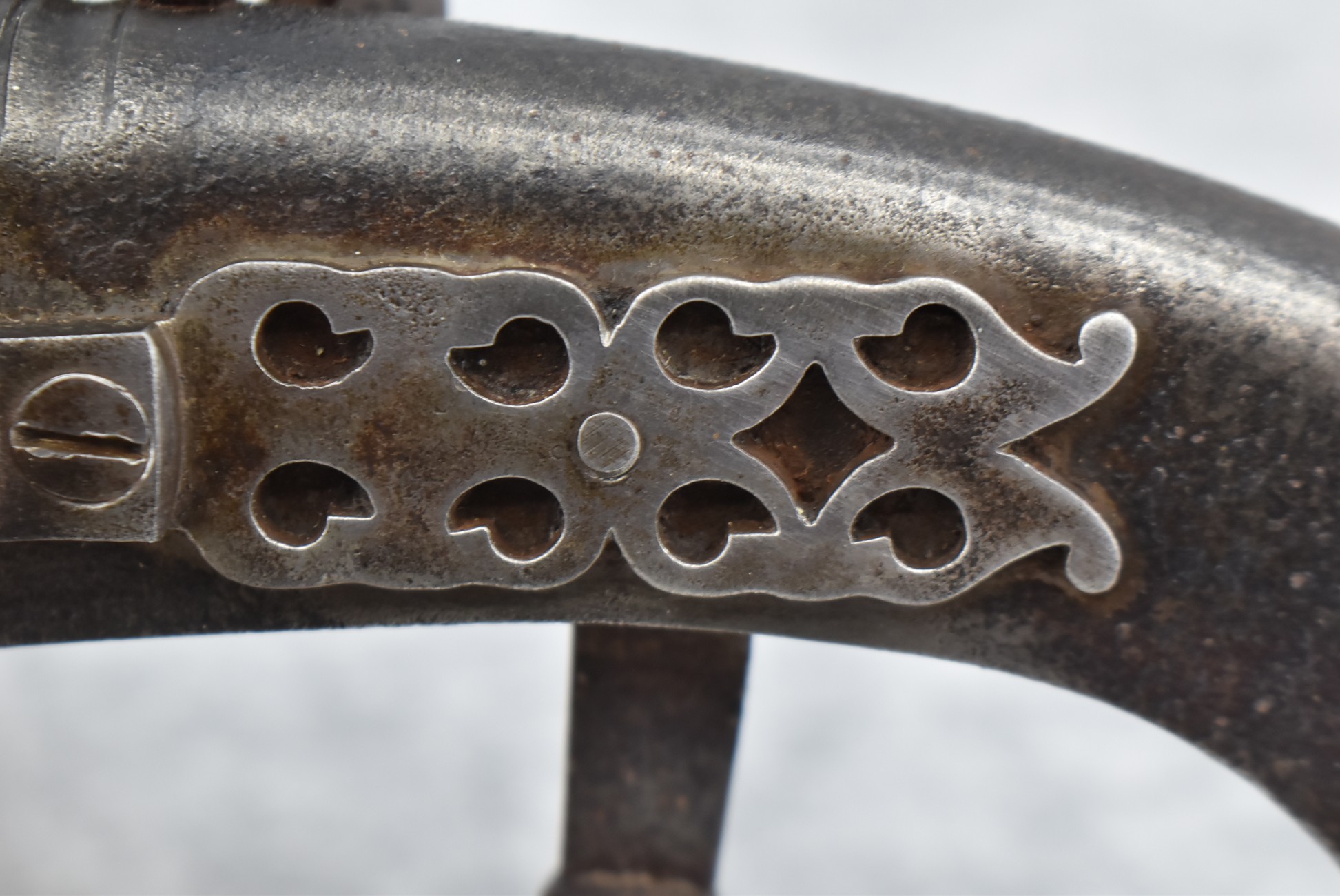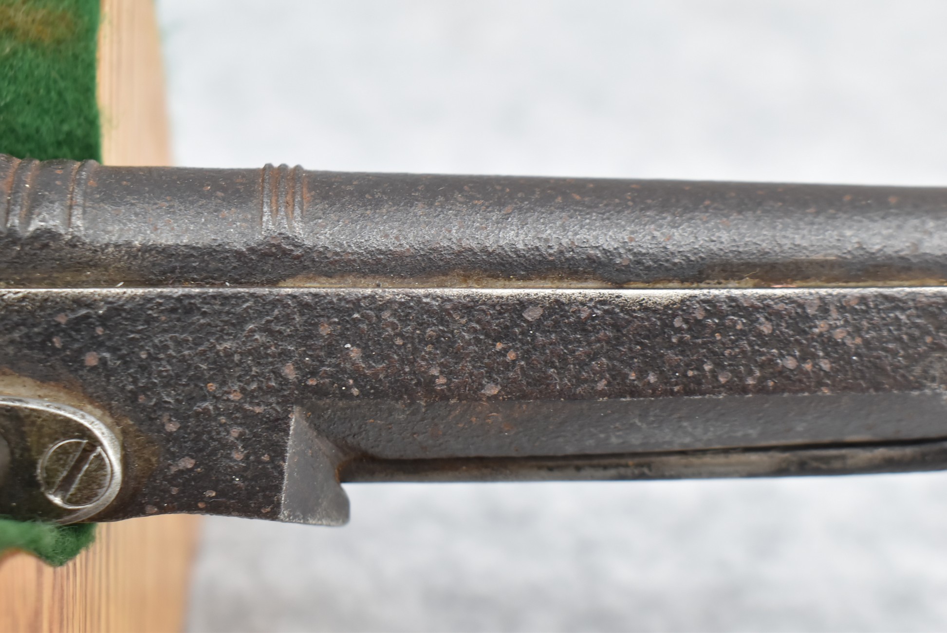 292. Unknown Mfg. – Scottish 50 Cal. Flintlock Black Powder Pistol – w/7 ½” Barrel w/Flared Muzzle – Gray Finish – w/Bare Metal Pistol Grip Frame – w/Ram Rod – Has Belt Clip on Left Side of Gun