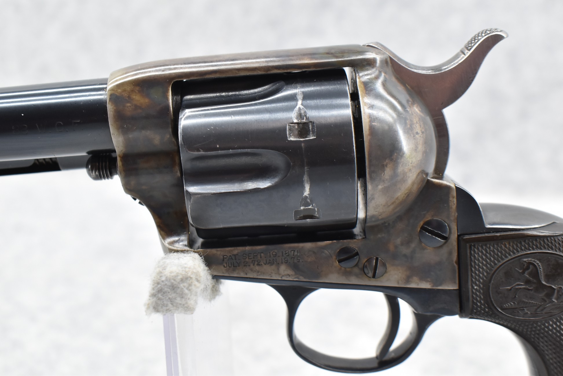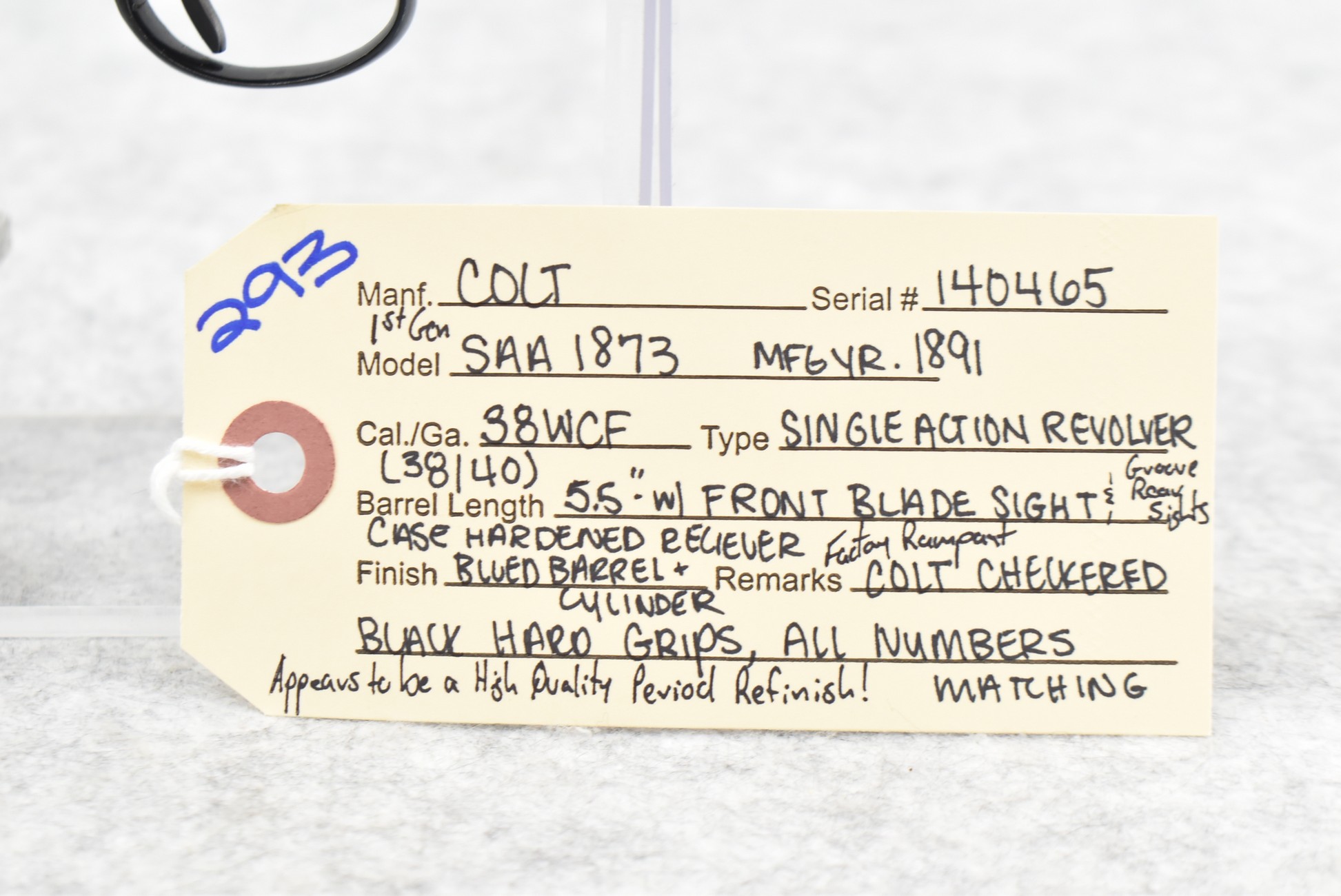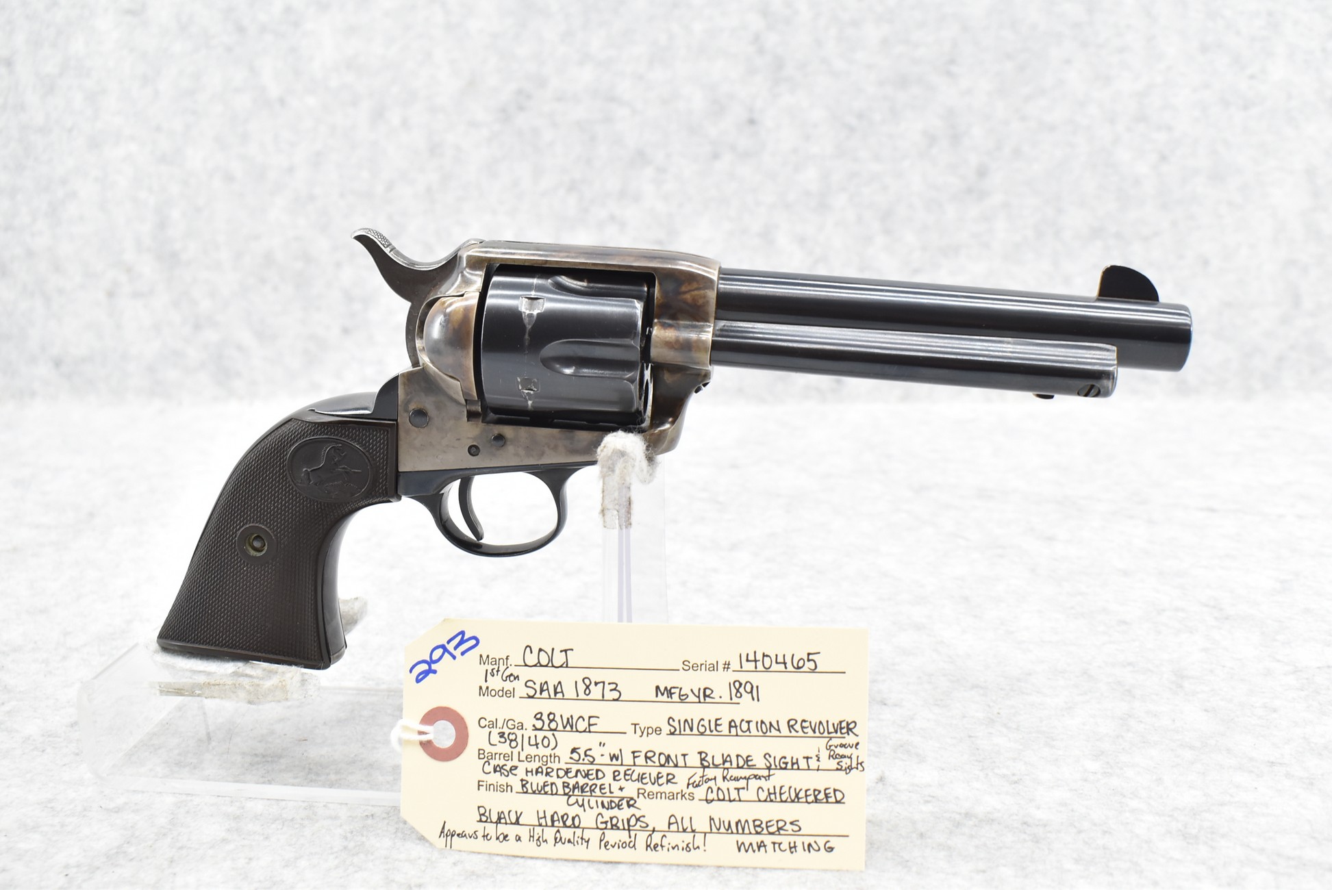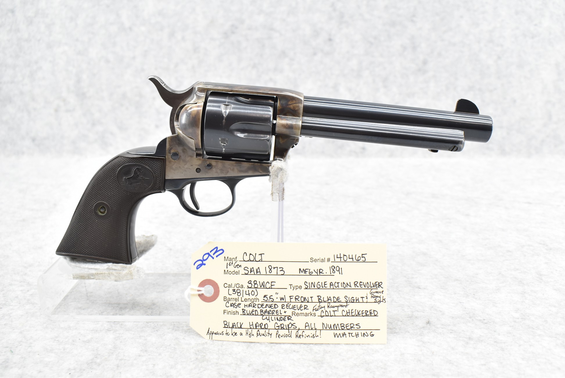 293. Colt – Mod. Single Action Army 1873 1st Gen – 38-40 WCF Cal. Single Action Revolver – w/5½” Barrel w/Blade Front and Rear Groove Sights – Blued Finish w/Case Hardened Receiver – w/Factory Rampant Colt Checkered Black Hard Grips – All Numbers are Matching – Manufactured 1891 – Appears to be a High-Quality Period Refinish!