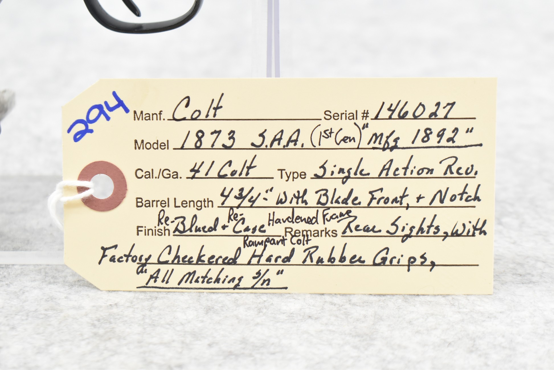 294. Colt – Mod. 1873 Single Action Army 1st Gen – 41 Colt Cal. Single Action Revolver – w/4¾” Barrel w/Blade Front and Rear Notch Sights – Re-Blued Finish w/Re-Case Hardened Frame – w/Factory Checkered Hard Rubber Grips – All Matching Numbered – Manufactured 1892