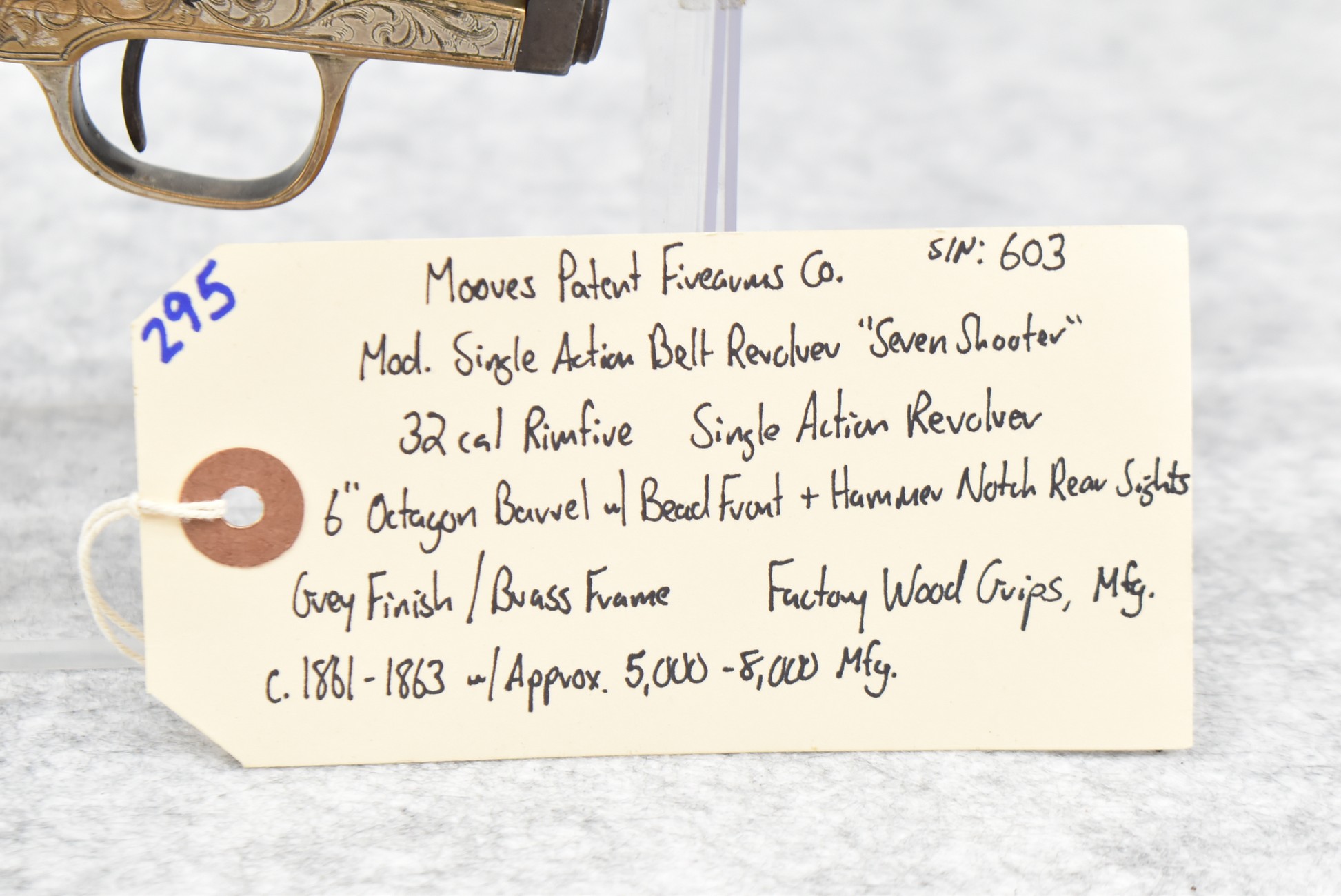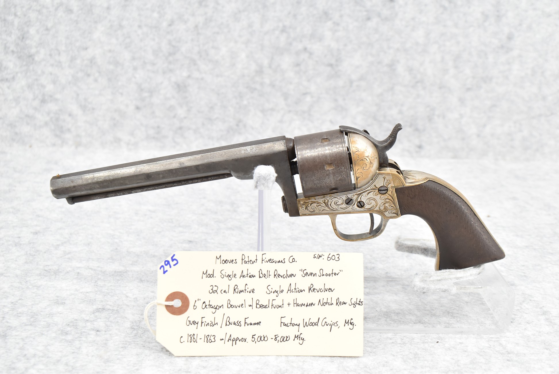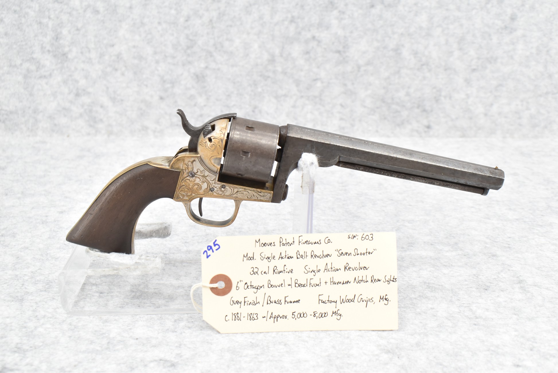 295. Moores Patent Firearms Co. – Mod. Single Action Belt Revolver “Seven Shooter” – 32 Cal. RF Single Action Revolver – w/6” Octagon Barrel w/Bead Front & Hammer Notch Rear Sights – Gray Finish w/Brass Frame – w/Factory Wood Grips – Approx. 5,000-8,000 Mfg. Between 1861-1863