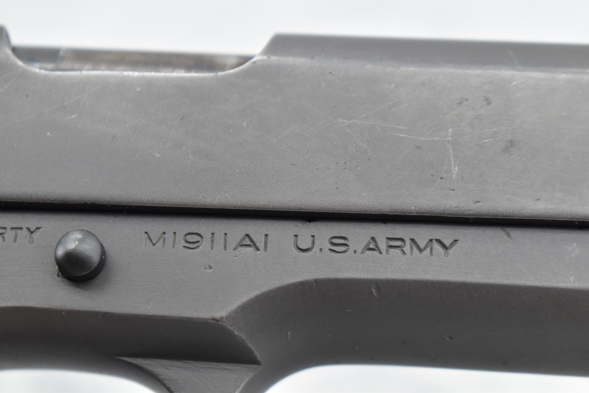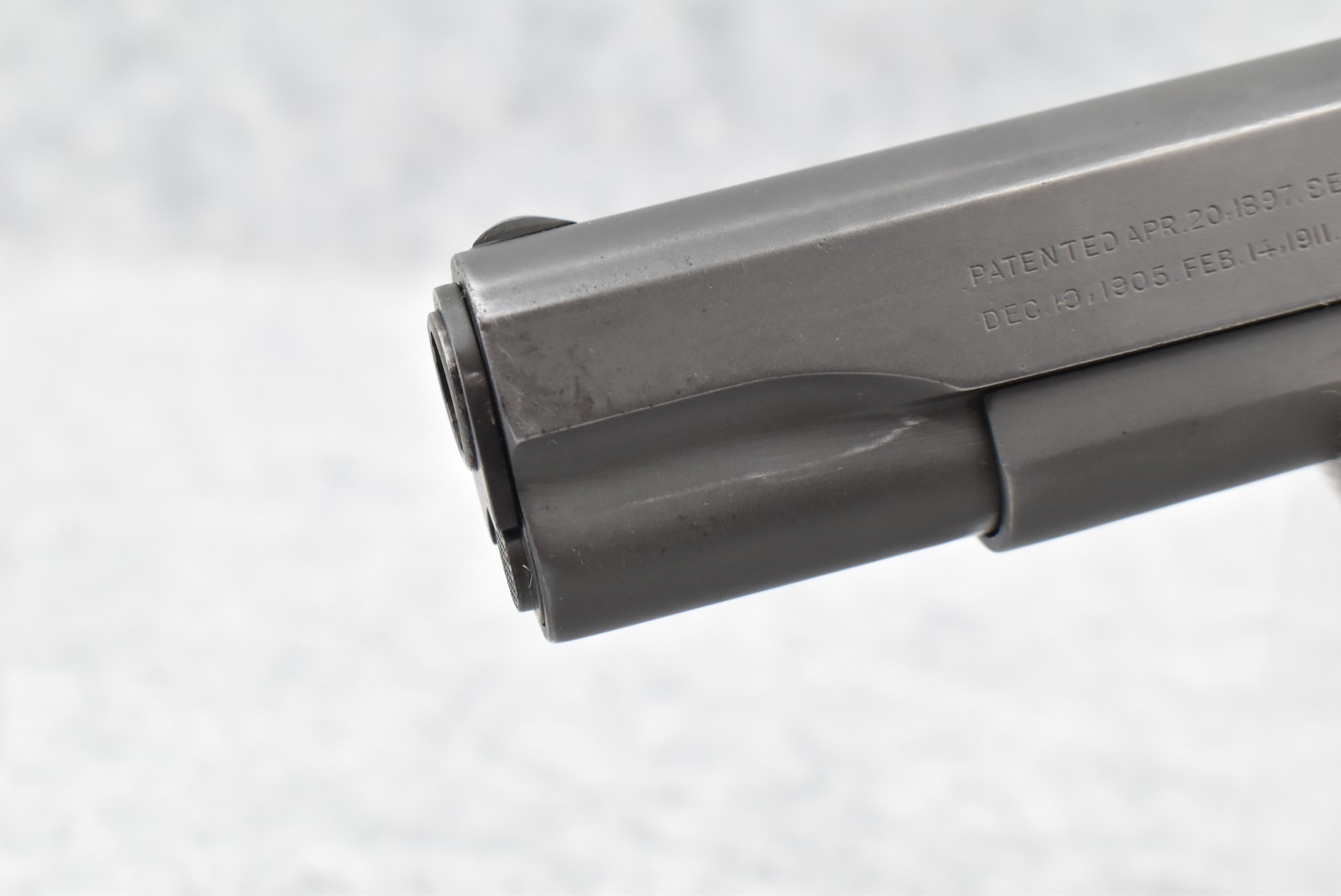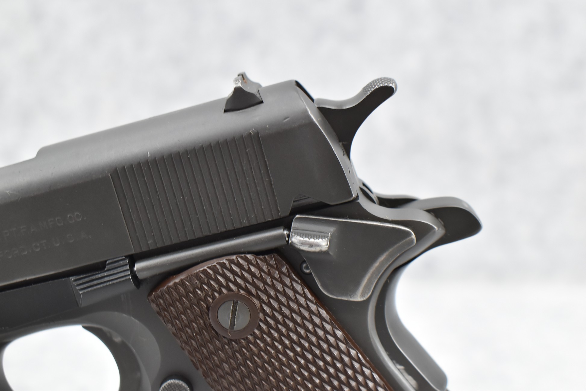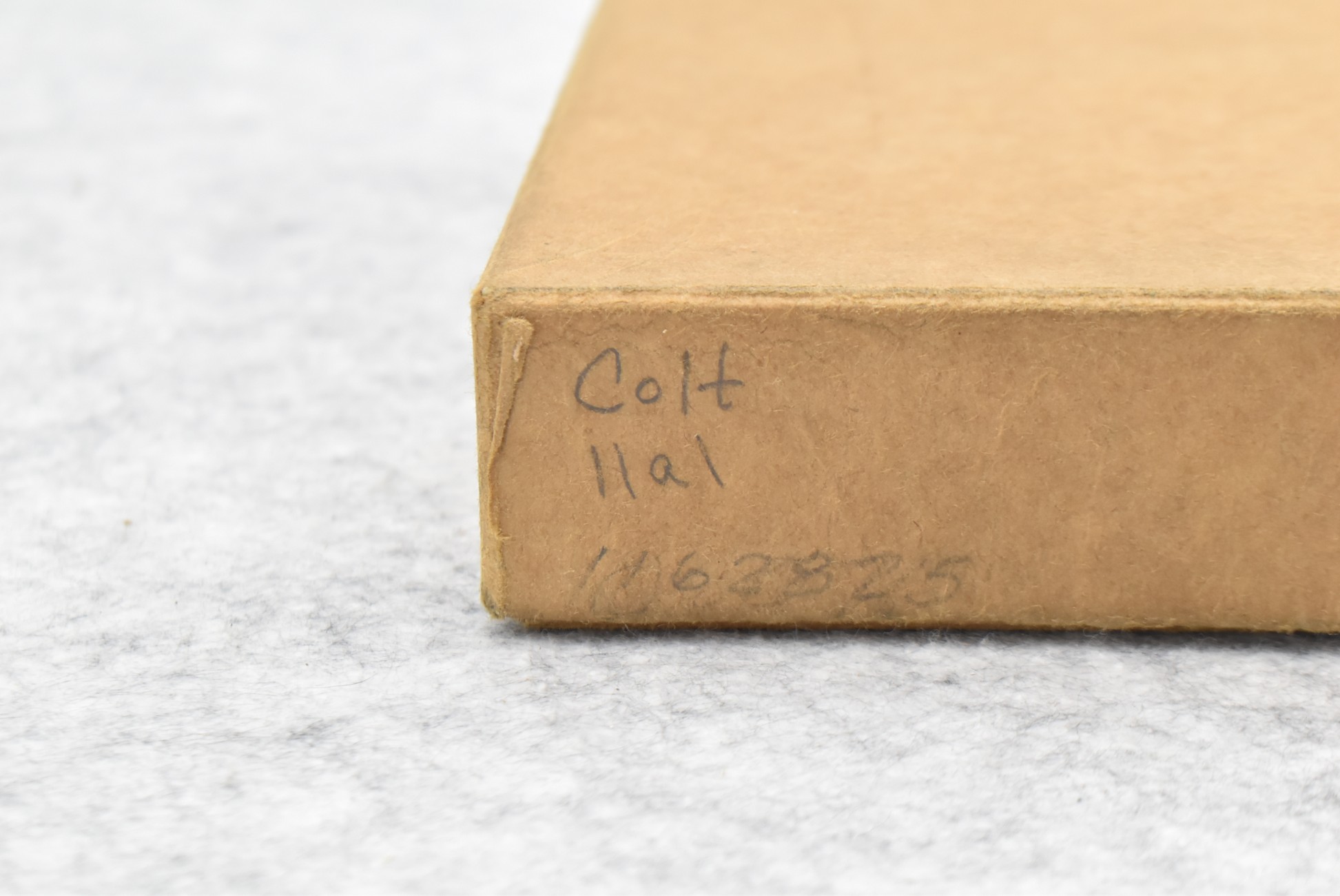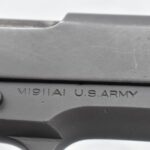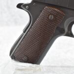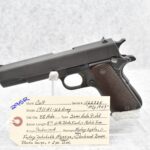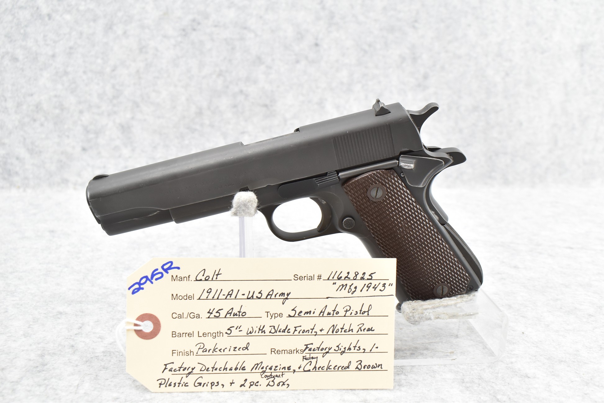 295R. Colt – Mod. 1911 A1 U.S. Army – 45 Auto Cal. Semi-Auto Pistol – w/5” Barrel w/Blade Front and Rear Notch Sights – Parkerized Finish – w/Factory Checkered Brown Plastic Grips – w/1 Factory Detachable Magazine – w/2-Piece Contract Box – Manufactured 1943
