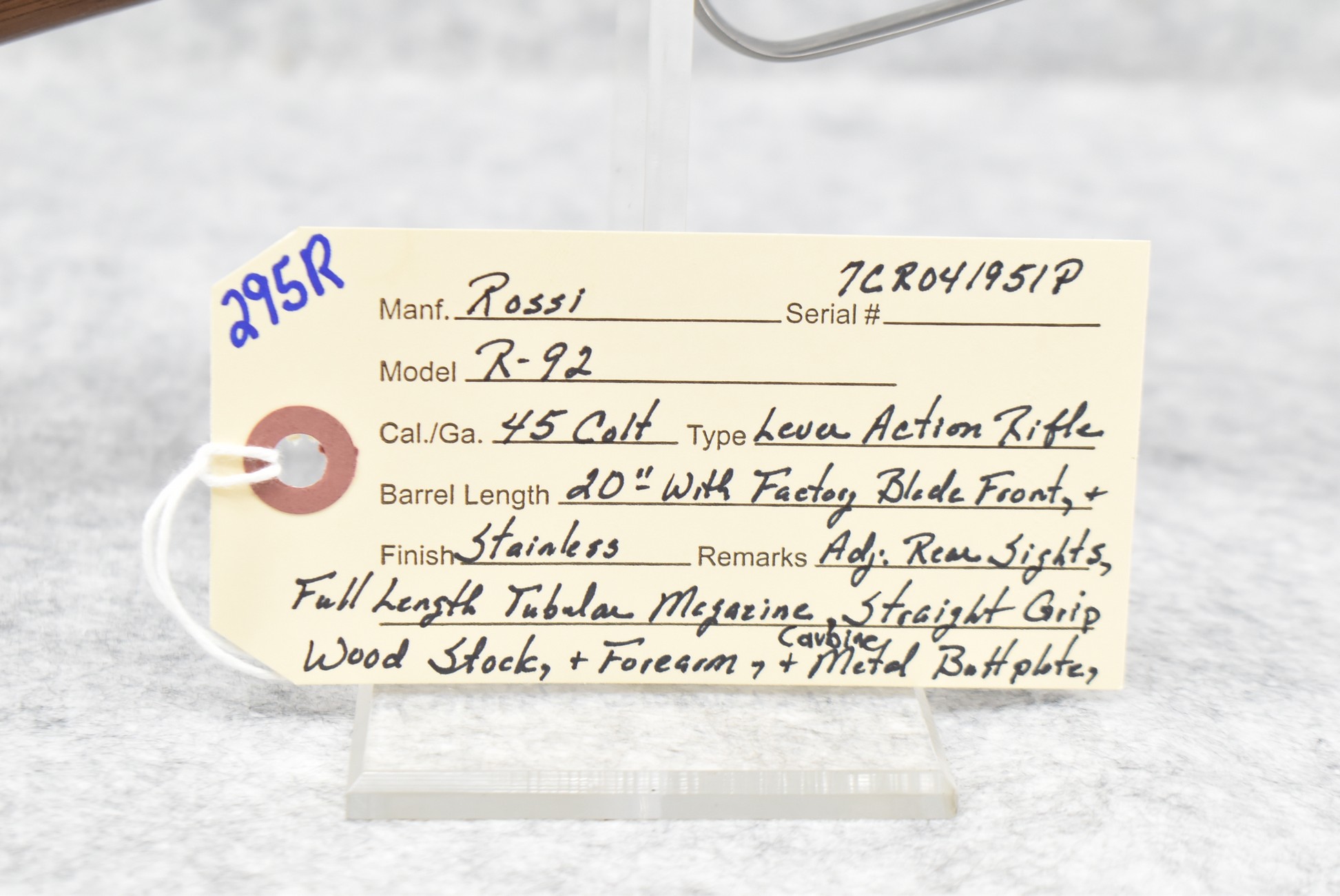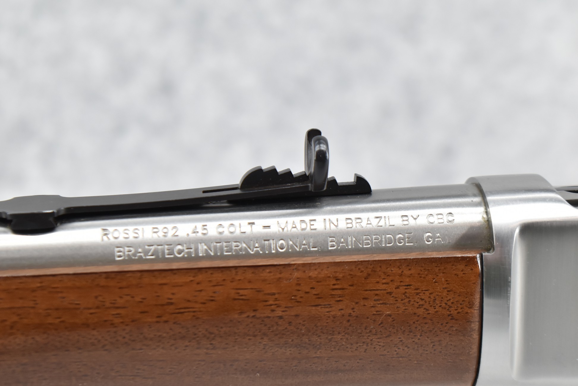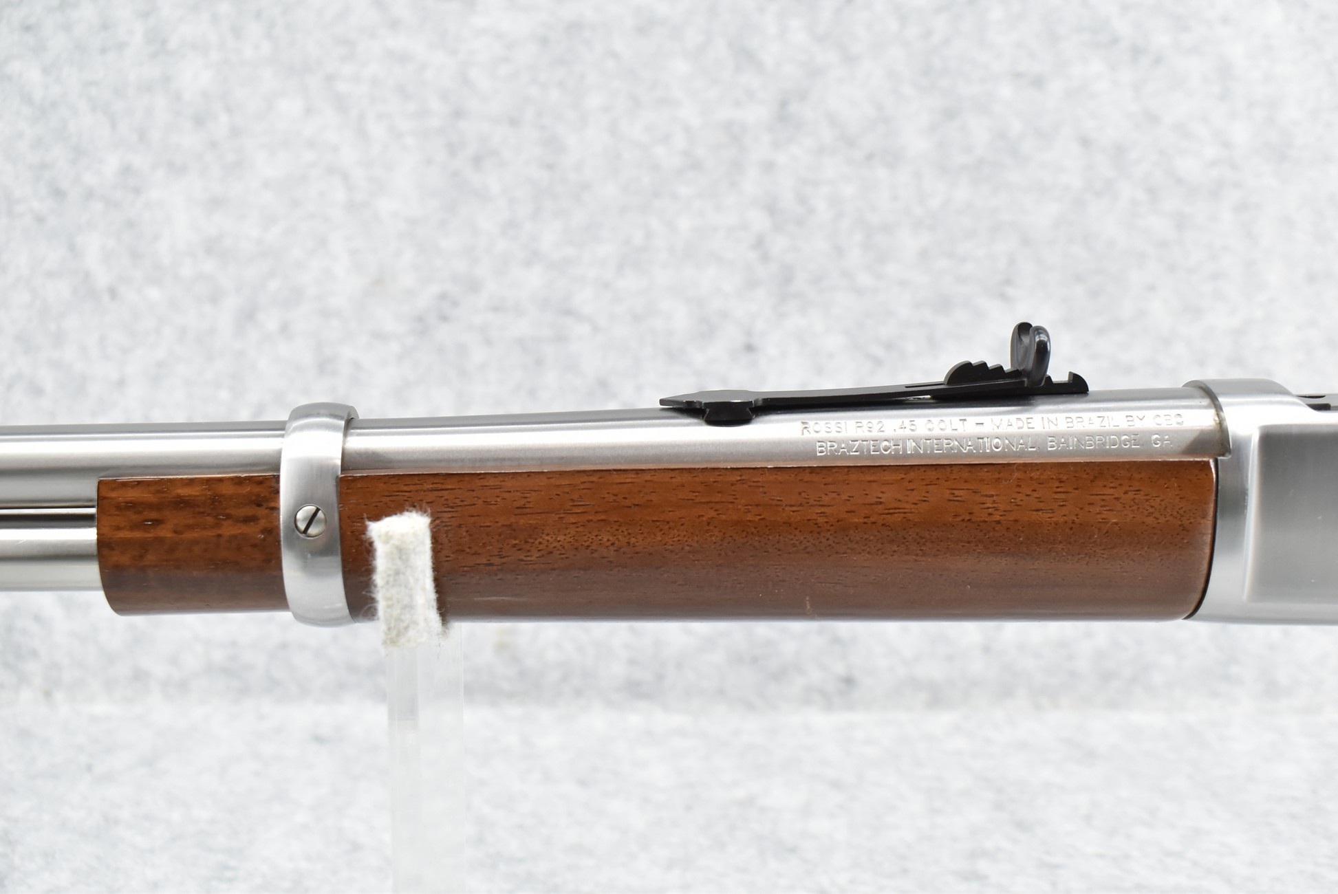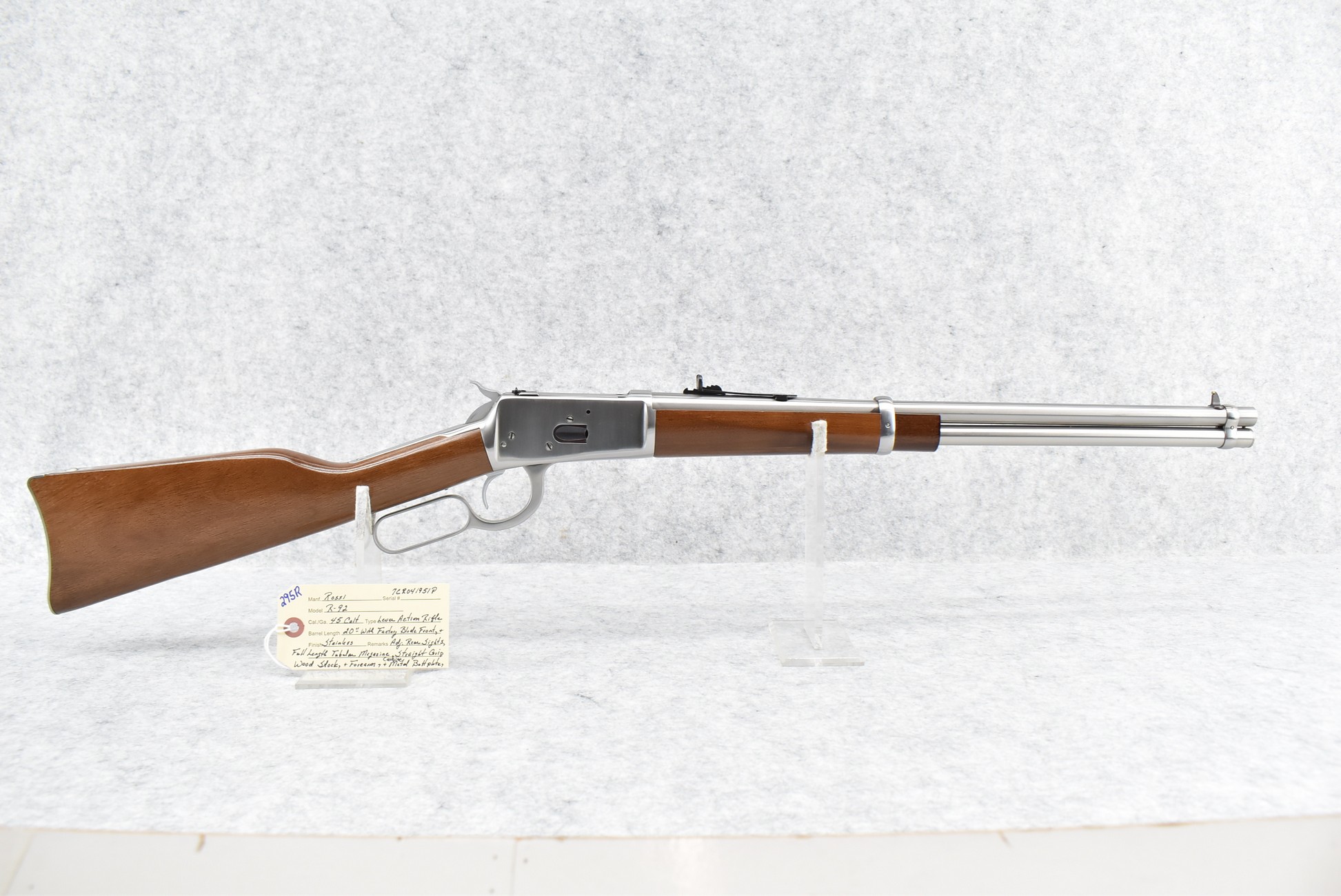 295R. Rossi – Mod. R-92 – 45 Colt Cal. Lever Action Rifle – w/20” Barrel w/Factory Blade Front & Adj. Rear Sights w/Full Length Tubular Magazine – Bright Stainless Finish – w/Straight Grip Wood Stocks w/Carbine Metal Butt Plate