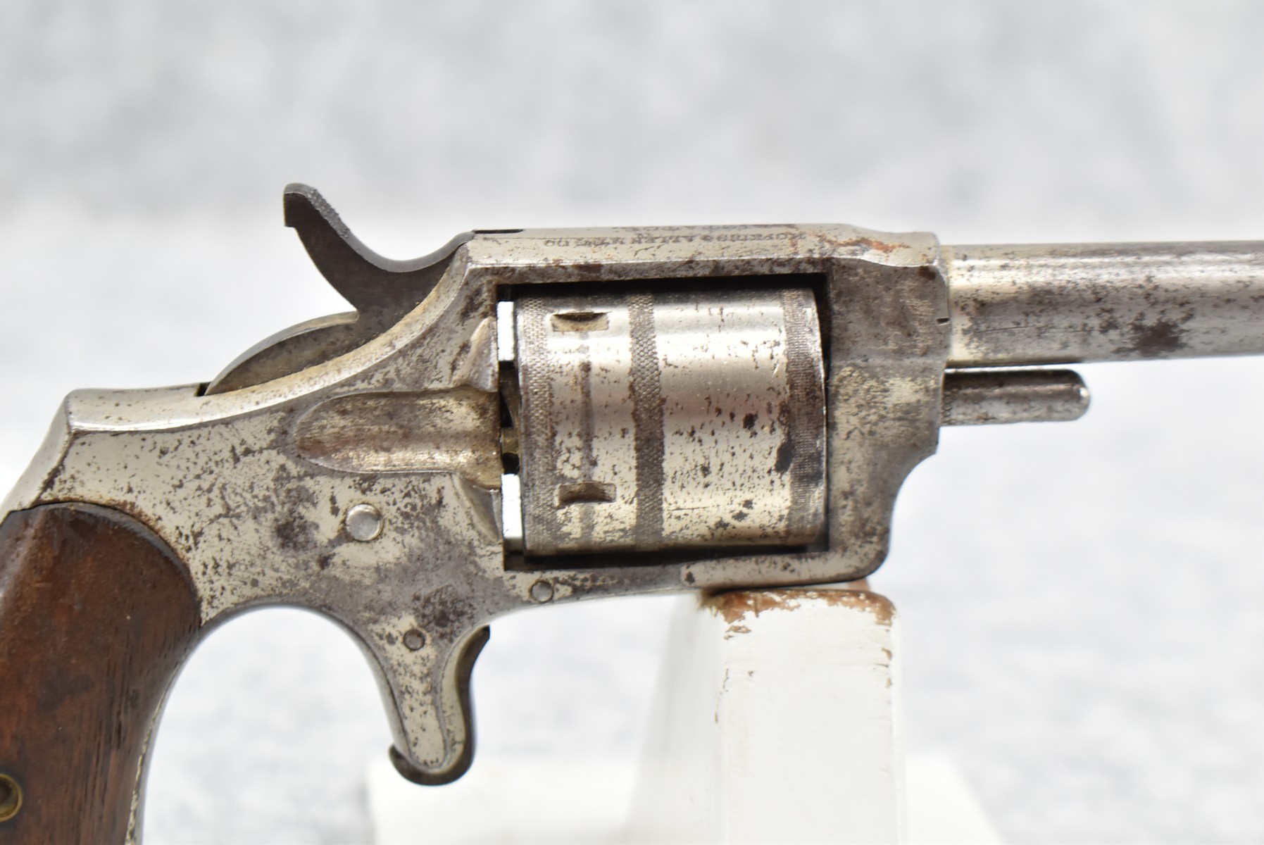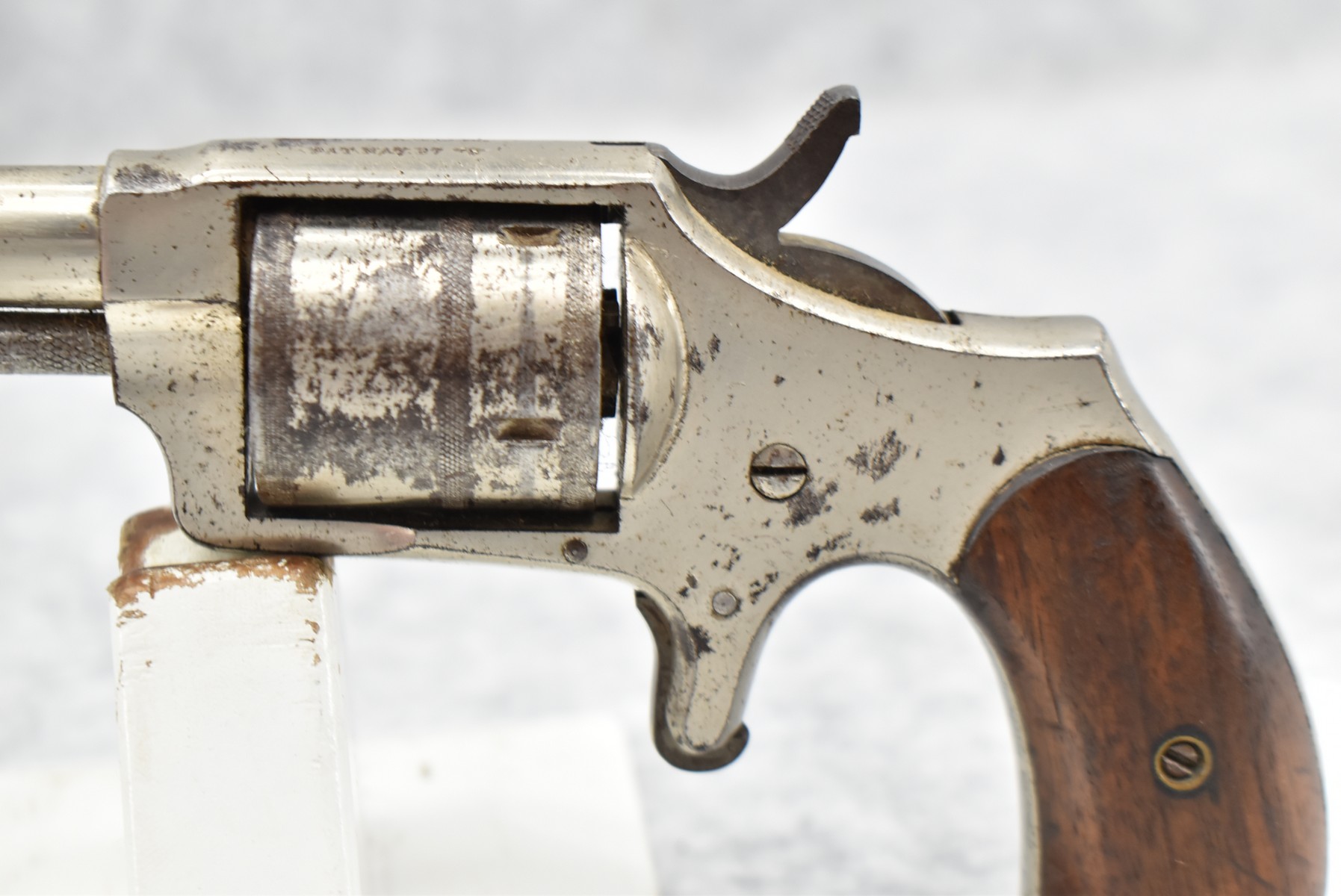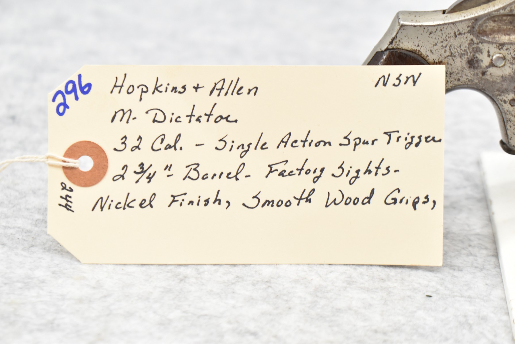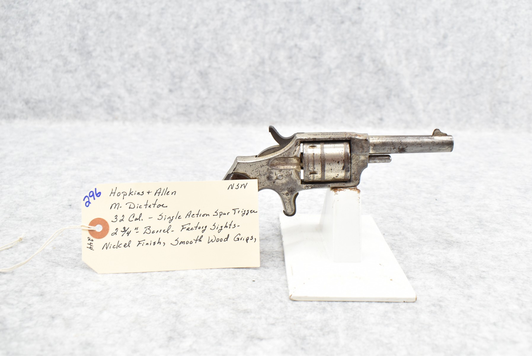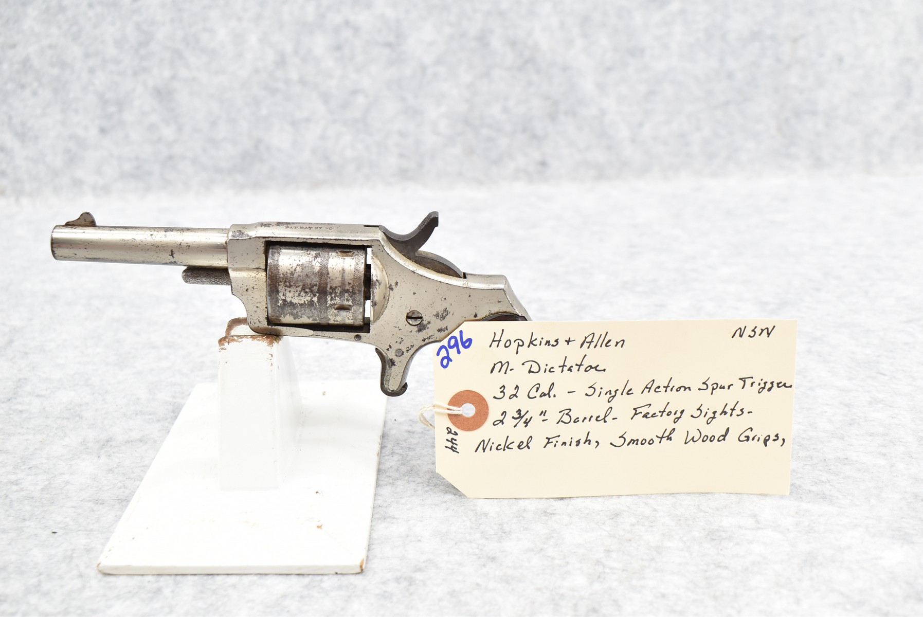 296. Hopkins & Allen – Mod. Dictator – 32 Rim. Cal. Single Action Spur Trigger Revolver – w/2 ¾” Barrel w/Factory Sights – Nickel Finish – w/Smooth Wood Grips