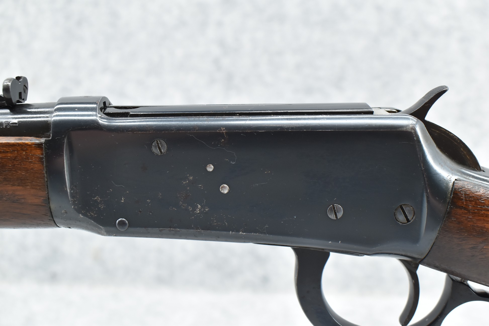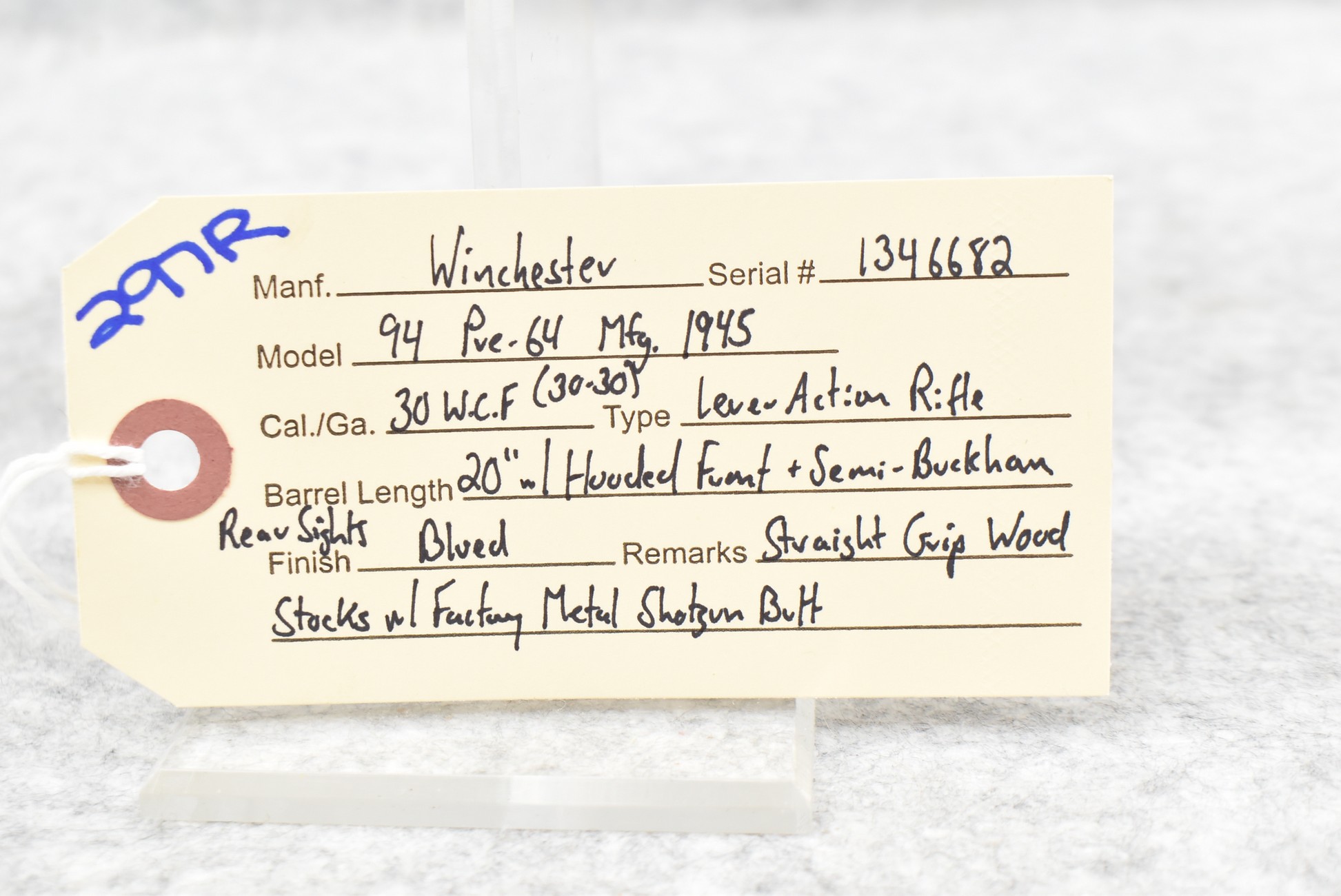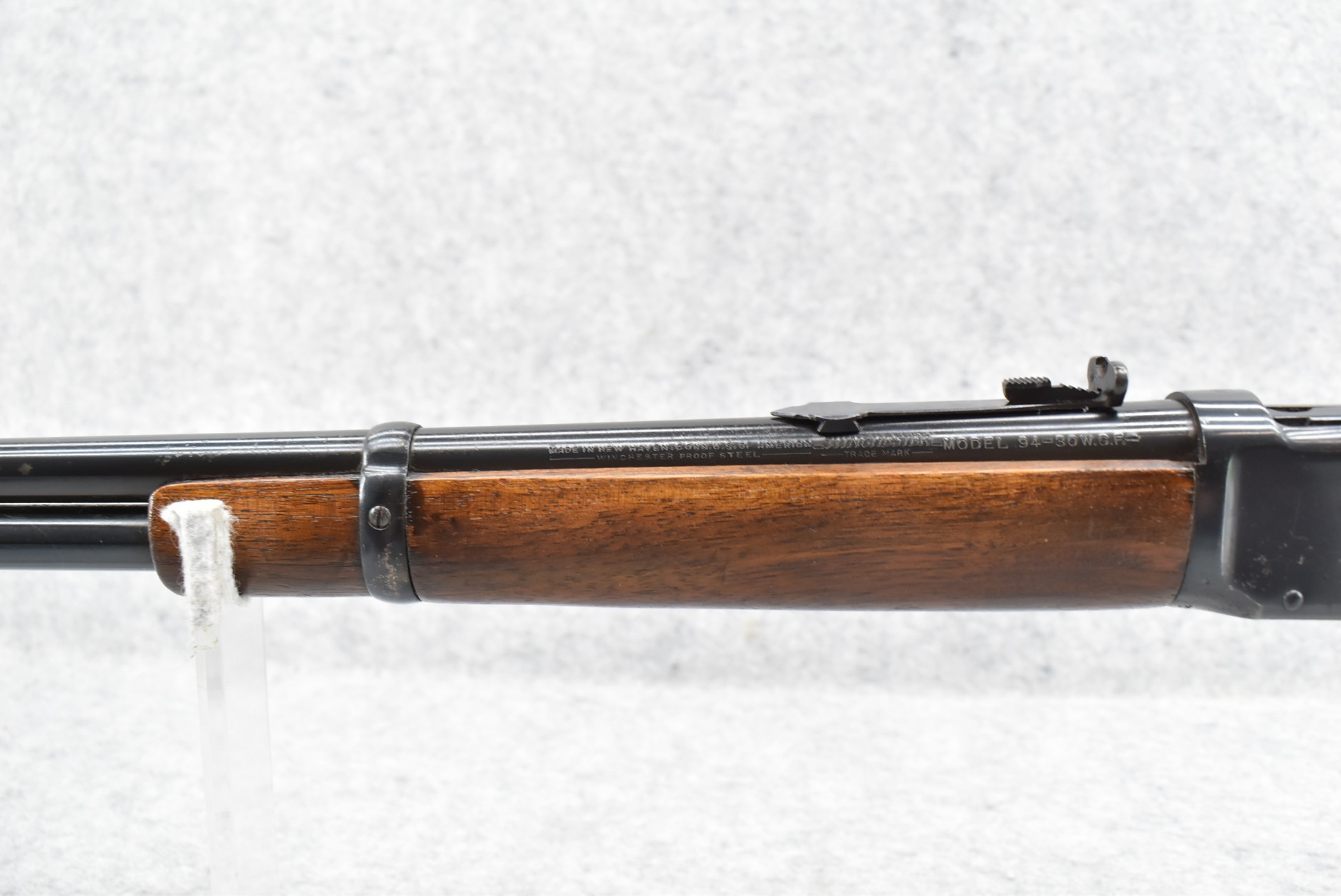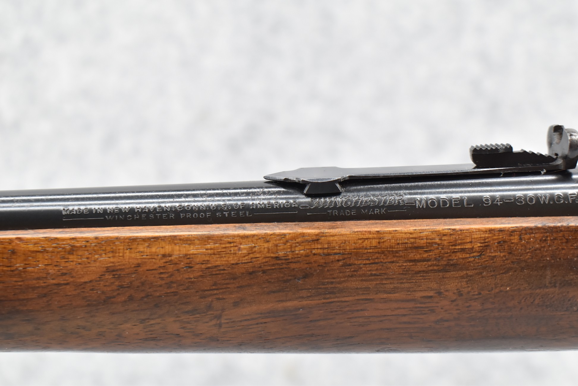 297R. Winchester – Mod. 94 “Pre-64” – 30 WCF Cal. Lever Action Rifle – w/20” Barrel w/Hooded Front and Rear Semi-Buckhorn Sights – Blued Finish – w/Straight Grip Wood Stocks w/Factory Metal Butt Plate – Manufactured 1945