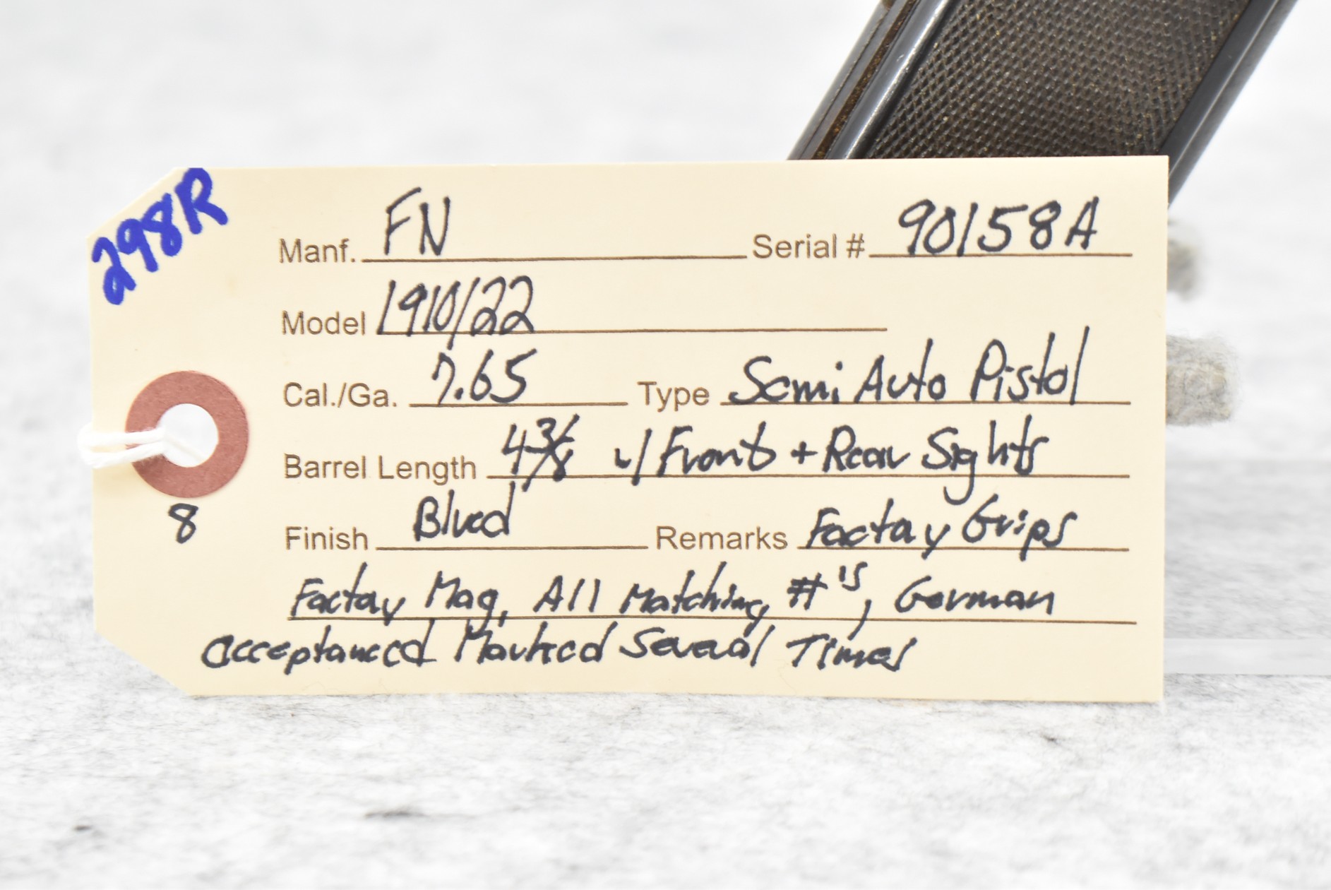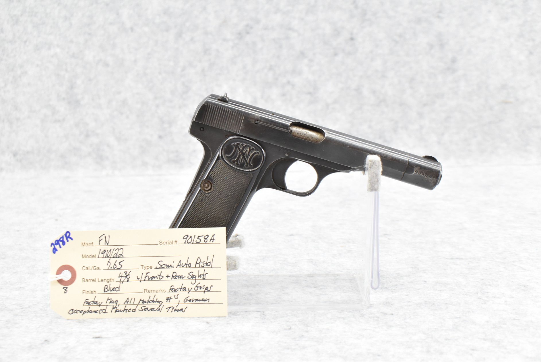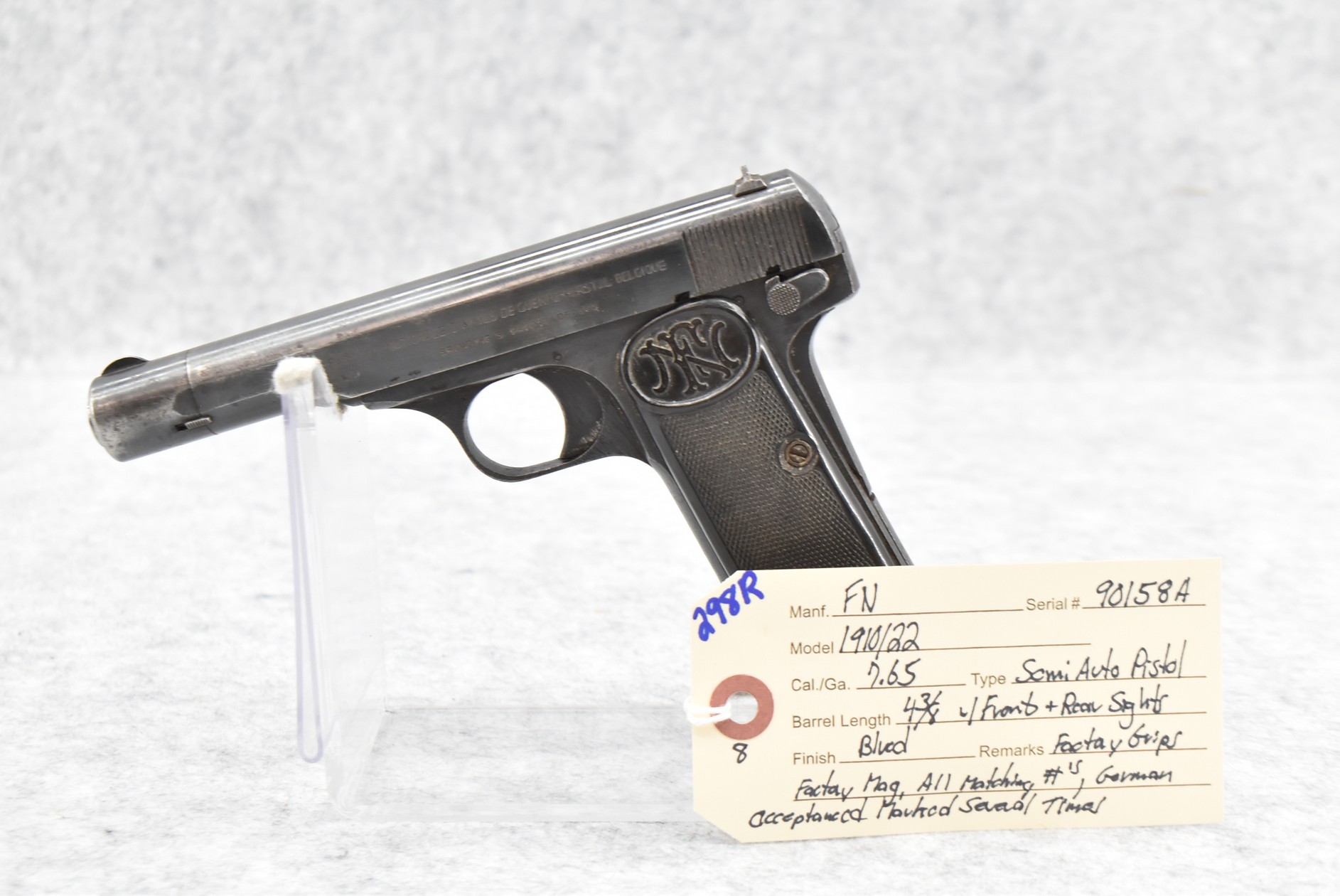 298R. FN – Mod. 1910/22 – 7.65 Cal. Semi-Auto Pistol – w/4 3/8” Barrel w/Front & Rear Sights – Blued Finish – w/Factory Grips – w/Factory Mag – All Matching Numbers – German Acceptance Marked Several Times