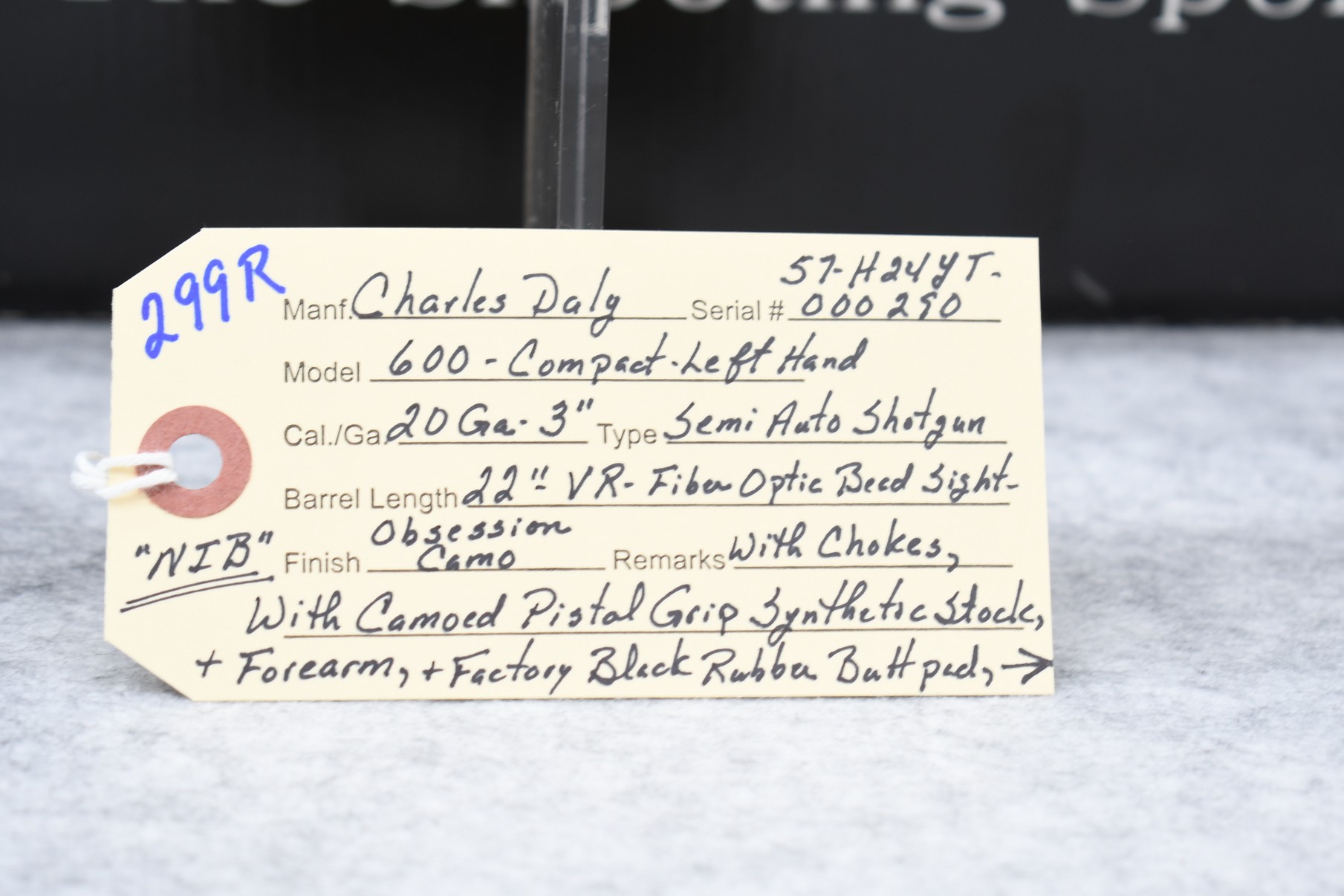 299R. Charles Daly – Mod. 600 Compact (Left Hand) – 20ga. 3” Semi-Auto Shotgun – w/22” Vent-Rib Barrel w/Fiber Optic Bead Sight w/Chokes – Obsession Camo Full Coverage – w/Camoed Pistol Grip Synthetic Stocks w/Factory Butt Pad – New w/Factory Box, Chokes & Manual