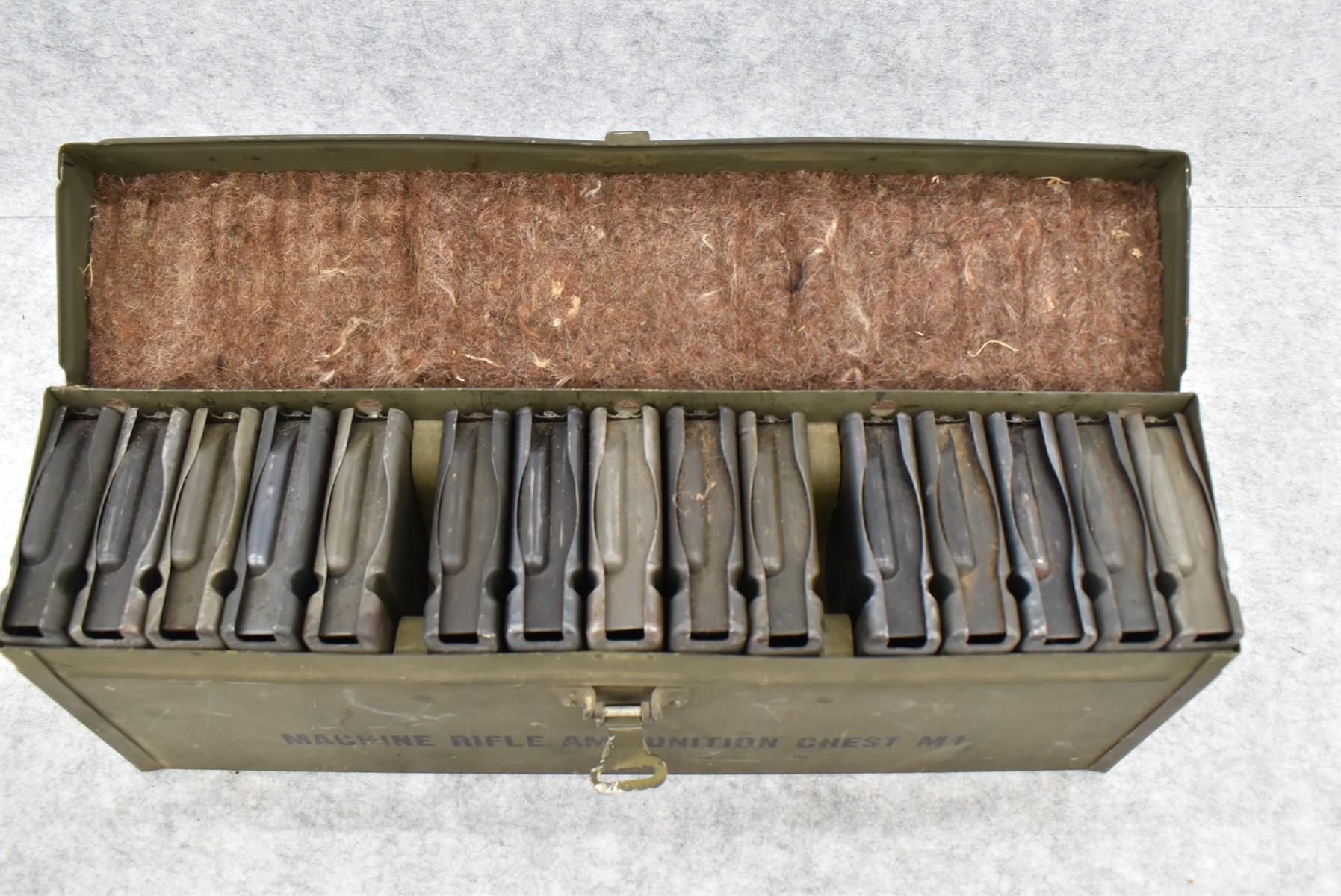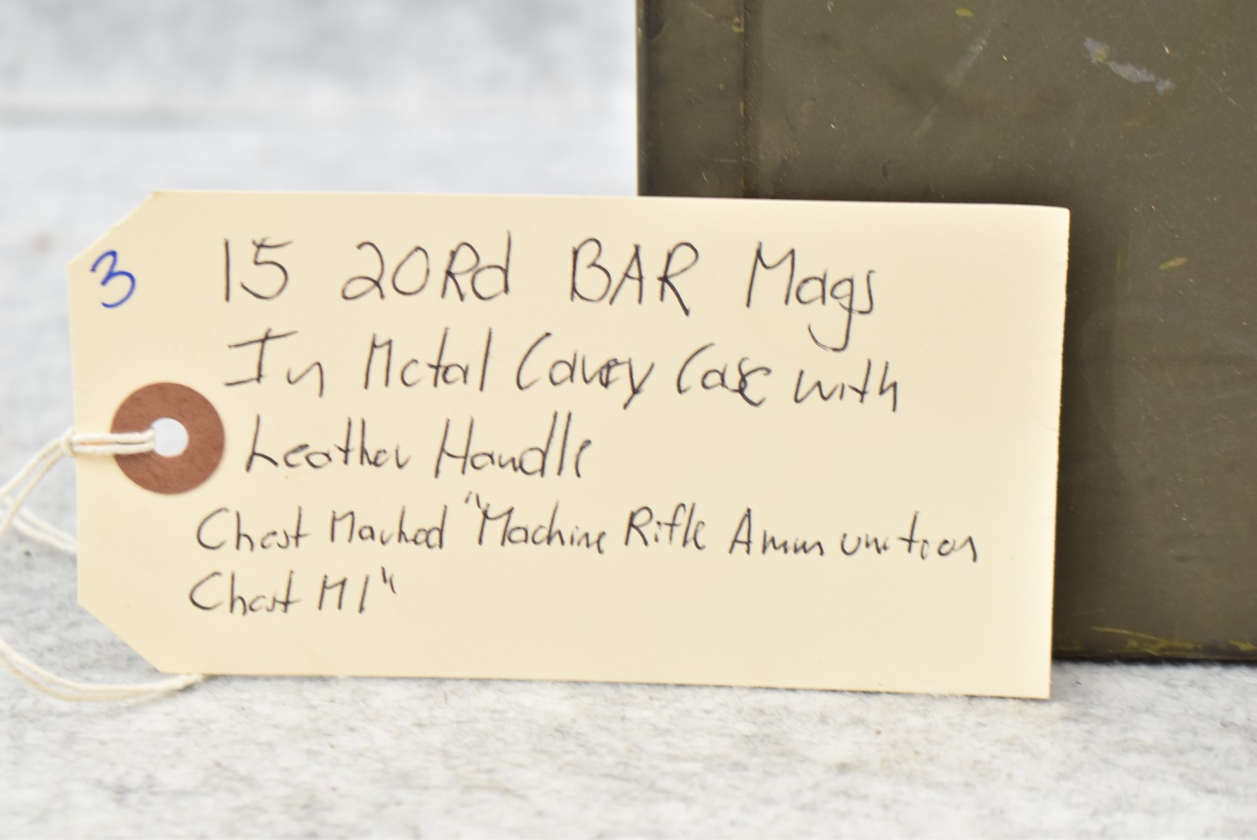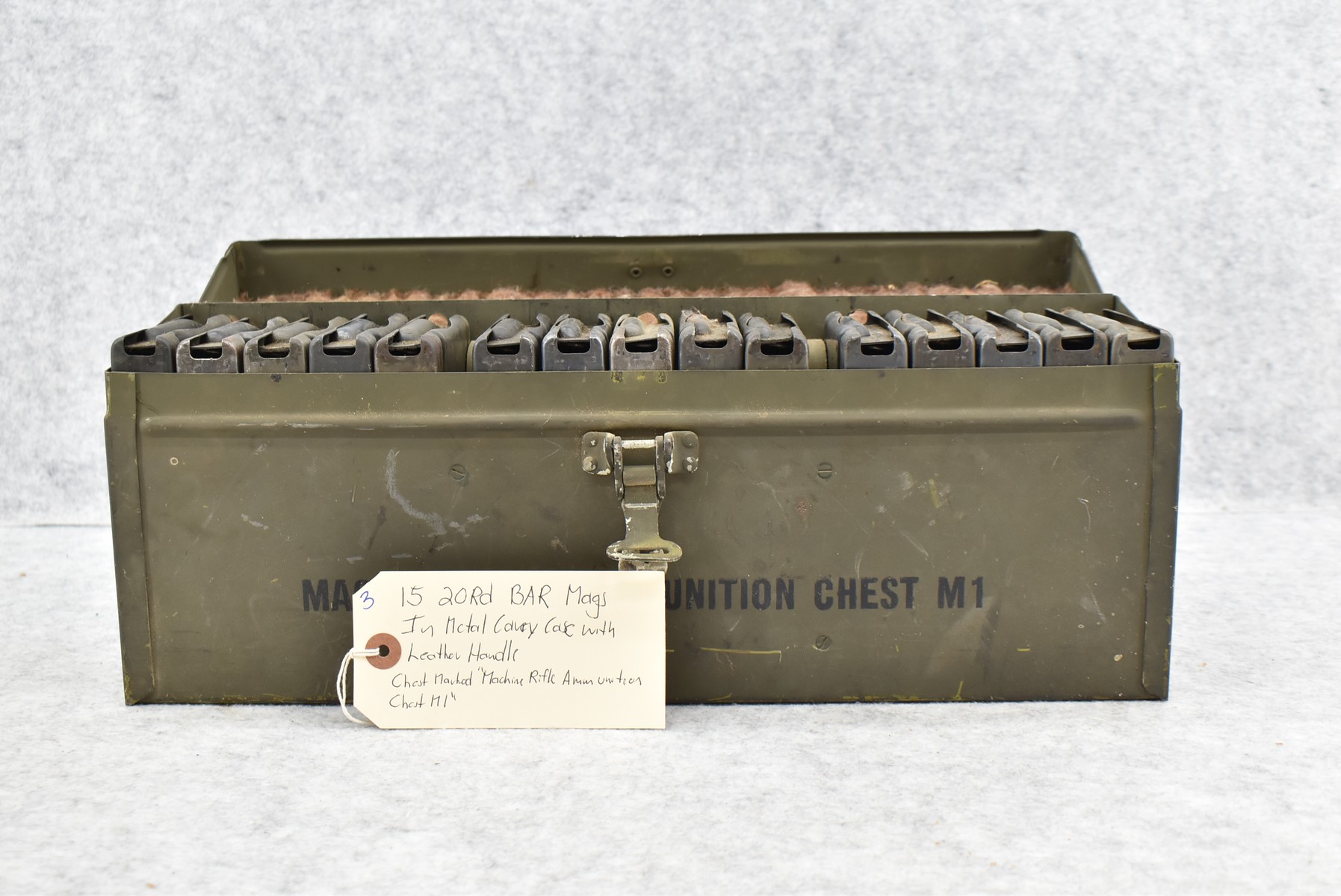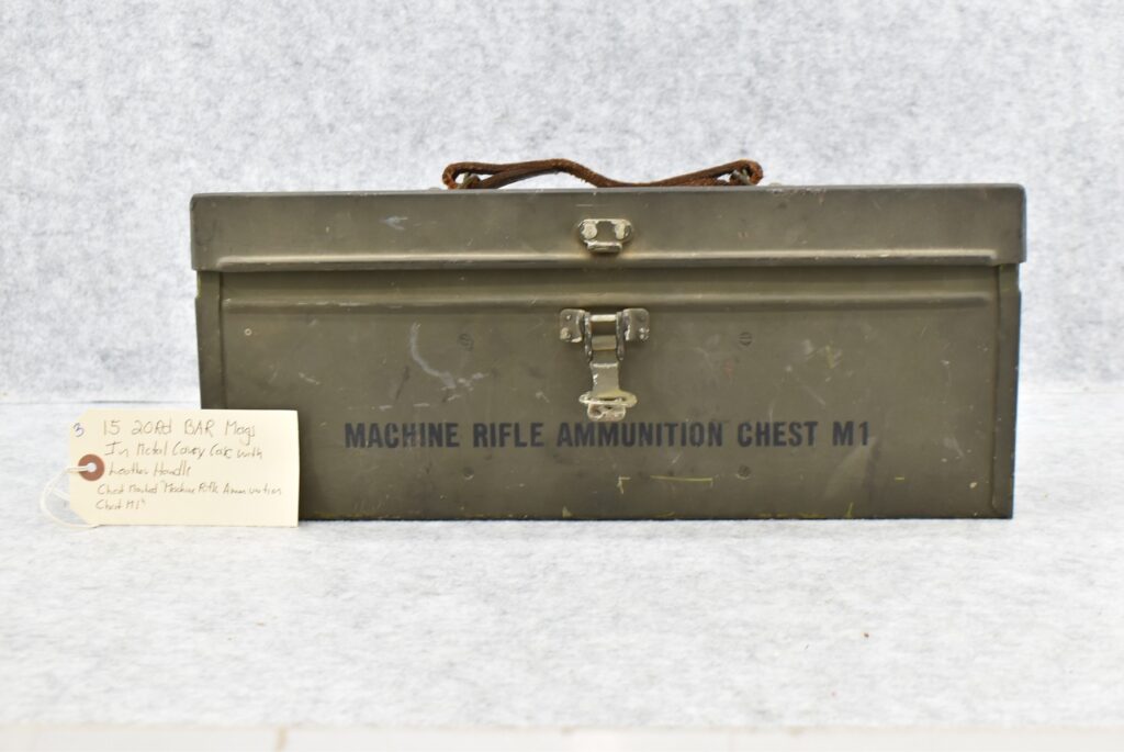 3. Fifteen 20Rd BAR Mags in Metal Carry Case w/Leather Handle – Chest Marked “Machine Rifle Ammunition Chest M1”