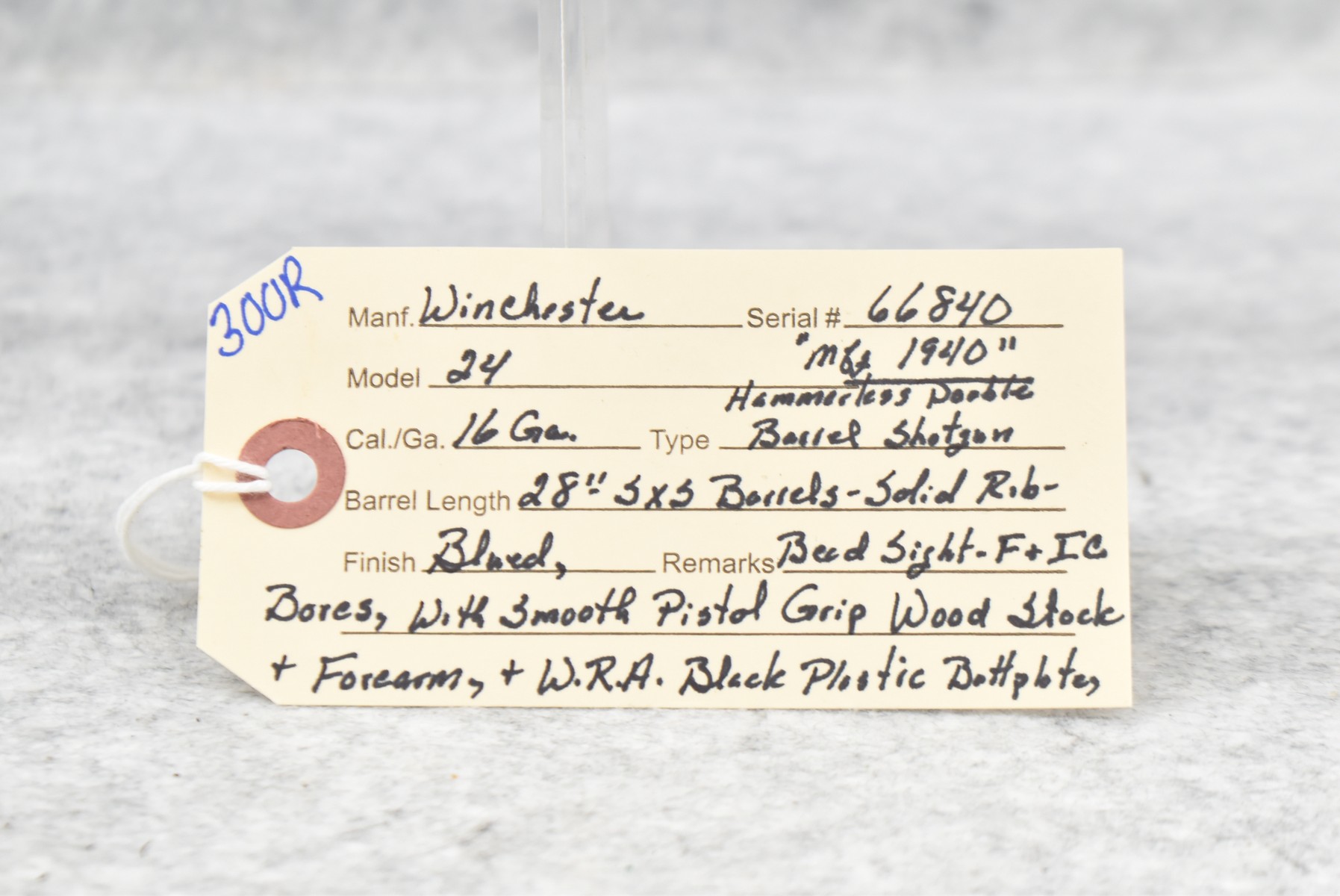 300R. Winchester – Mod. 24 – 16ga. Hammerless Double Barrel Shotgun – w/28” Full & IC Choked, Solid Rib Barrels w/Bead Sight – Blued Finish – w/Smooth Pistol Grip Wood Stocks w/Factory Butt Plate – Mfg. 1940