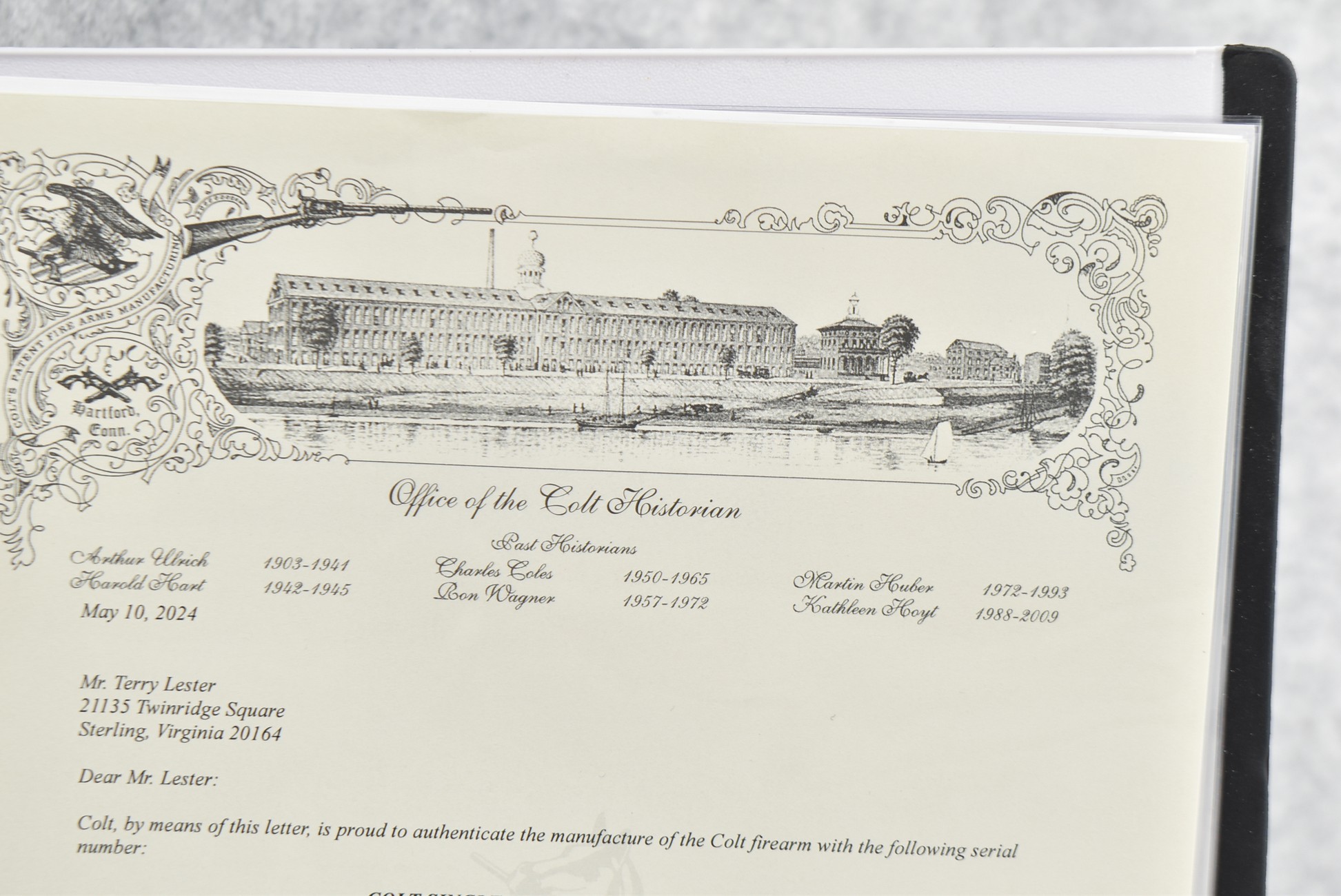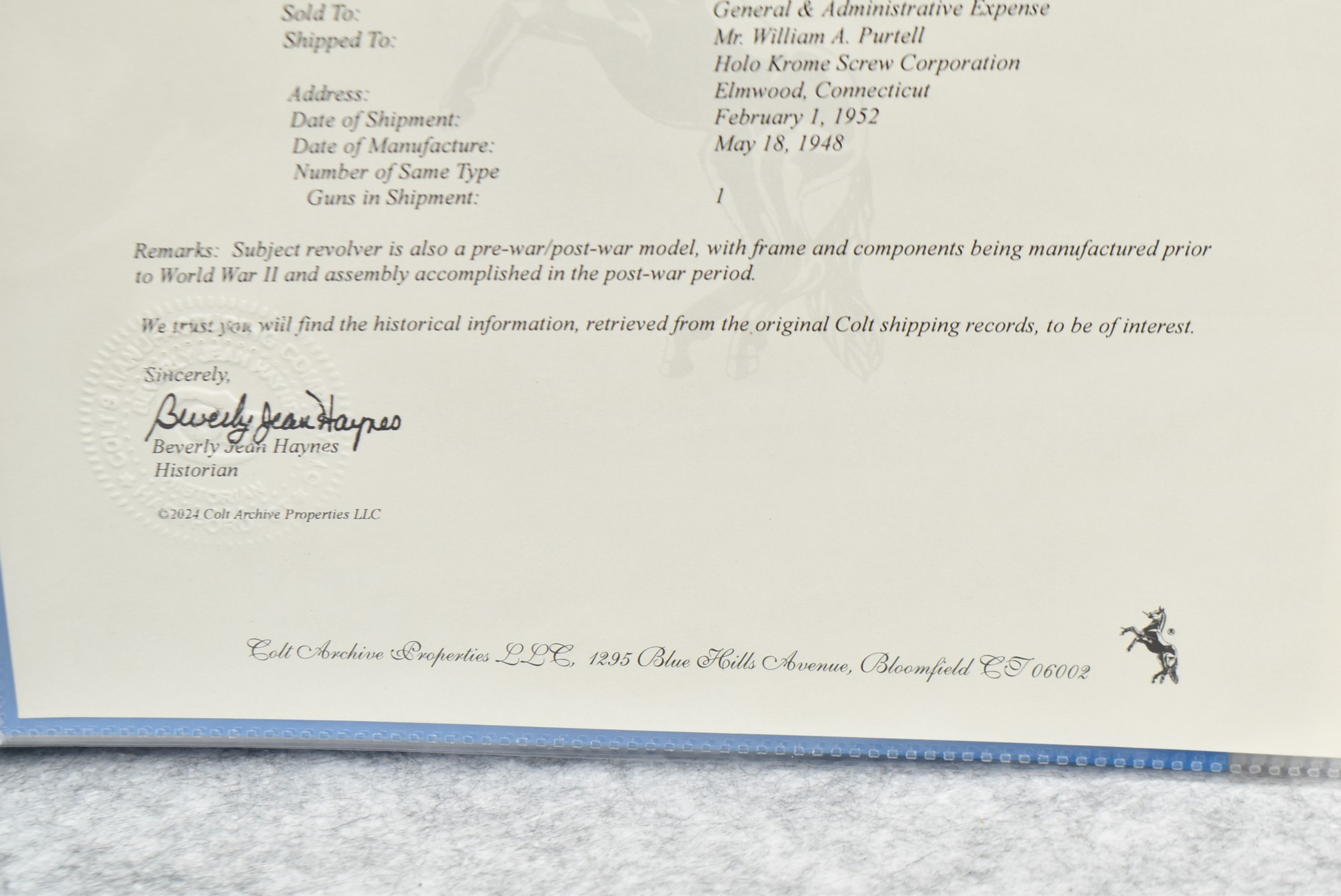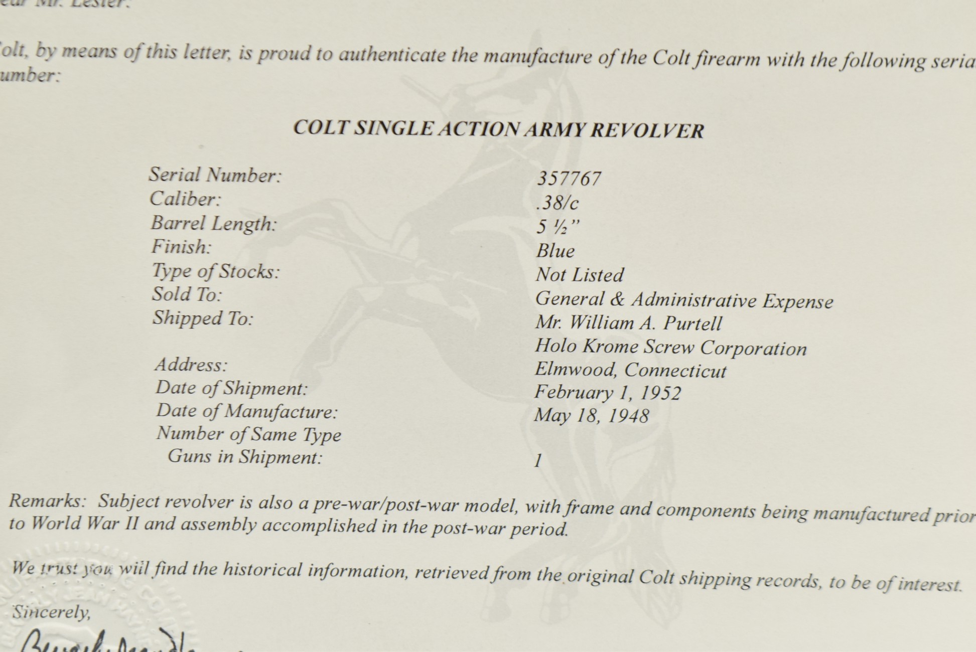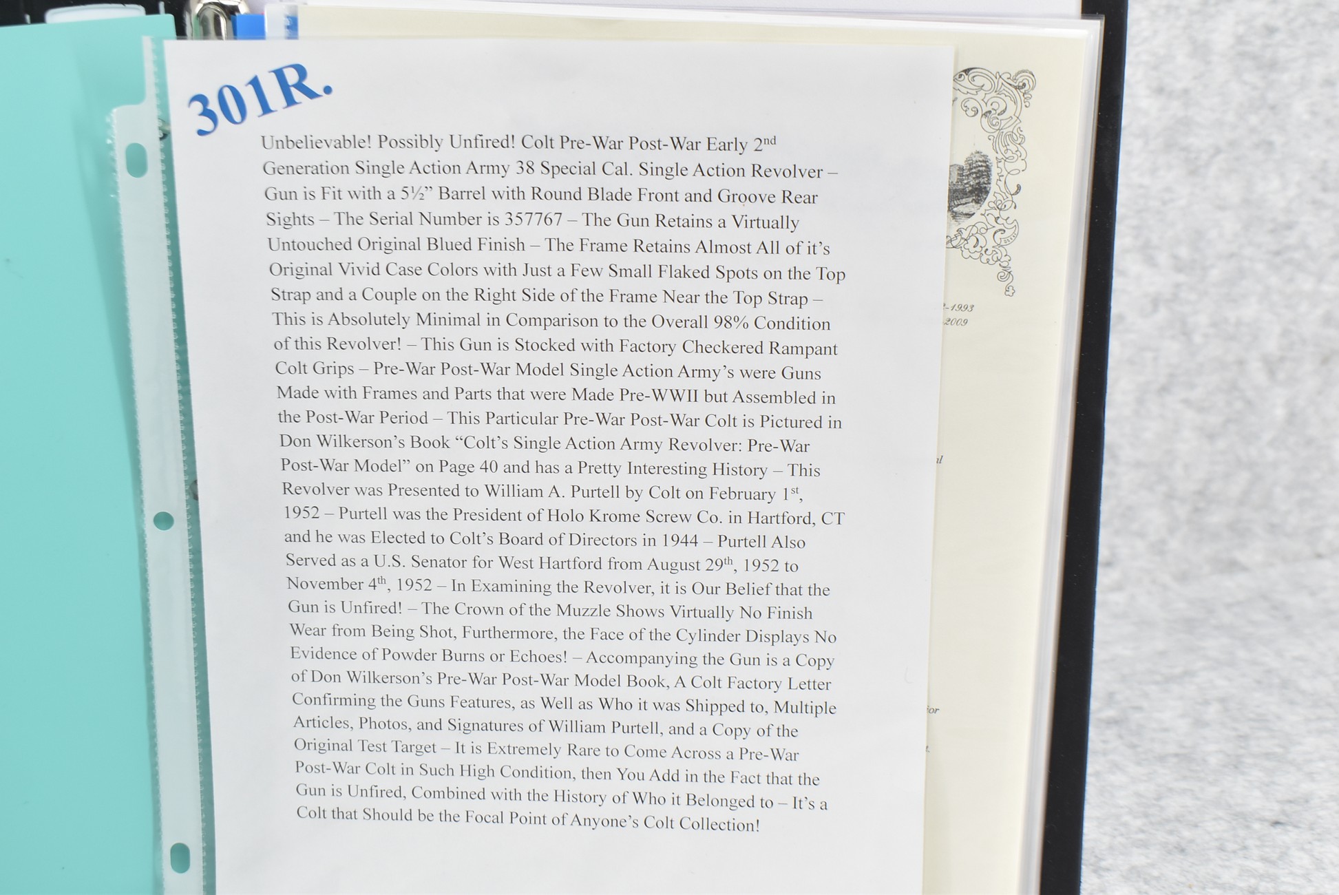 301R. Unbelievable! Possibly Unfired! Colt Pre-War Post-War Early 2nd Generation Single Action Army 38 Special Cal. Single Action Revolver – Gun is Fit with a 5½” Barrel with Round Blade Front and Groove Rear Sights – The Serial Number is 357767 – The Gun Retains a Virtually Untouched Original Blued Finish – The Frame Retains Almost All of it’s Original Vivid Case Colors with Just a Few Small Flaked Spots on the Top Strap and a Couple on the Right Side of the Frame Near the Top Strap – This is Absolutely Minimal in Comparison to the Overall 98% Condition of this Revolver! – This Gun is Stocked with Factory Checkered Rampant Colt Grips – Pre-War Post-War Model Single Action Army’s were Guns Made with Frames and Parts that were Made Pre-WWII but Assembled in the Post-War Period – This Particular Pre-War Post-War Colt is Pictured in Don Wilkerson’s Book “Colt’s Single Action Army Revolver: Pre-War Post-War Model” on Page 40 and has a Pretty Interesting History – This Revolver was Presented to William A. Purtell by Colt on February 1st, 1952 – Purtell was the President of Holo Krome Screw Co. in Hartford, CT and he was Elected to Colt’s Board of Directors in 1944 – Purtell Also Served as a U.S. Senator for West Hartford from August 29th, 1952 to November 4th, 1952 – In Examining the Revolver, it is Our Belief that the Gun is Unfired! – The Crown of the Muzzle Shows Virtually No Finish Wear from Being Shot, Furthermore, the Face of the Cylinder Displays No Evidence of Powder Burns or Echoes! – Accompanying the Gun is a Copy of Don Wilkerson’s Pre-War Post-War Model Book, A Colt Factory Letter Confirming the Guns Features, as Well as Who it was Shipped to, Multiple Articles, Photos, and Signatures of William Purtell, and a Copy of the Original Test Target – It is Extremely Rare to Come Across a Pre-War Post-War Colt in Such High Condition, then You Add in the Fact that the Gun is Unfired, Combined with the History of Who it Belonged to – It’s a Colt that Should be the Focal Point of Anyone’s Colt Collection!