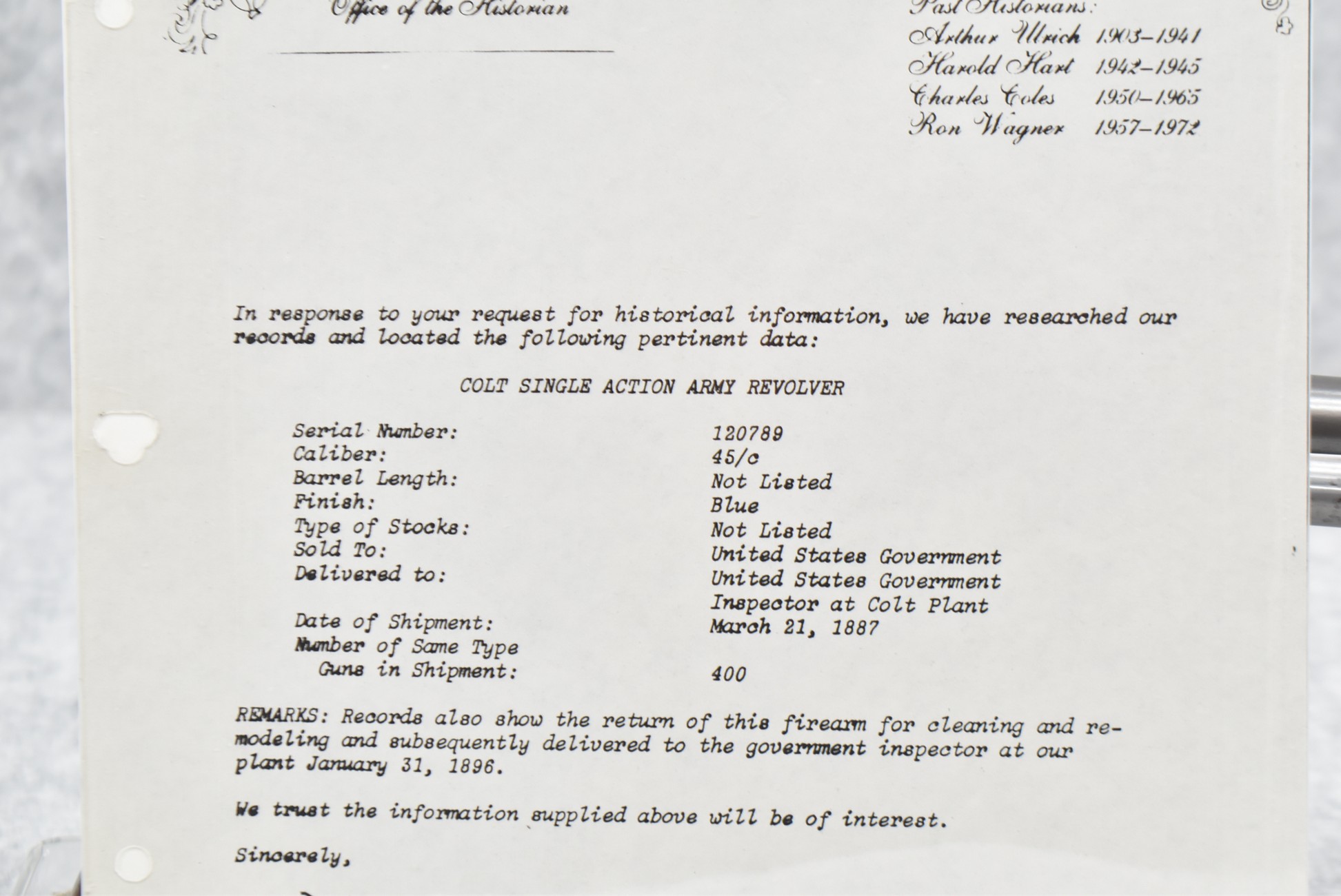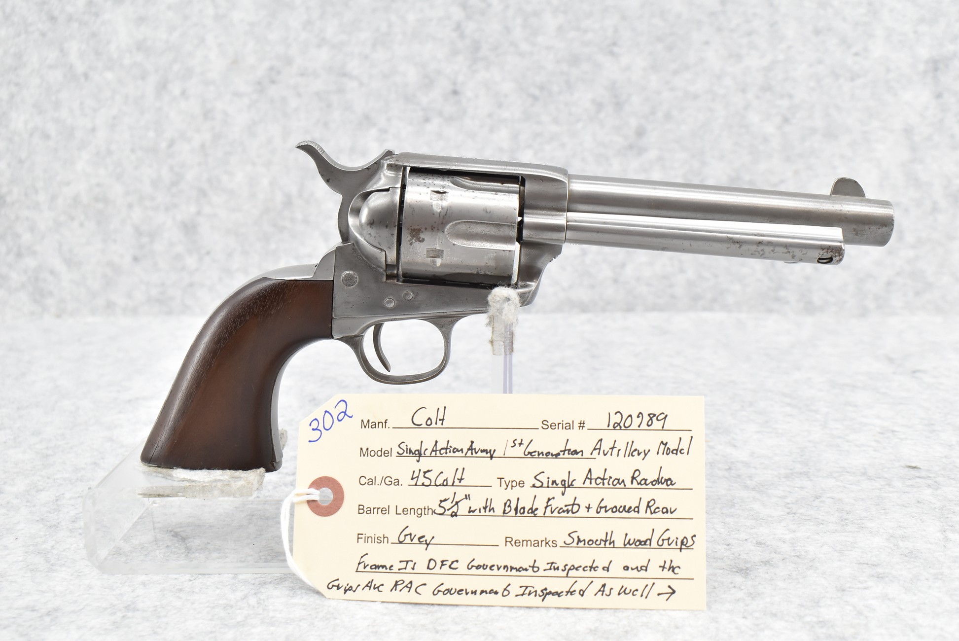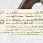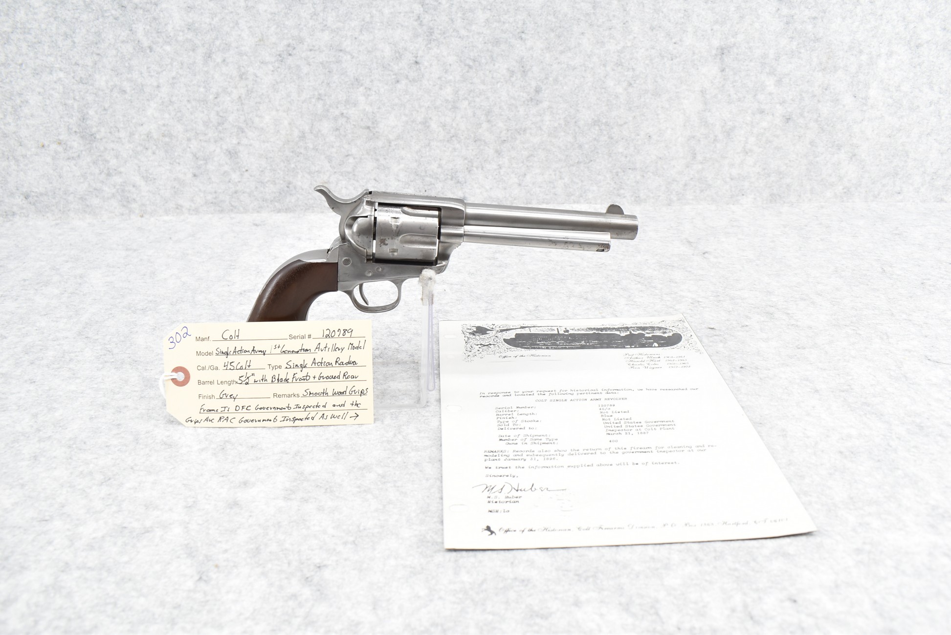 302.        Colt – Mod. Single Action Army – 1st Generation Artillery Model – 45 Colt Cal. Single Action Revolver – w/5 ½” Barrel w/Blade Front & Grooved Rear Sights – Gray Finish – w/Smooth Wood Grips – Frame Is DFC Government Inspected & the Grips Are RAC Government Inspected as Well – Only Visible Serial # is on Frame – Accompanying This Gun is a Factory Letter Showing Gun Shipped March 21, 1887 in a Grouping of 400 Guns to the United States Government & Returned for Remodeling & Cleaning & Redelivered to the Government Inspector at Colt Plant Jan. 31, 1896