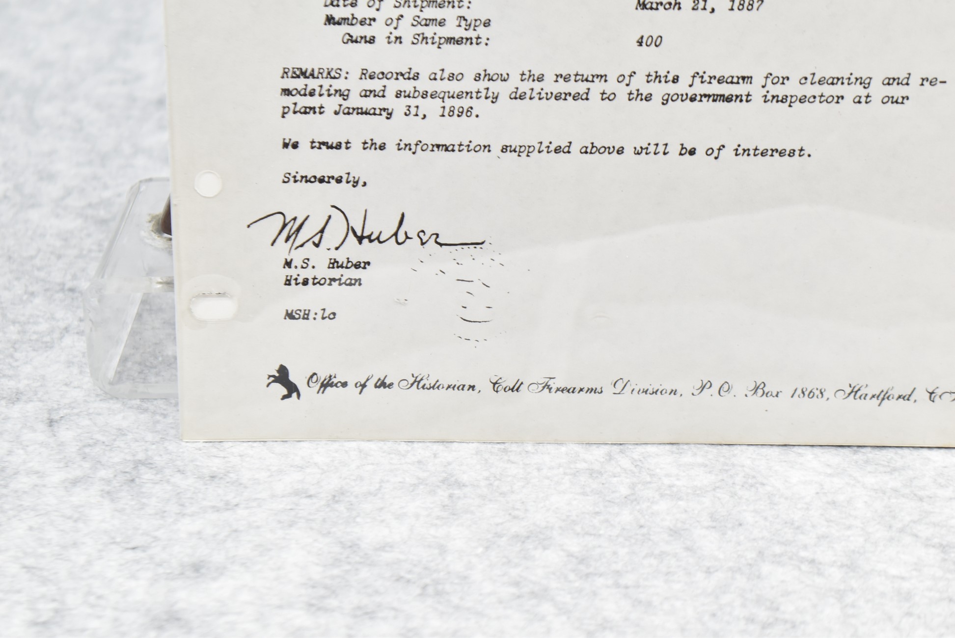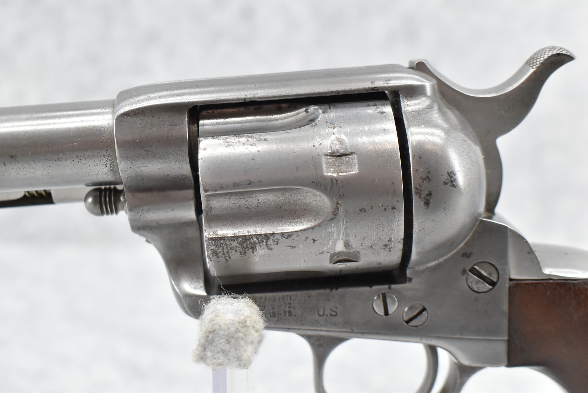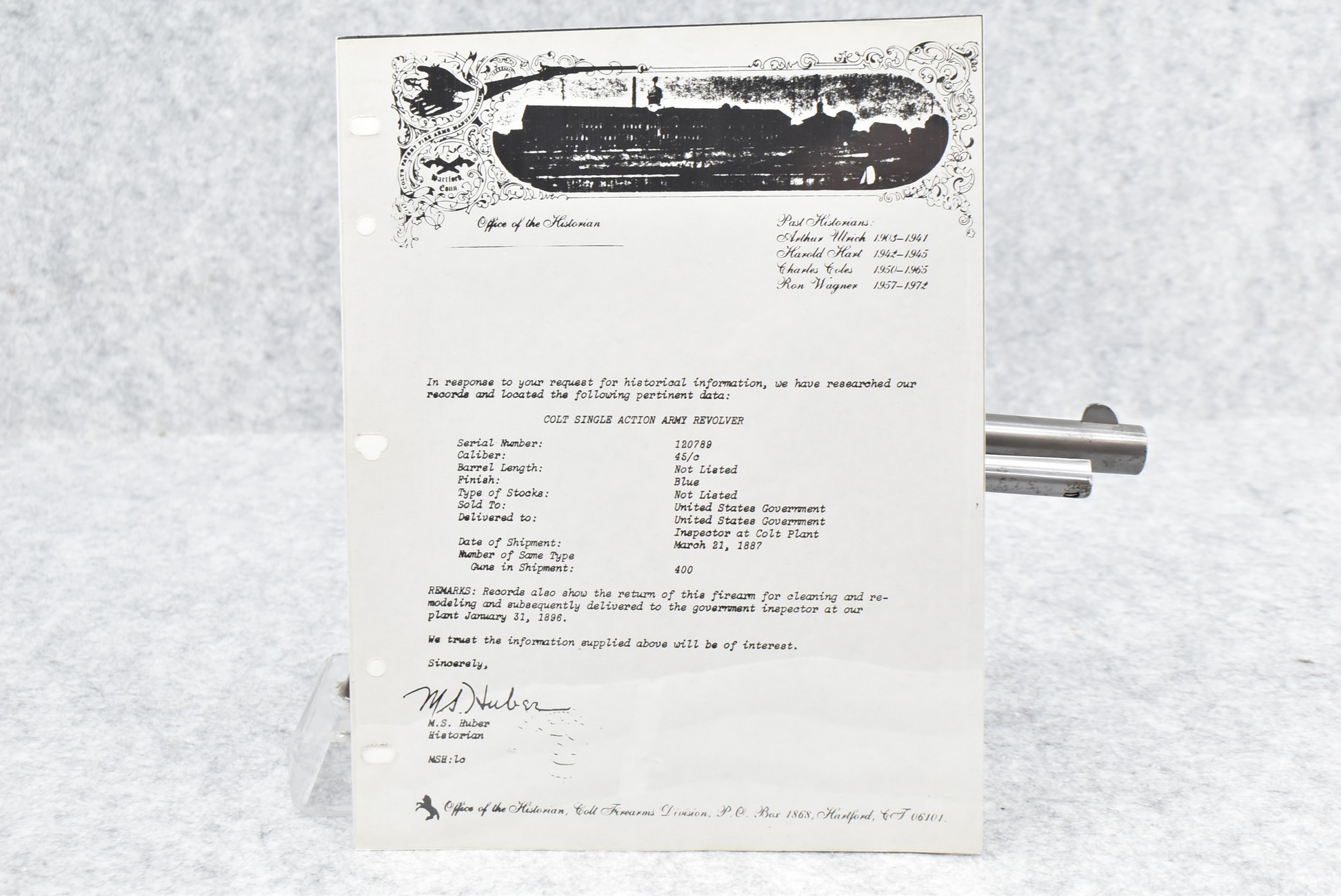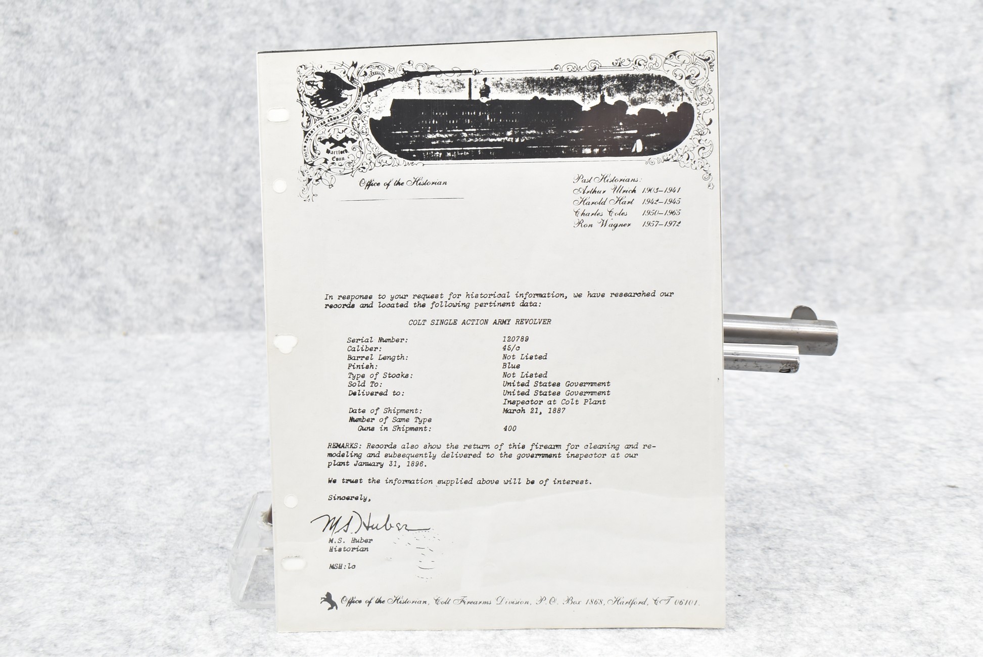 302.        Colt – Mod. Single Action Army – 1st Generation Artillery Model – 45 Colt Cal. Single Action Revolver – w/5 ½” Barrel w/Blade Front & Grooved Rear Sights – Gray Finish – w/Smooth Wood Grips – Frame Is DFC Government Inspected & the Grips Are RAC Government Inspected as Well – Only Visible Serial # is on Frame – Accompanying This Gun is a Factory Letter Showing Gun Shipped March 21, 1887 in a Grouping of 400 Guns to the United States Government & Returned for Remodeling & Cleaning & Redelivered to the Government Inspector at Colt Plant Jan. 31, 1896