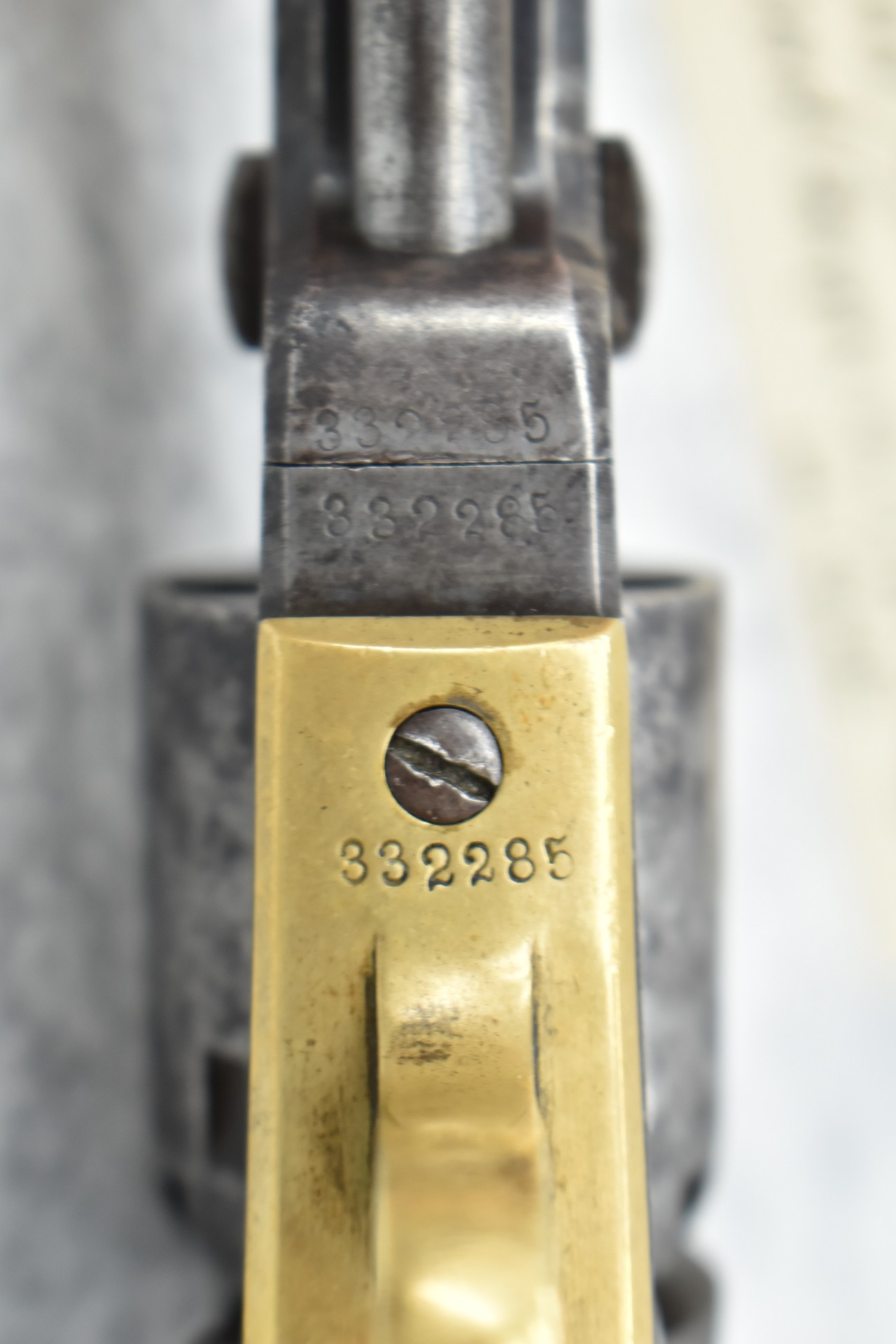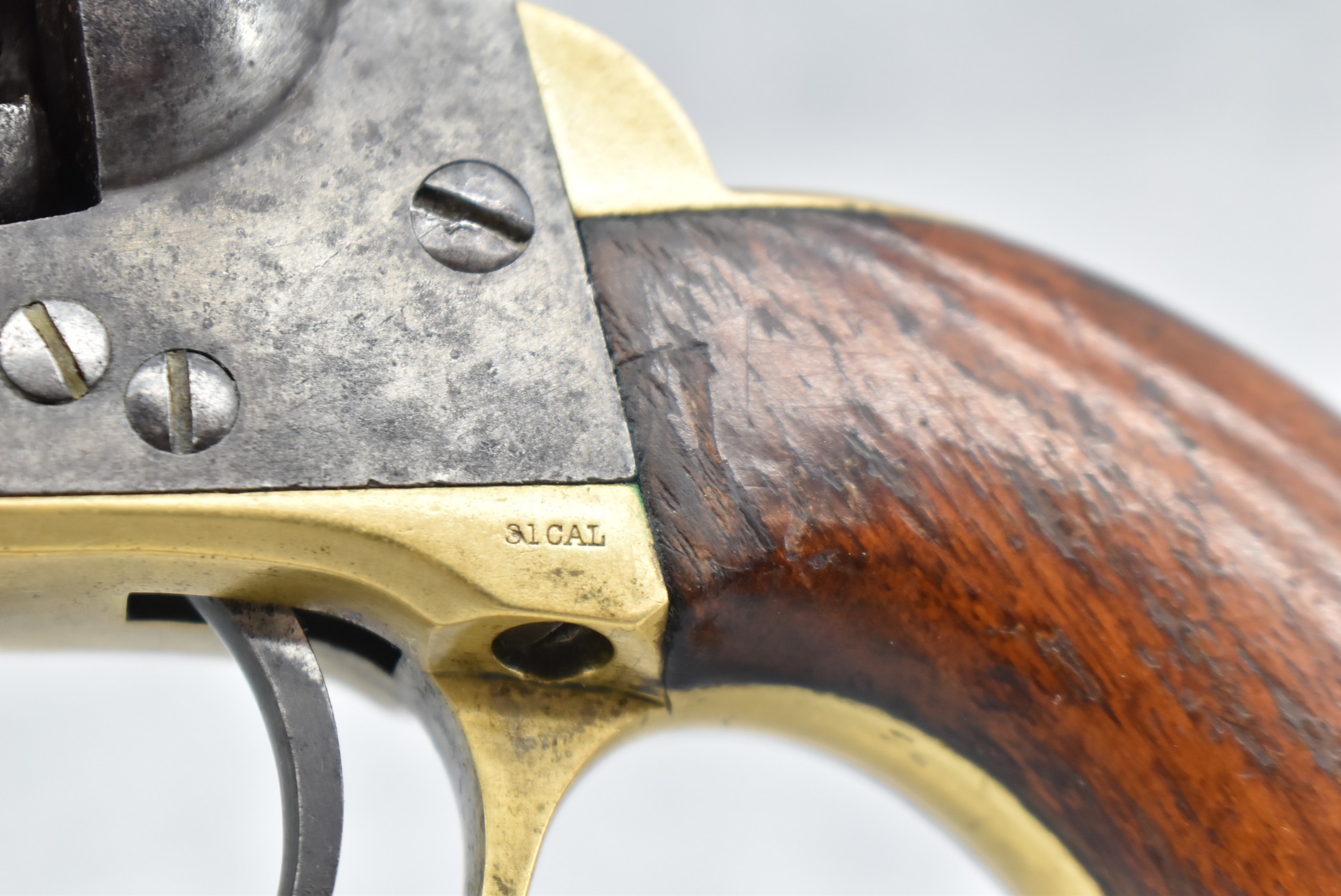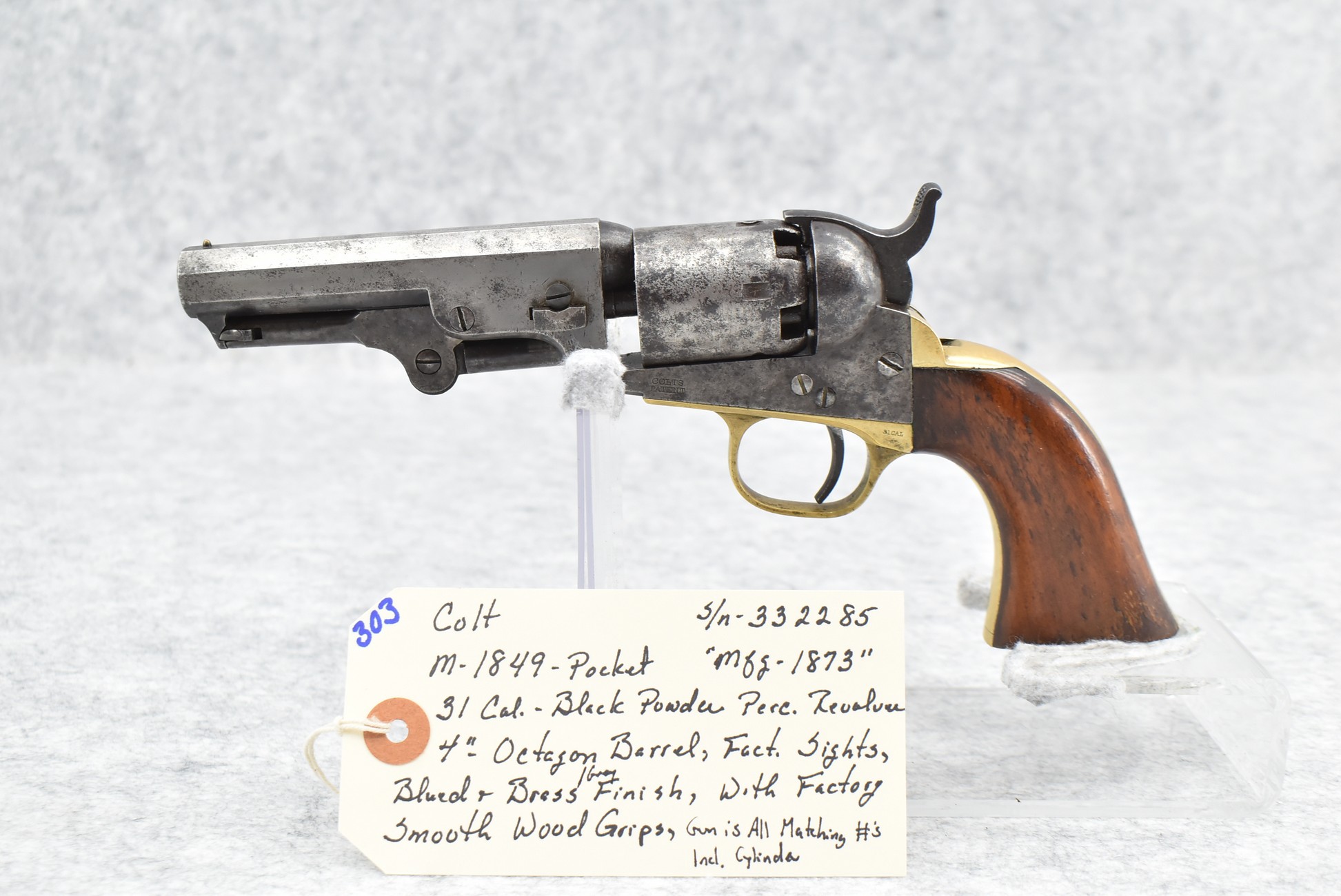 303. Colt – Mod. 1849 Pocket – 31 Cal. Percussion Black Powder Revolver – w/4” Octagon Barrel w/Factory Sights – Blued/Gray Finish – w/Factory Smooth Wood Grips – Gun is All Matching Numbers Including Cylinder – Mfg. 1873