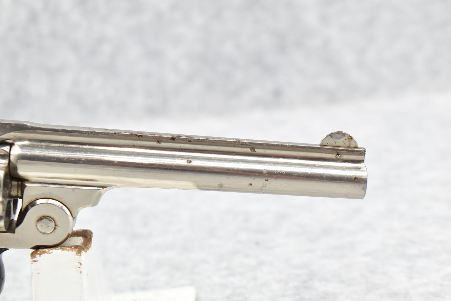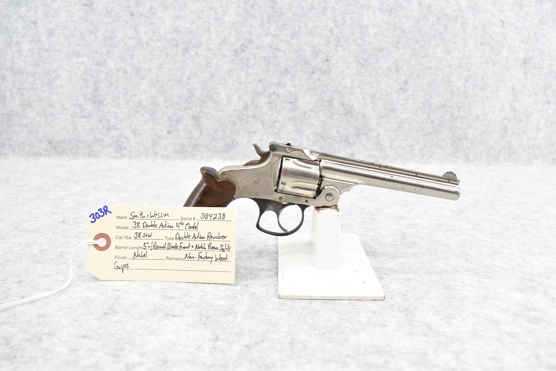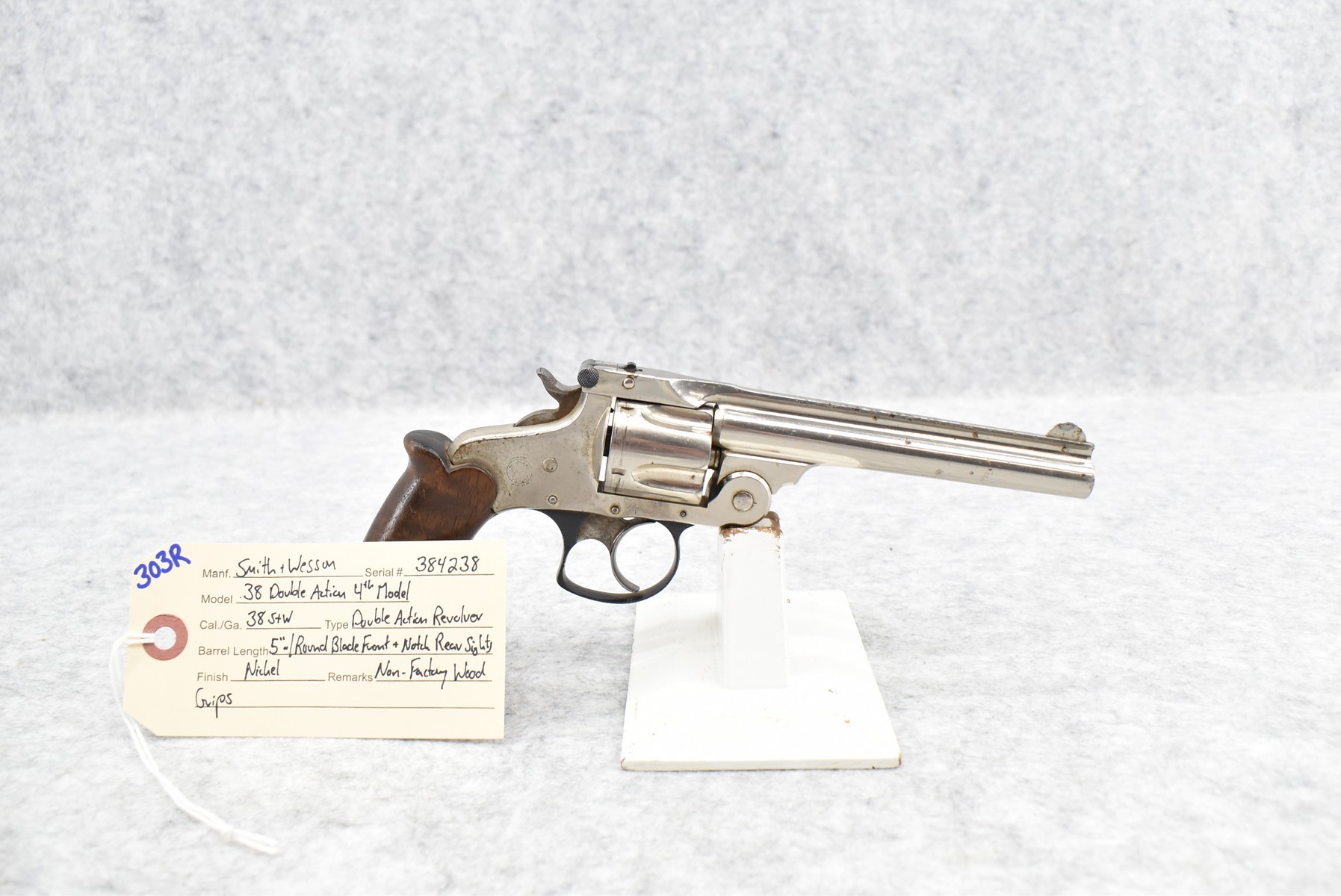 303R. Smith & Wesson – Mod. .38 Double Action 4th Model – 38 S&W Cal. Double Action Revolver – w/5” Barrel w/Round Blade Front & Notch Rear Sights – Nickel Finish – w/Non-Factory Wood Grips
