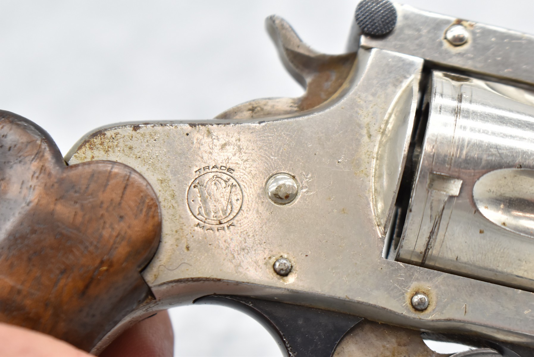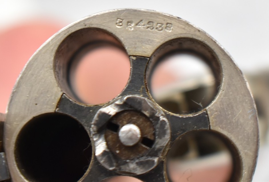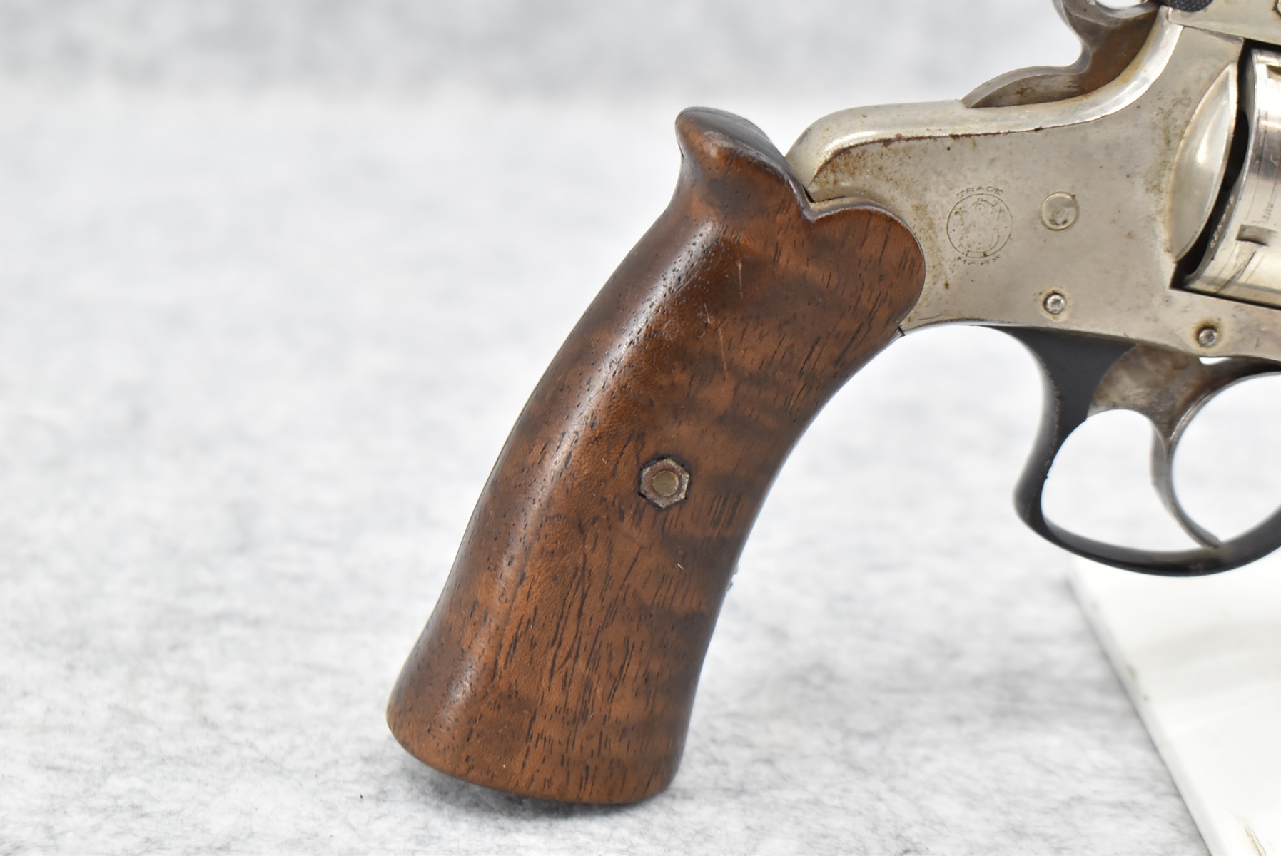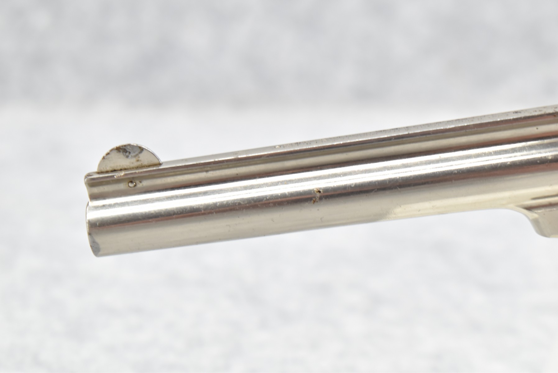 303R. Smith & Wesson – Mod. .38 Double Action 4th Model – 38 S&W Cal. Double Action Revolver – w/5” Barrel w/Round Blade Front & Notch Rear Sights – Nickel Finish – w/Non-Factory Wood Grips