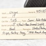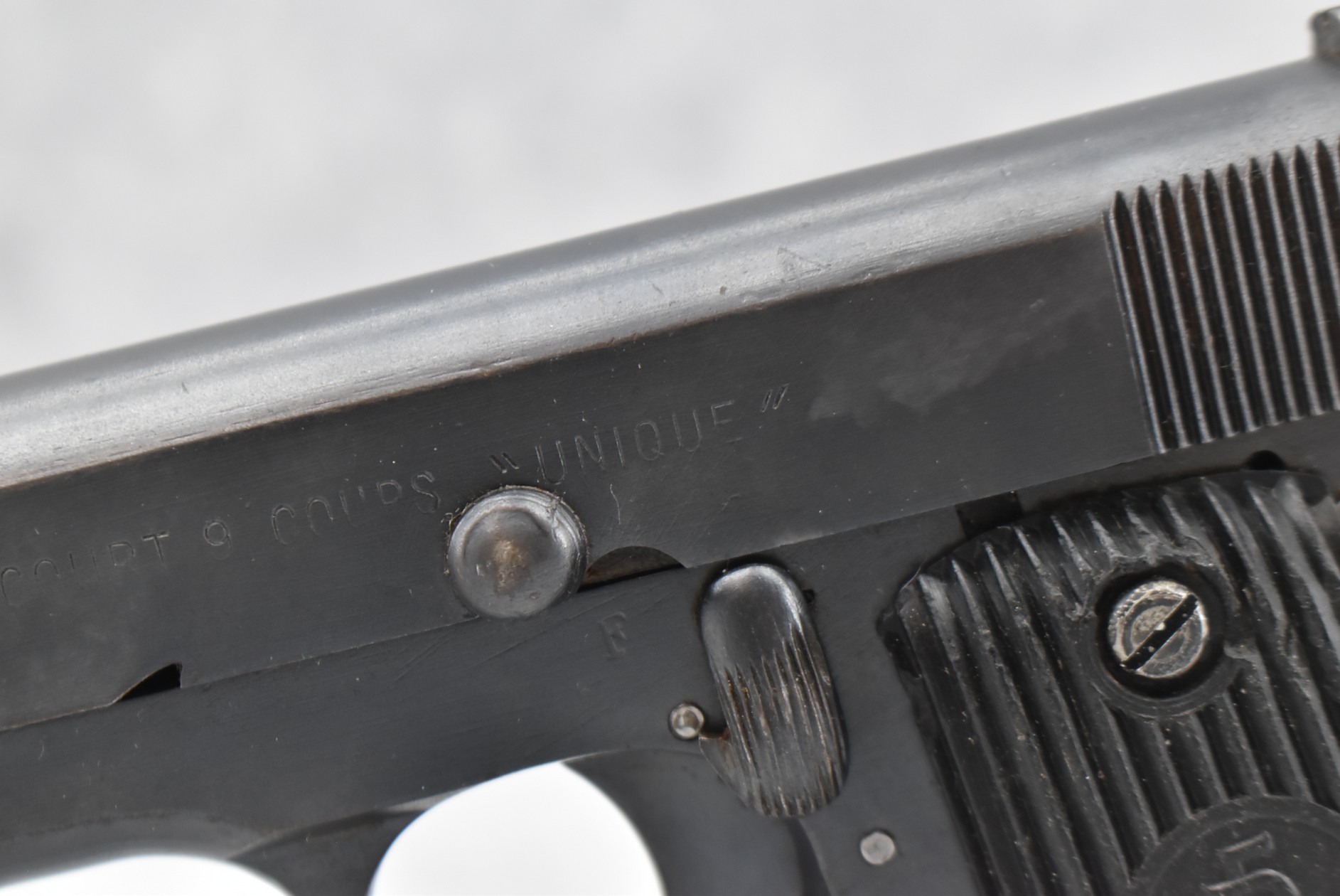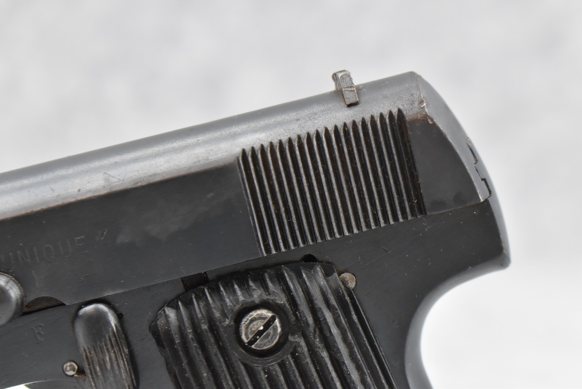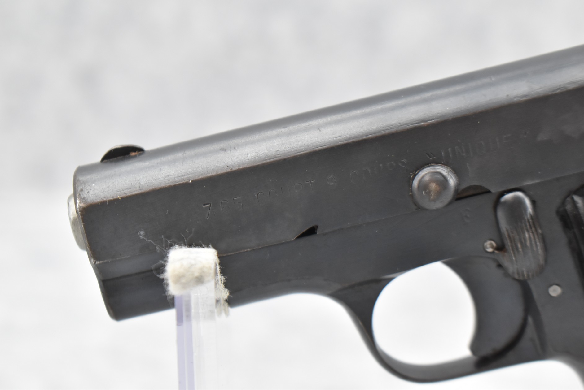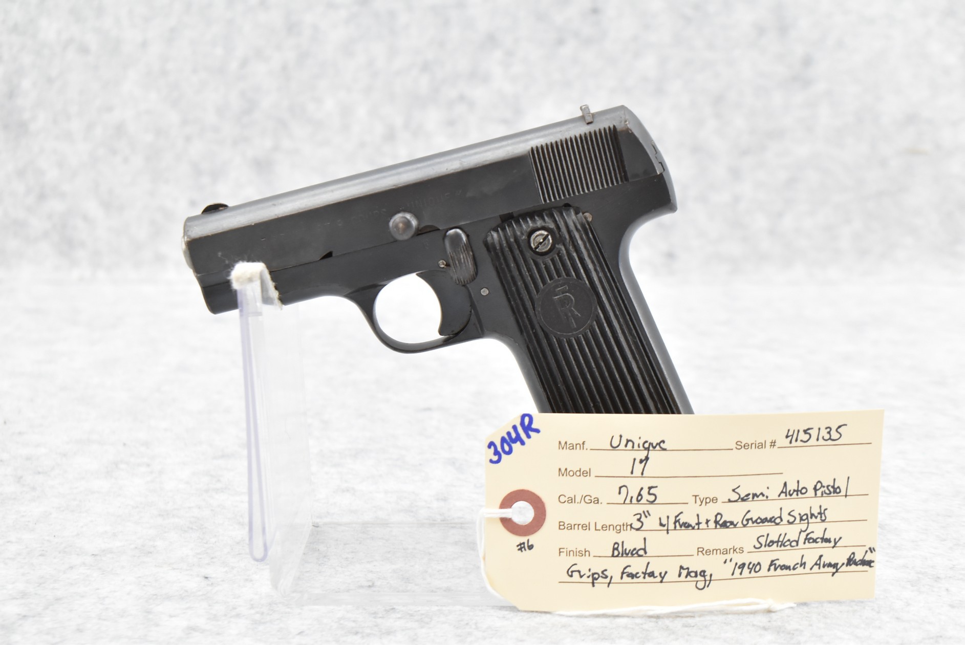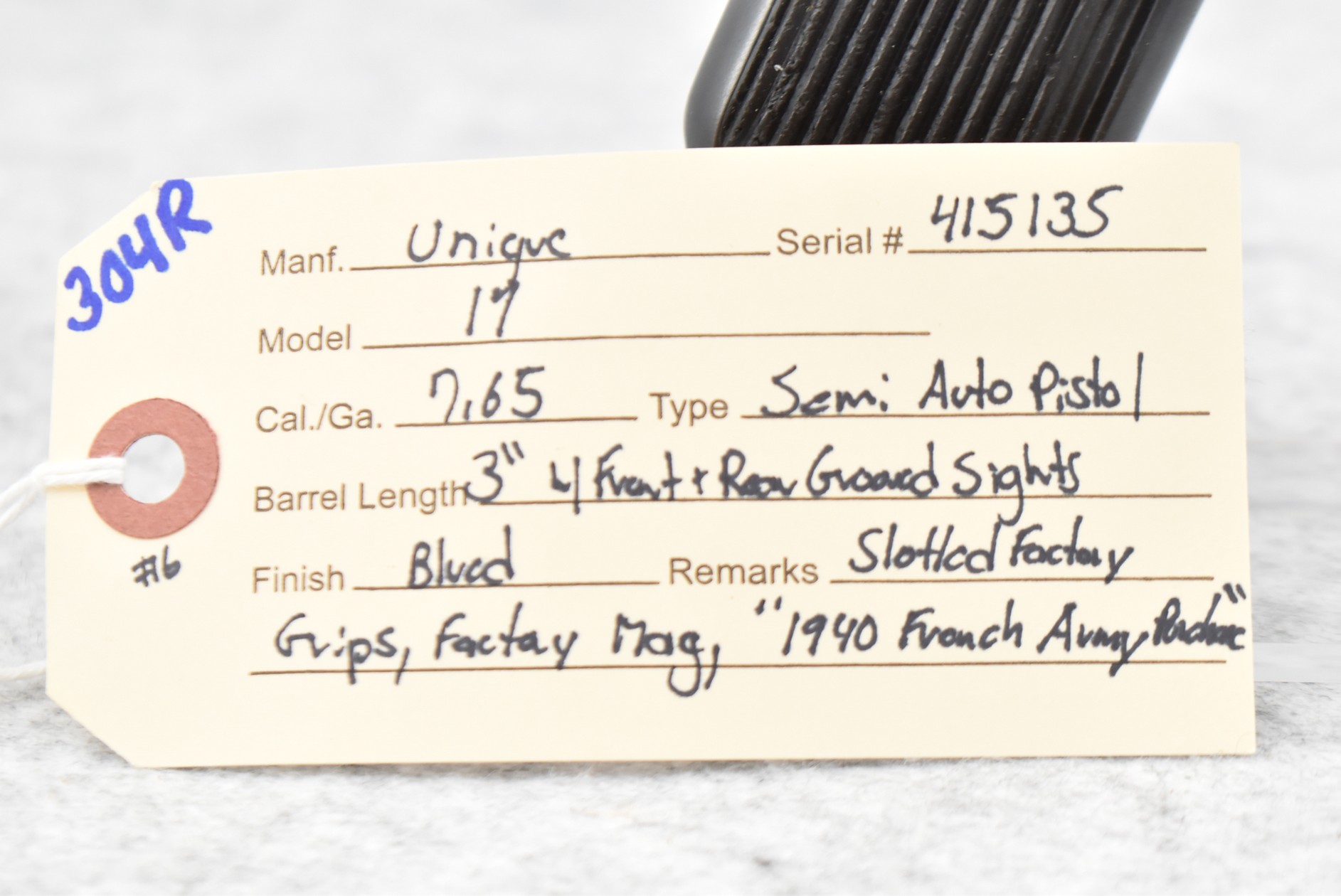 304R. Unique – Mod. 17 – 7.65 Cal. Semi-Auto Pistol – w/3” Barrel w/Front & Rear Guard Sights – Blued Finish – w/Slotted Factory Grips – w/Factory Mag – “1940 French Army Purchase”