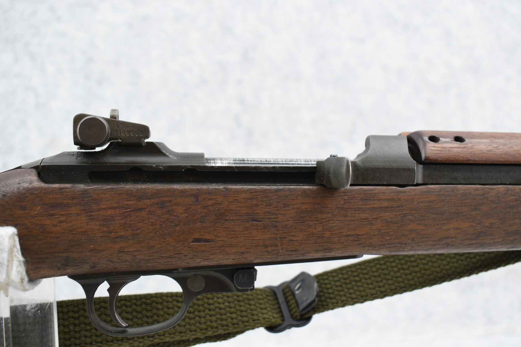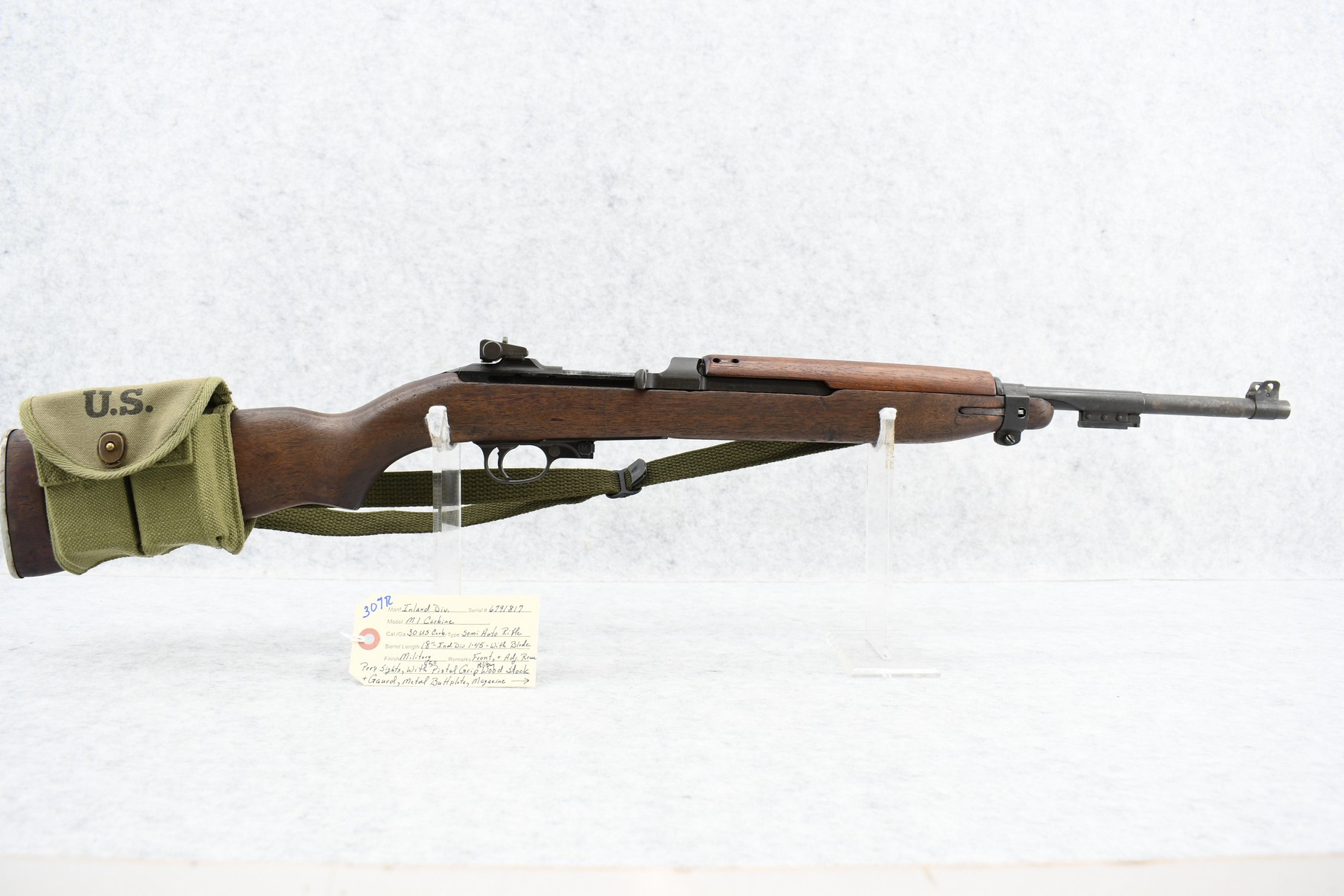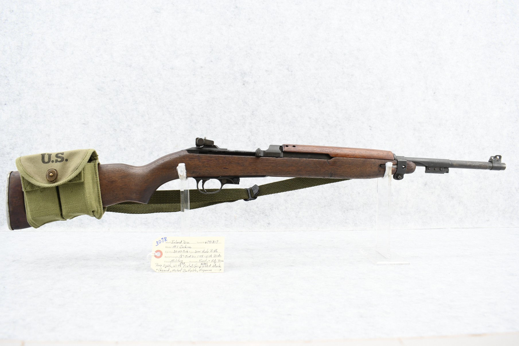 307R. Inland Division – Mod. M1 Carbine – 30 US Carb. Cal. Semi-Auto Rifle – w/18” Inland Div. 1-45 Dated Barrel w/Blade Front & Adj. Rear Peep Sights – Military Finish – w/Full Pistol Grip Military Wood Stocks w/Metal Butt Plate – w/Very Faint Crossed Cannon Stock Cartouche on Right Side of Butt Stock – w/Magazine Pouch & 2 Magazines – w/Military Sling