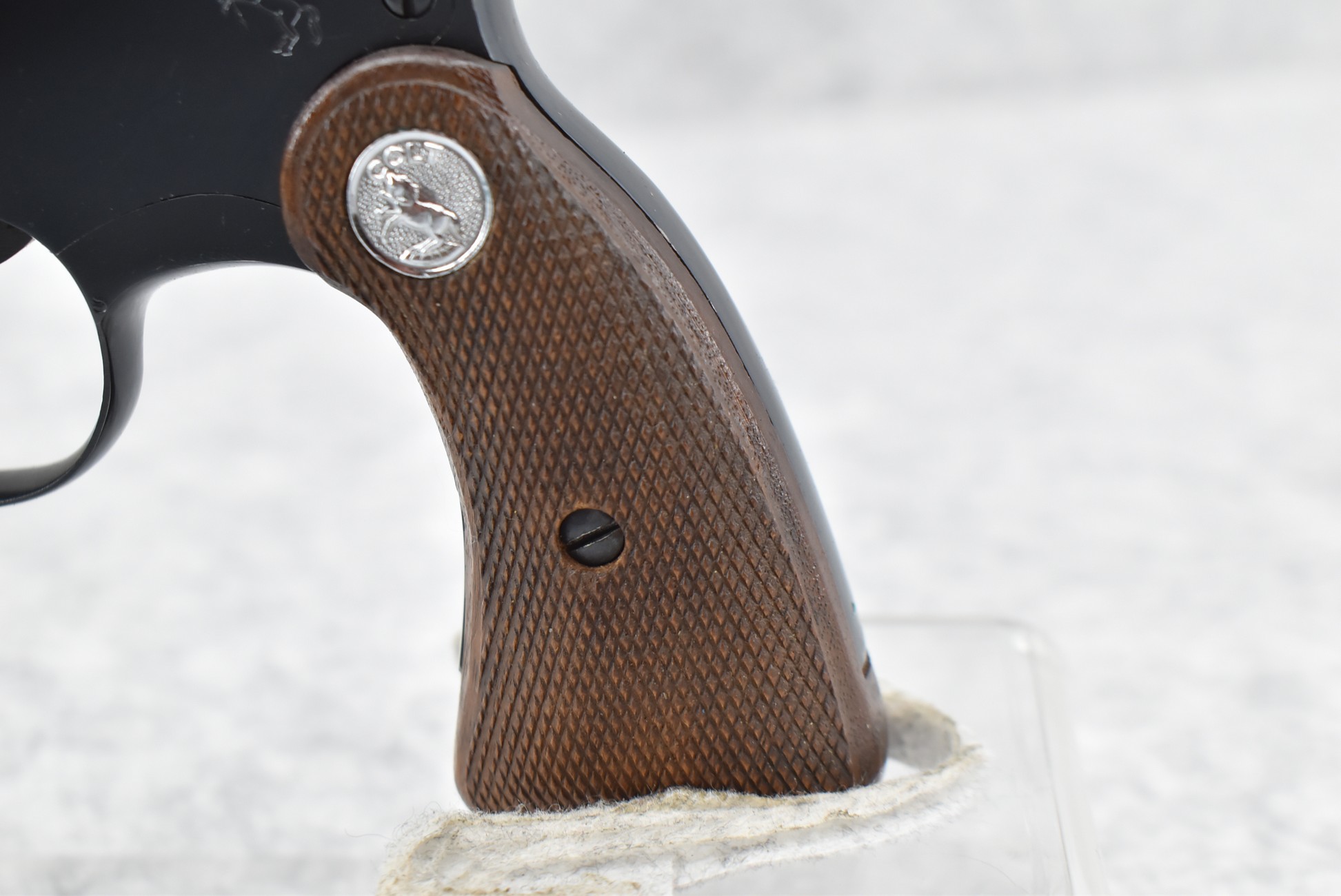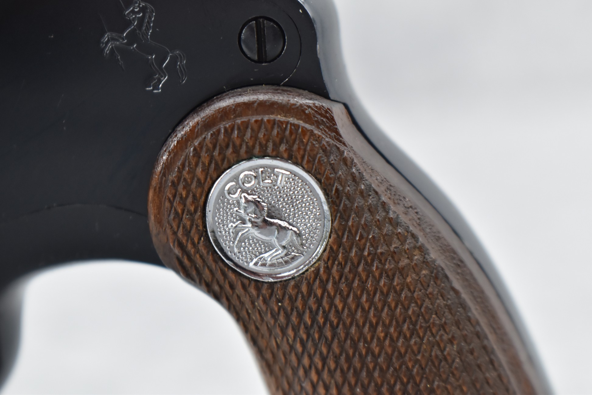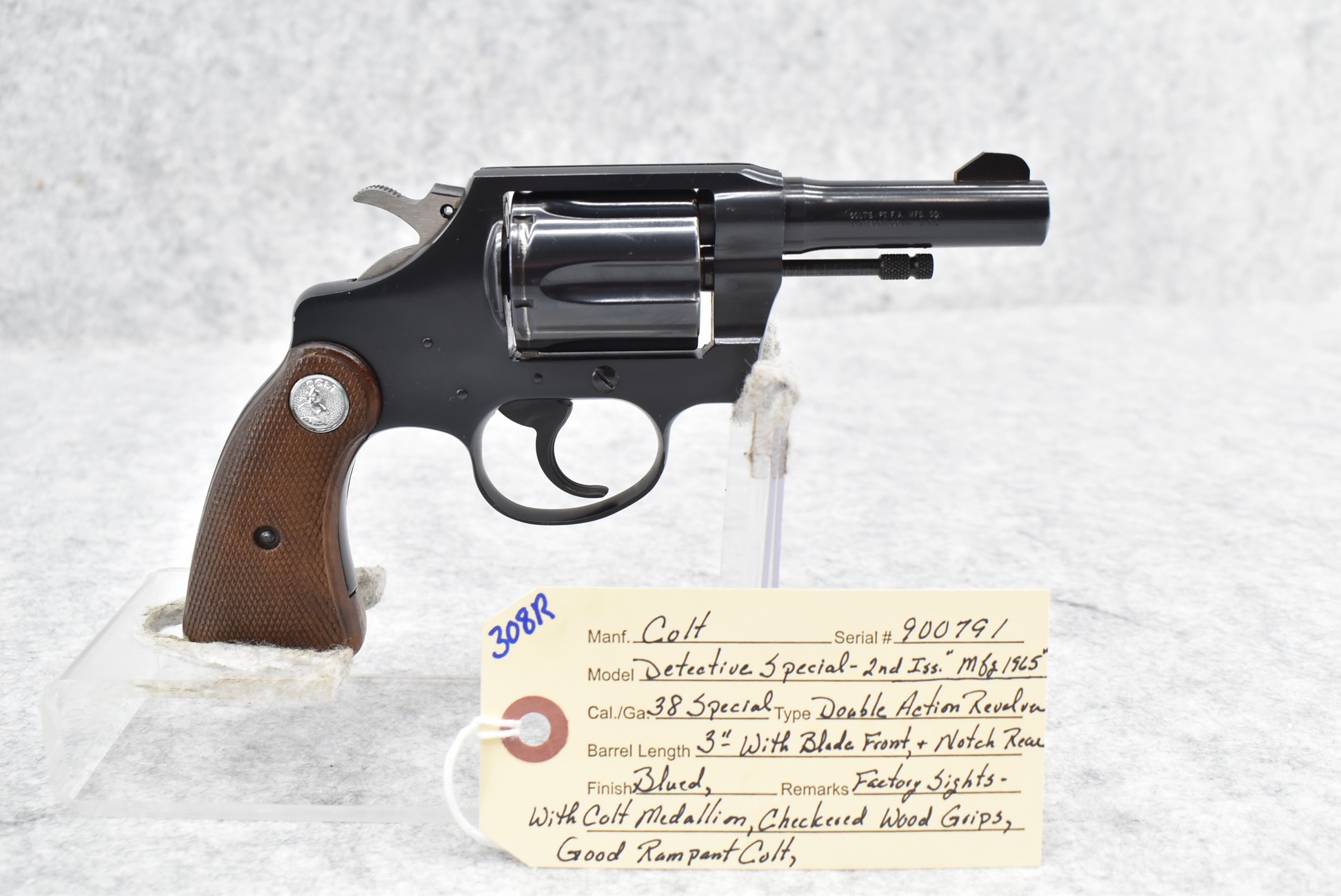 308R. Colt – Mod. Detective Special – 2nd Issue – 38 Spl. Cal. Double Action Revolver – w/3” Barrel w/Blade Front & Notch Rear Factory Sights – Blued Finish – w/Colt Medallion Checkered Wood Grips – w/Good Rampant Colt – Mfg. 1965