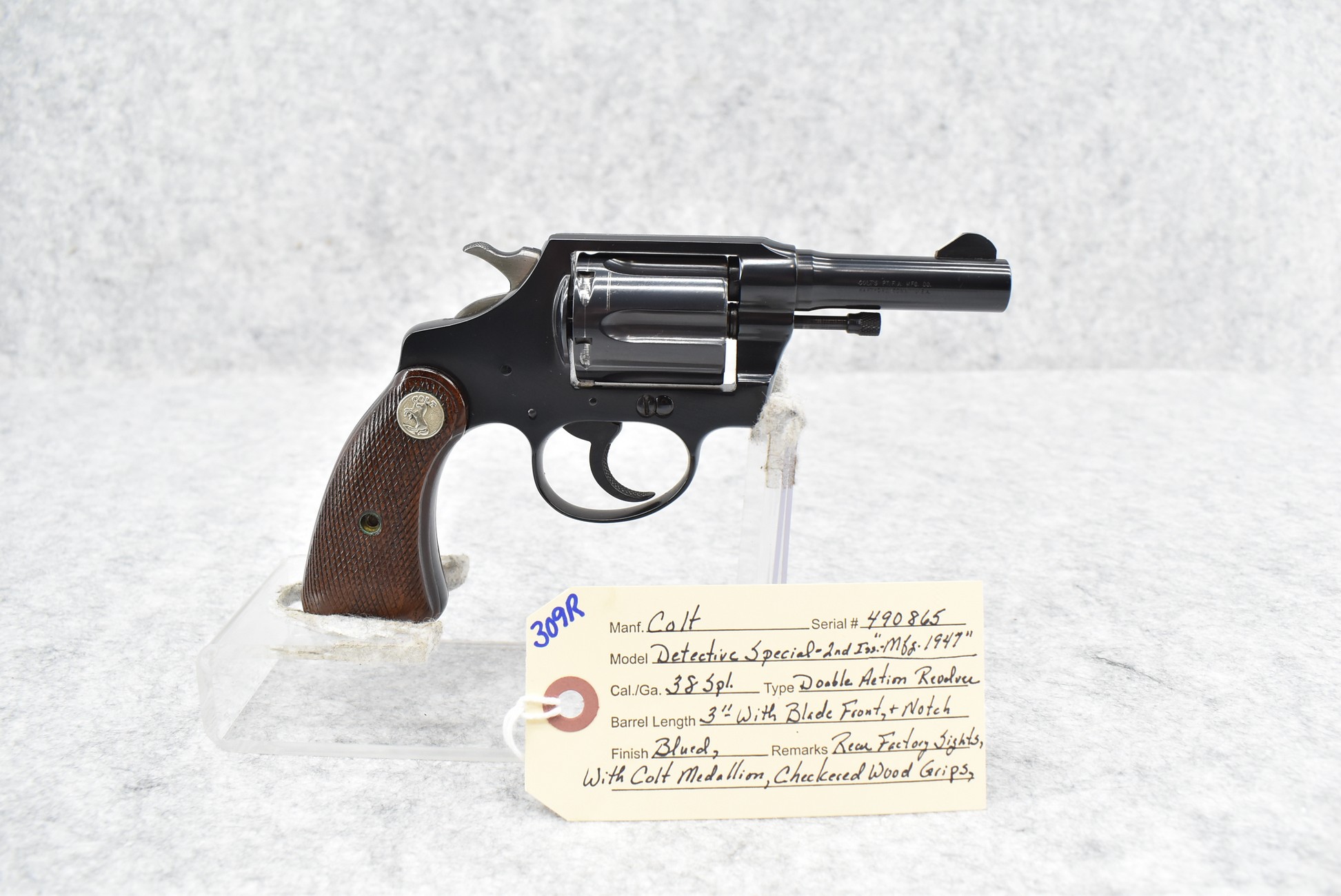 309R. Colt – Mod. Detective Special – 2nd Issue – 38 Spl. Cal. Double Action Revolver – w/3” Barrel w/Blade Front &Notch Rear Factory Sights – Blued Finish – w/Colt Medallion Checkered Wood Grips – Mfg. 1947