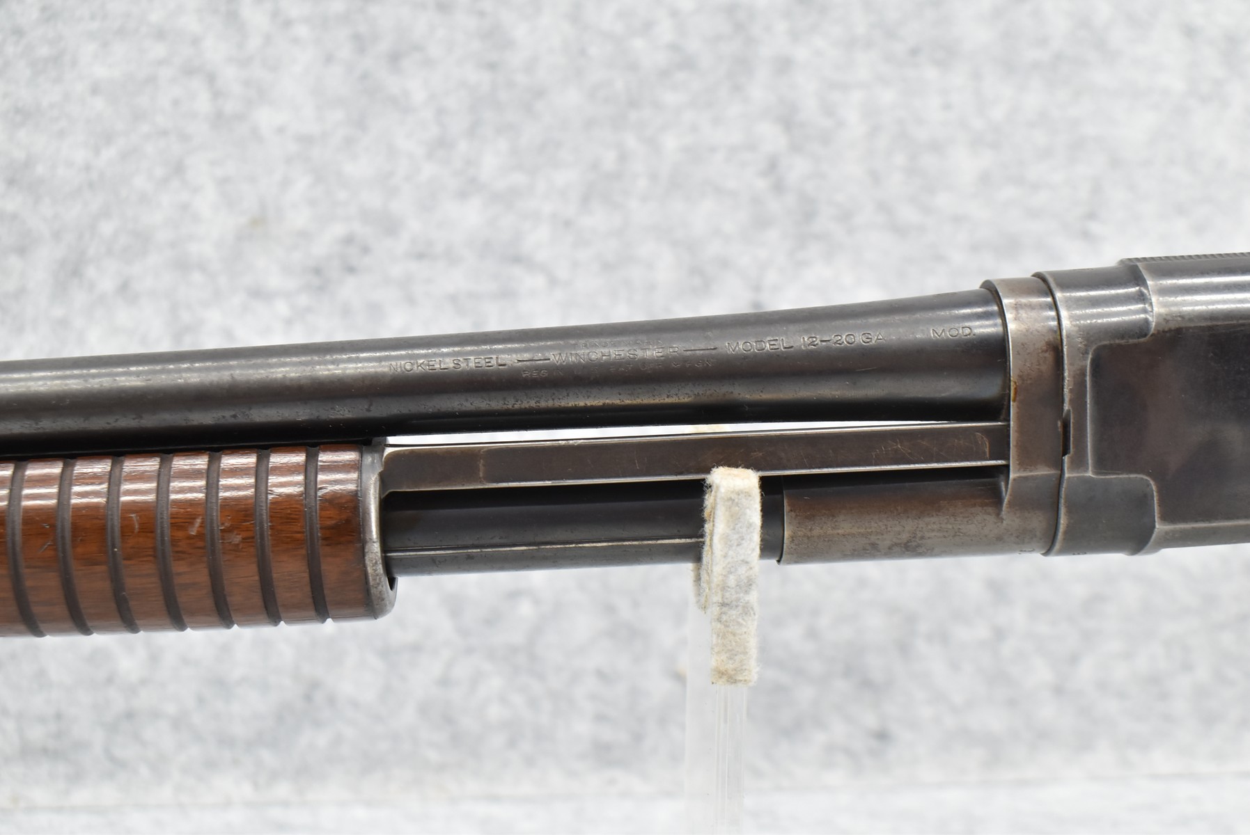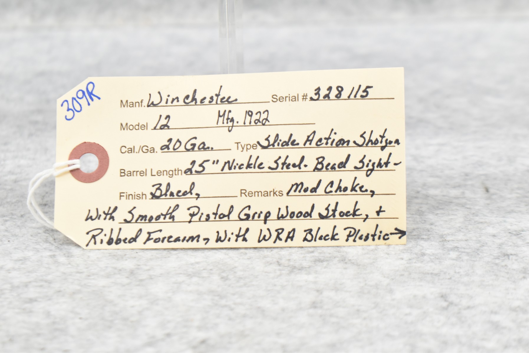 309R. Winchester – Mod. 12 – 20ga. Pump Action Shotgun – w/26” Mod. Choke, Nickel Steel Barrel w/Bead Sight – Blued Finish – w/Smooth Pistol Grip Wood Stock w/Factory Butt Plate & Ribbed Forearm – Mfg. 1922