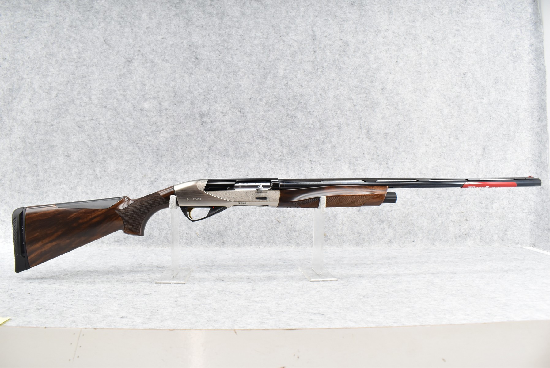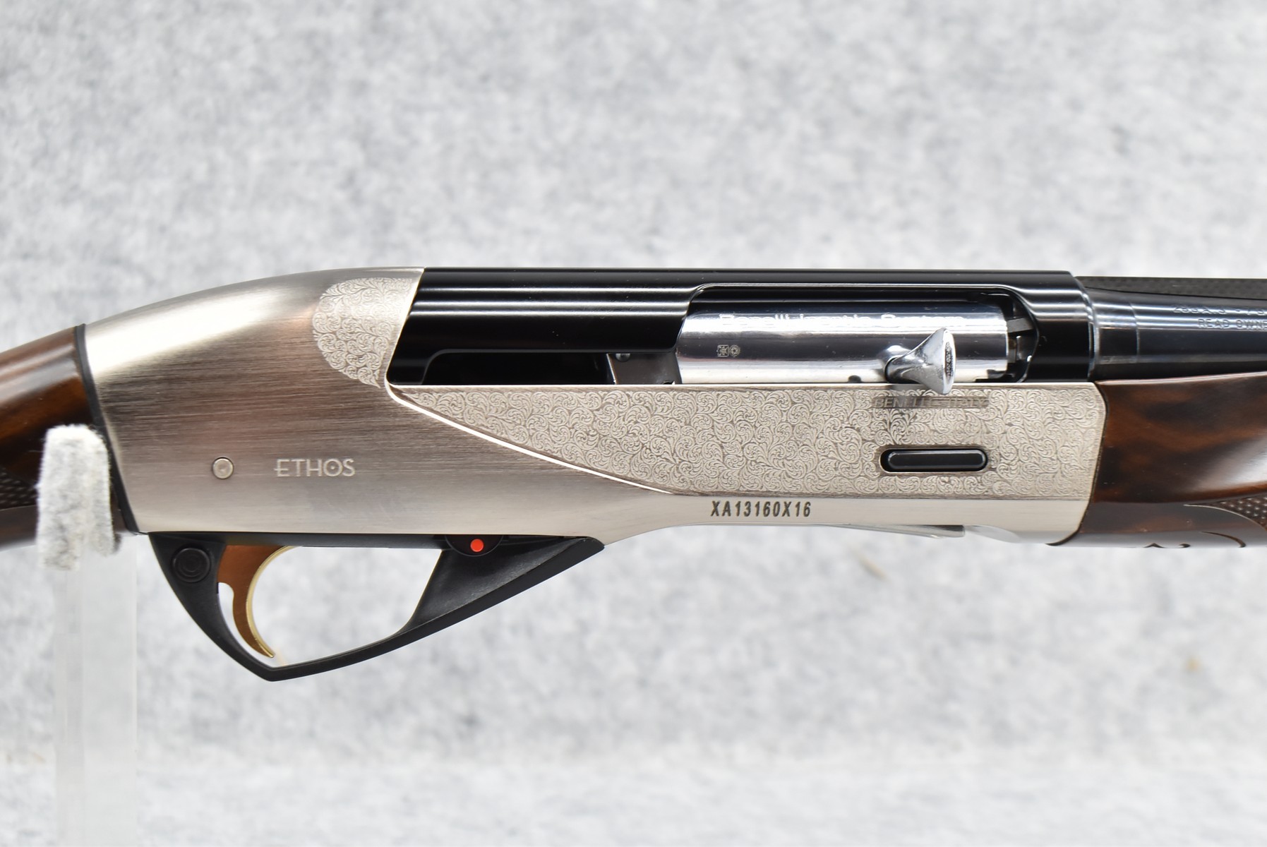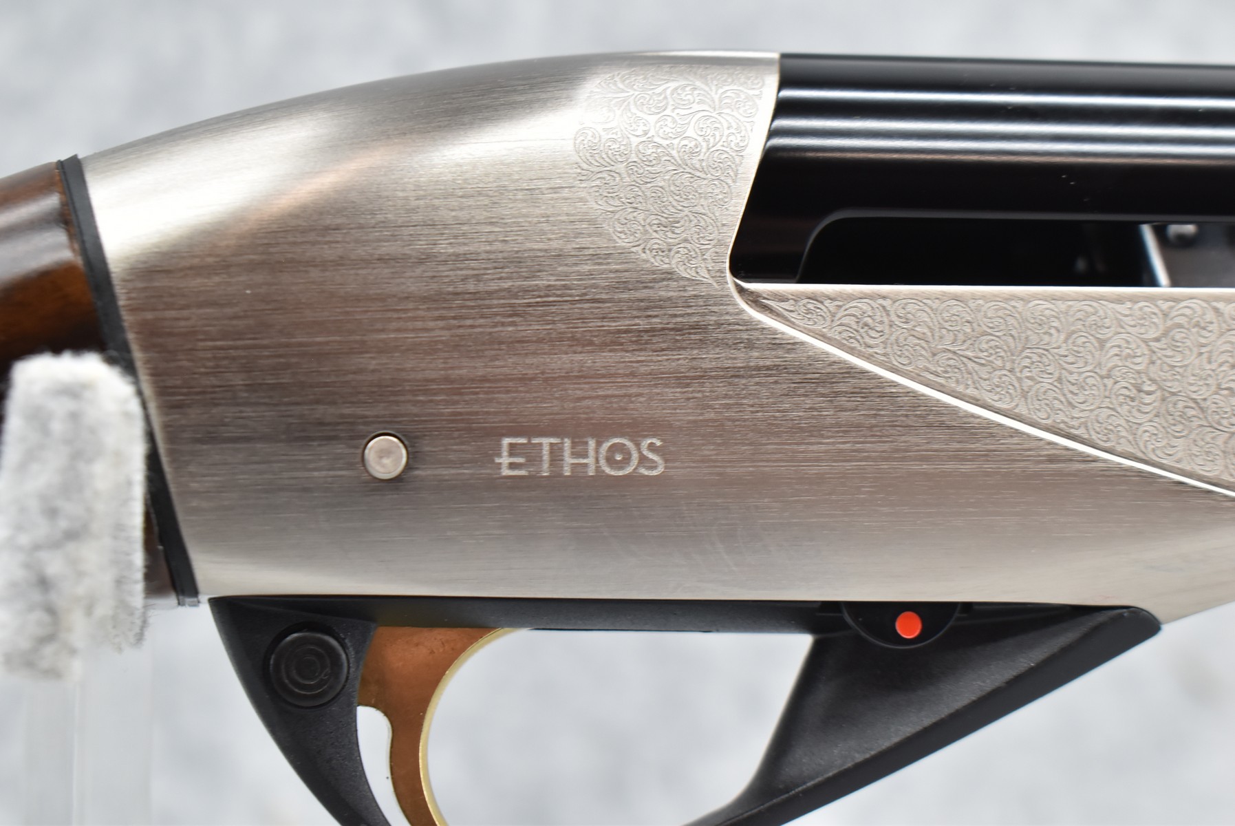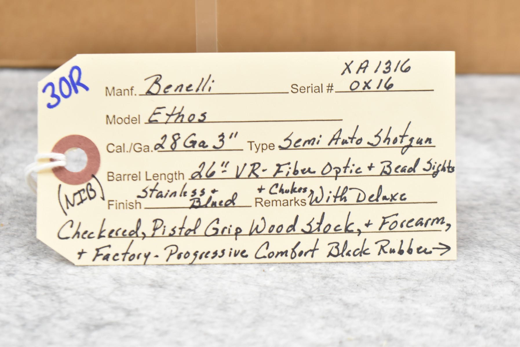 30R. Benelli – Mod. Ethos – 28ga. 3” Semi-Auto Shotgun – w/26” Vent Rib Choked Barrel w/Fiber Optic and Bead Sights – Stainless/Blued Finish – w/Deluxe Checkered Pistol Grip Wood Stock and Forearm w/Factory Progressive Comfort Black Rubber Butt Pad – Unfired w/Factory Hard Case, Shipping Box, Chokes, and Accessories