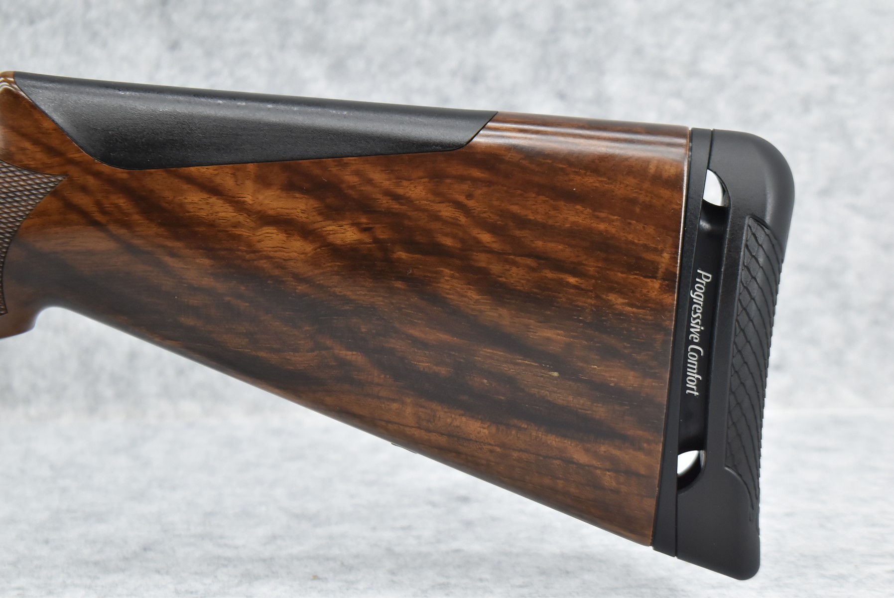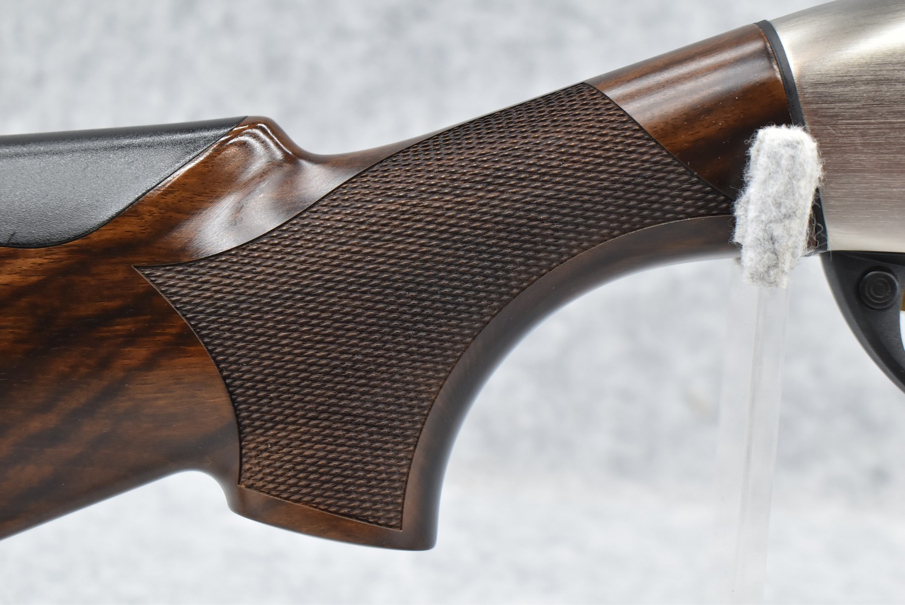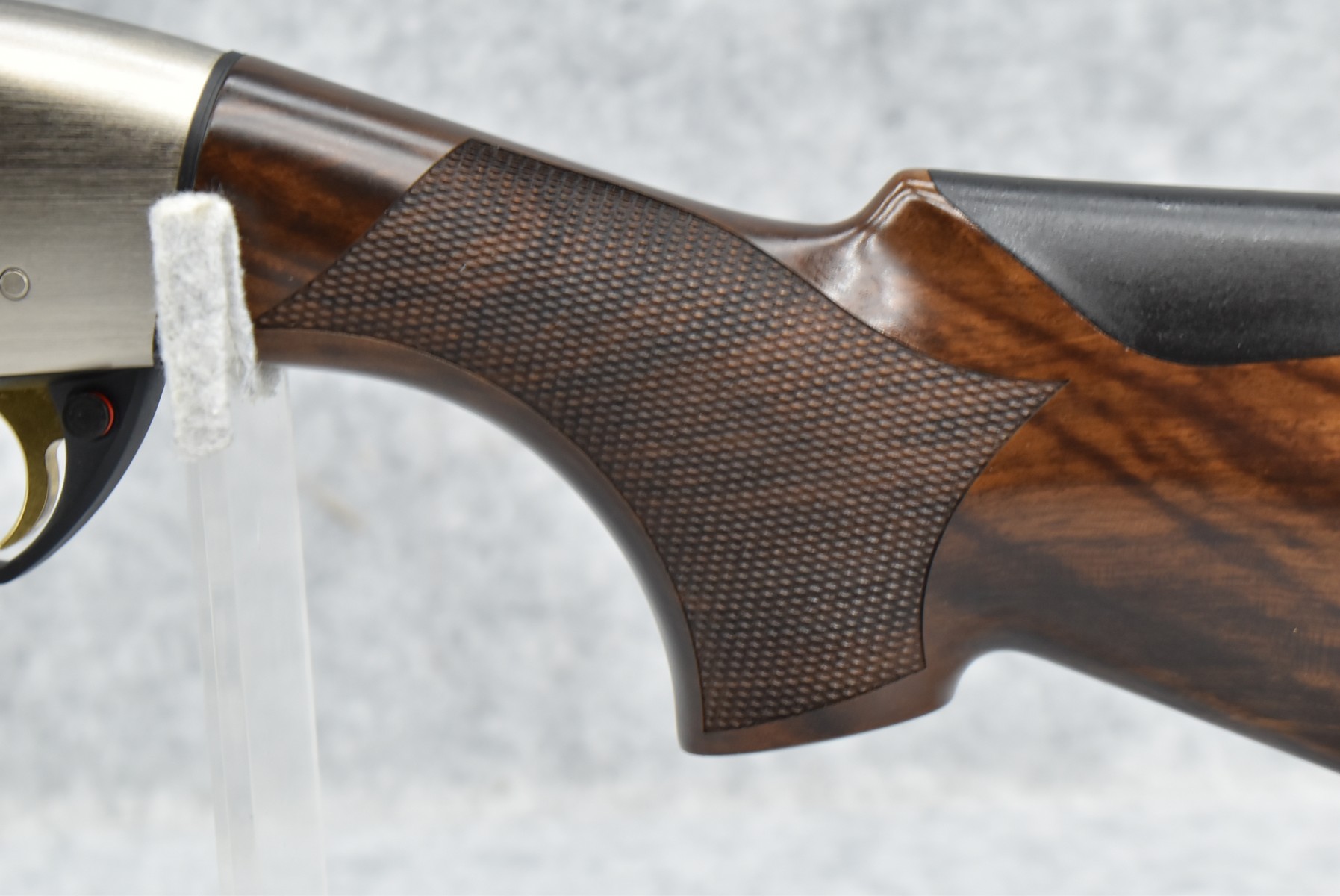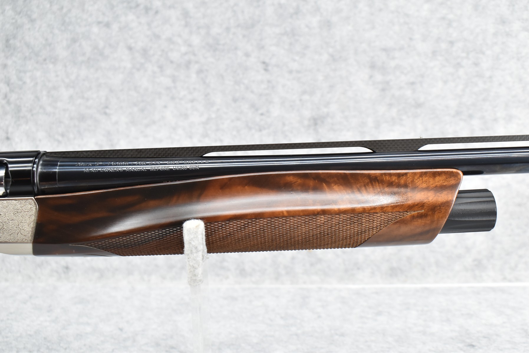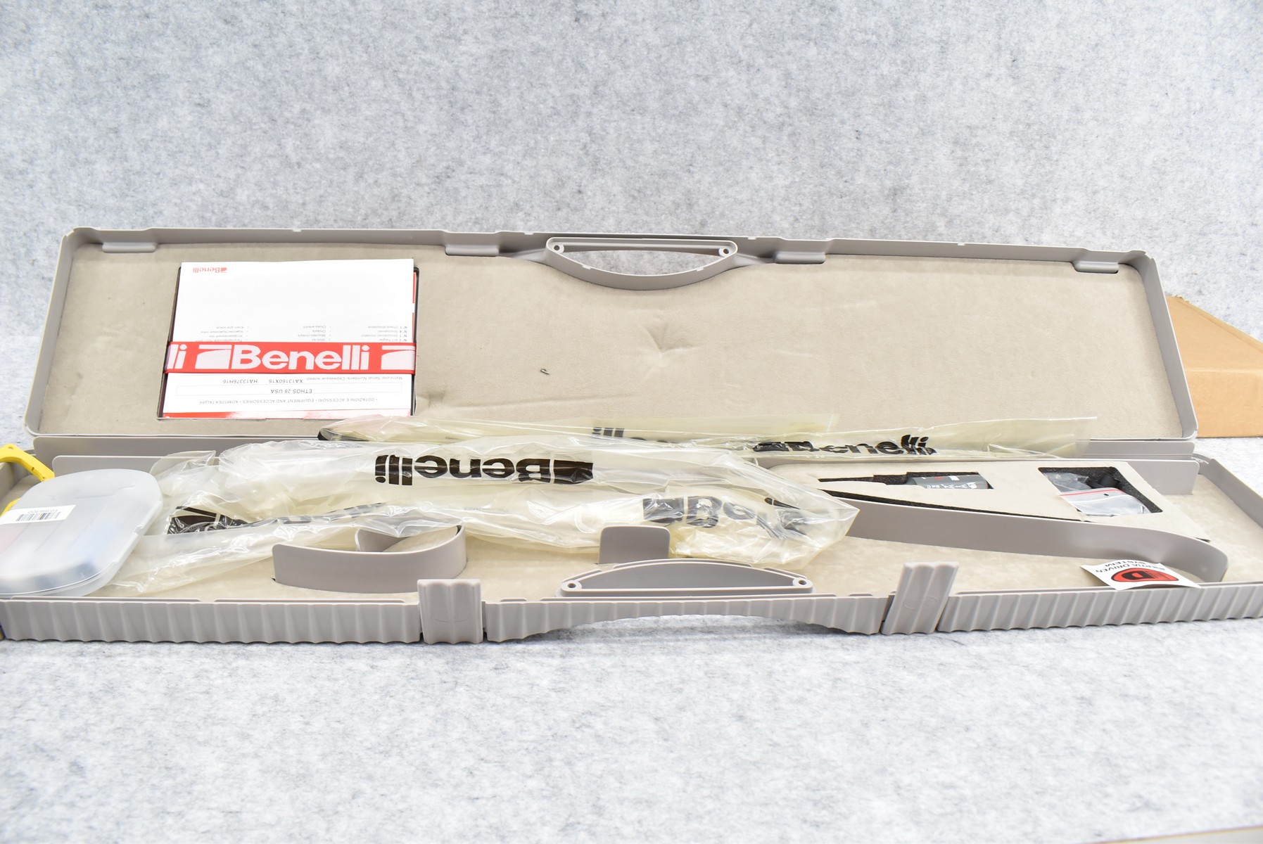 30R. Benelli – Mod. Ethos – 28ga. 3” Semi-Auto Shotgun – w/26” Vent Rib Choked Barrel w/Fiber Optic and Bead Sights – Stainless/Blued Finish – w/Deluxe Checkered Pistol Grip Wood Stock and Forearm w/Factory Progressive Comfort Black Rubber Butt Pad – Unfired w/Factory Hard Case, Shipping Box, Chokes, and Accessories