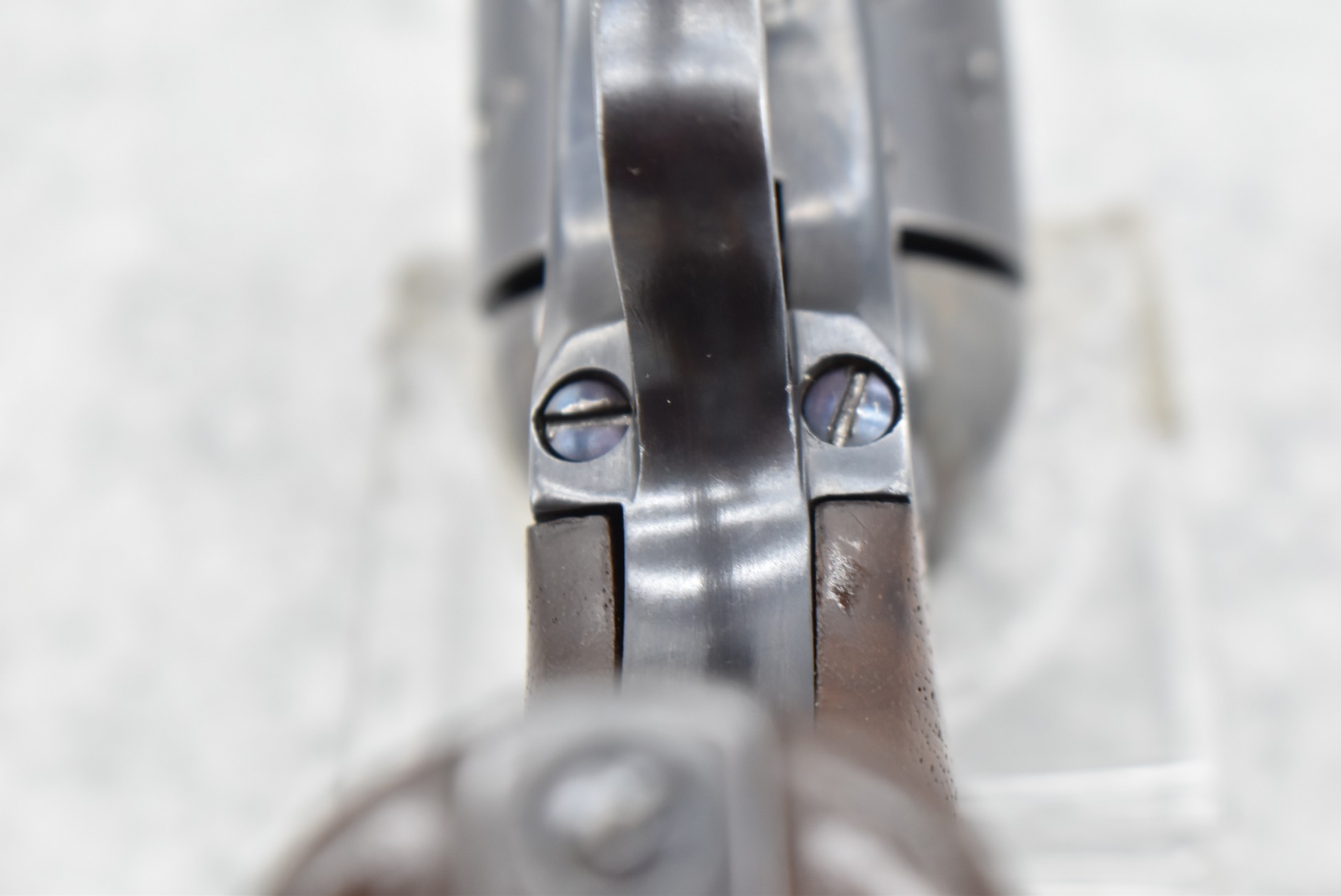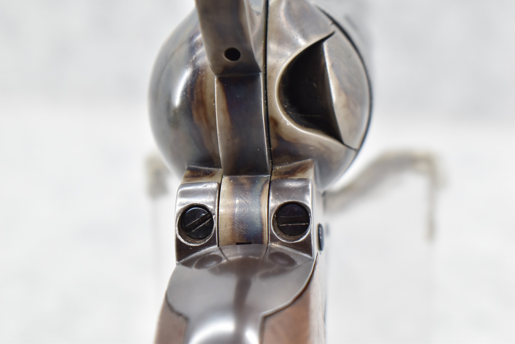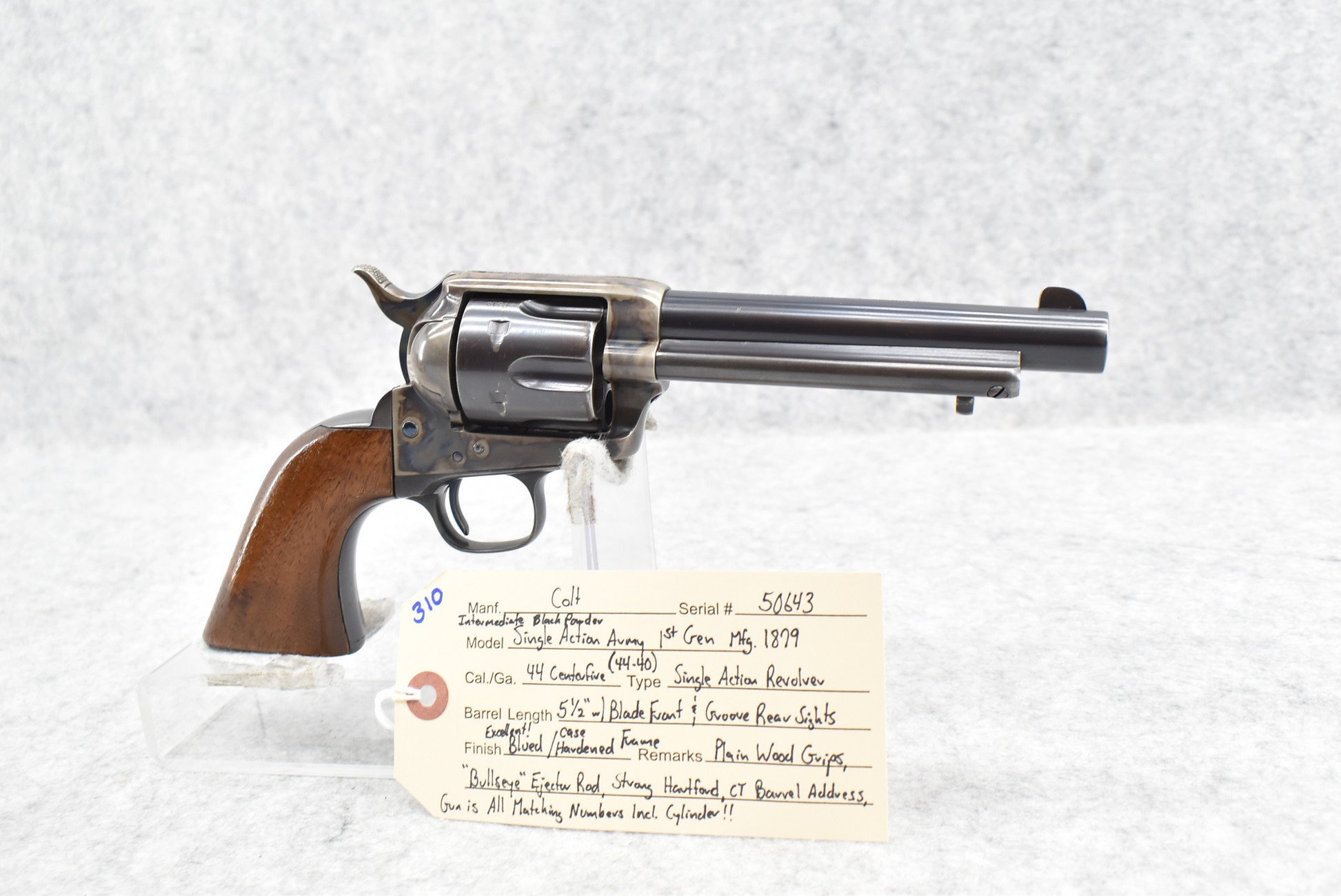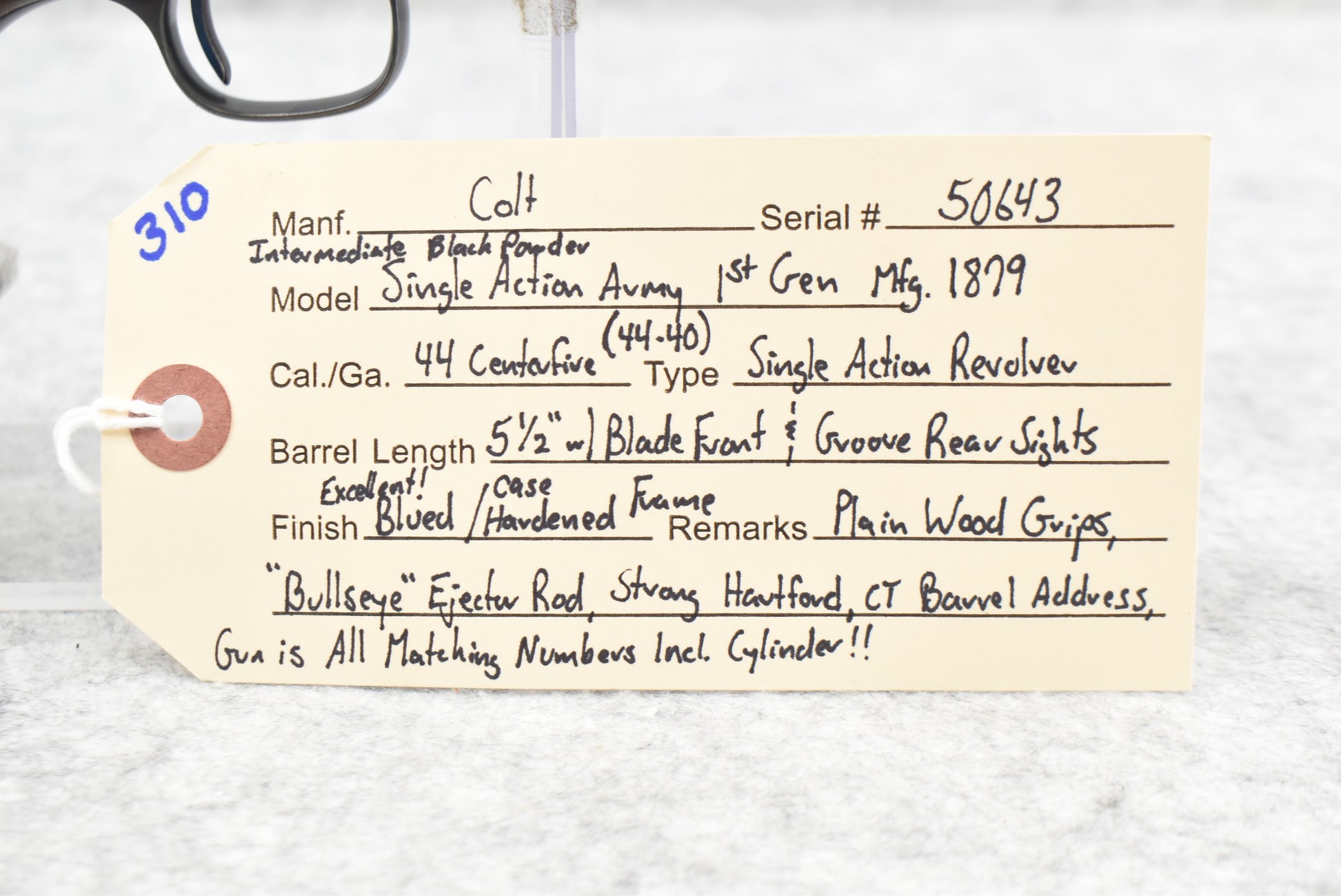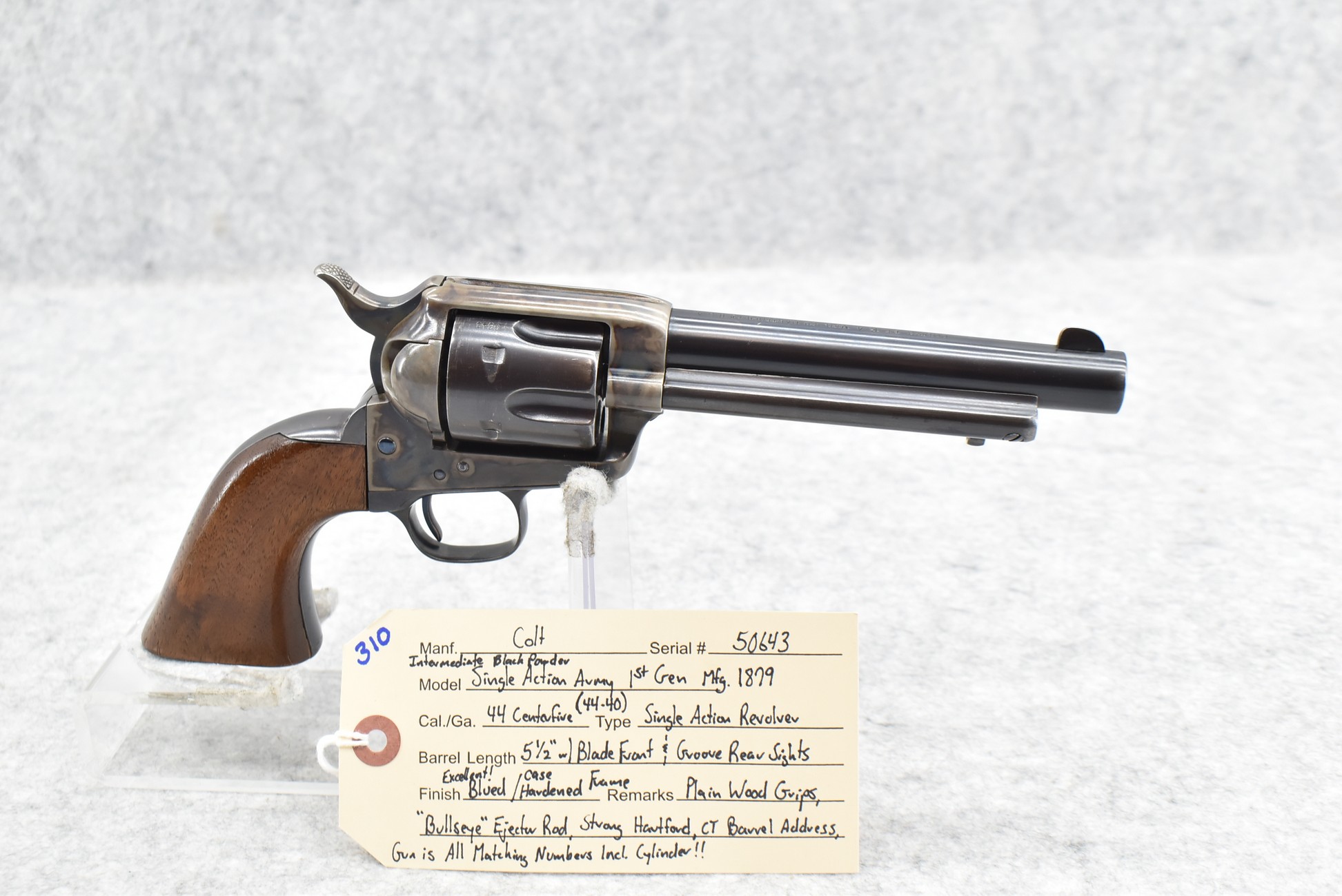 310. Colt – Mod. Intermediate Black Powder Single Action Army 1st Gen – 44 Centerfire (44-40) Cal. Single Action Revolver – w/5½” Barrel w/Blade Front and Groove Rear Sights – Excellent Blued Finish w/Case Hardened Frame – w/Plain Wood Grips – w/“Bullseye” Ejector Rod – w/Strong Hartford, CT Barrel Address – Gun is All Matching Numbered Including the Cylinder! – Manufactured 1879