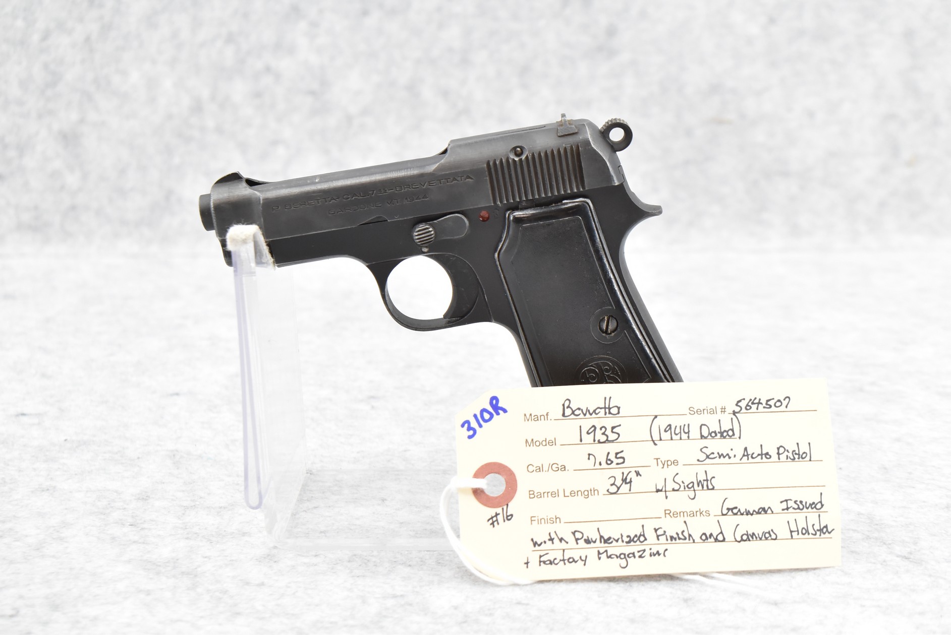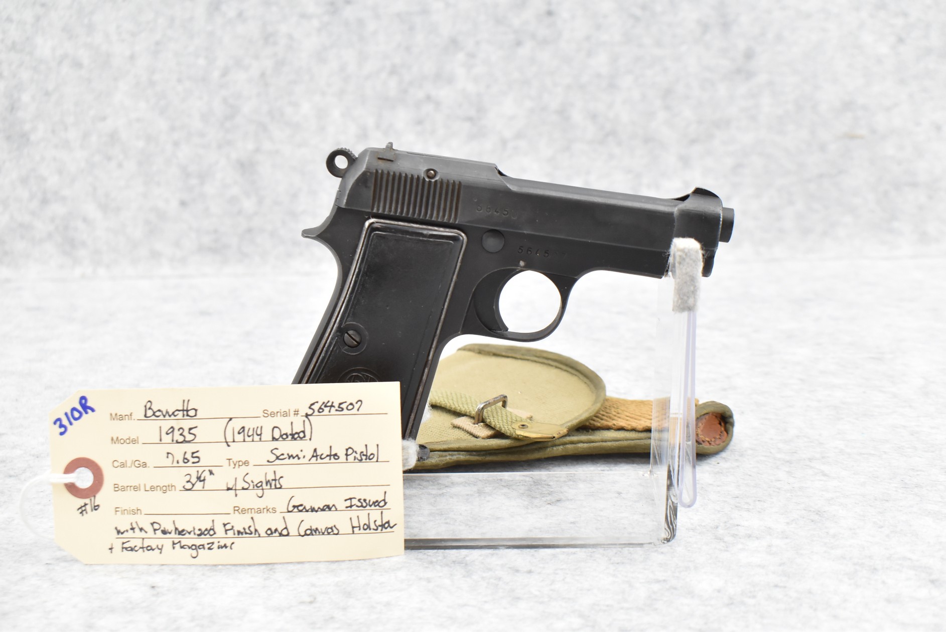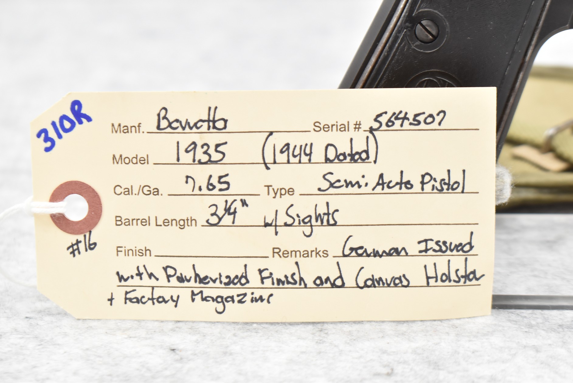 310R. Beretta – Mod. 1935 (1944 Dated) – 7.65 Cal. Semi-Auto Pistol – w/3 ¼” Barrel w/Sights – Parkerized Finish – w/Factory Magazine – German Issued w/Canvas Holster