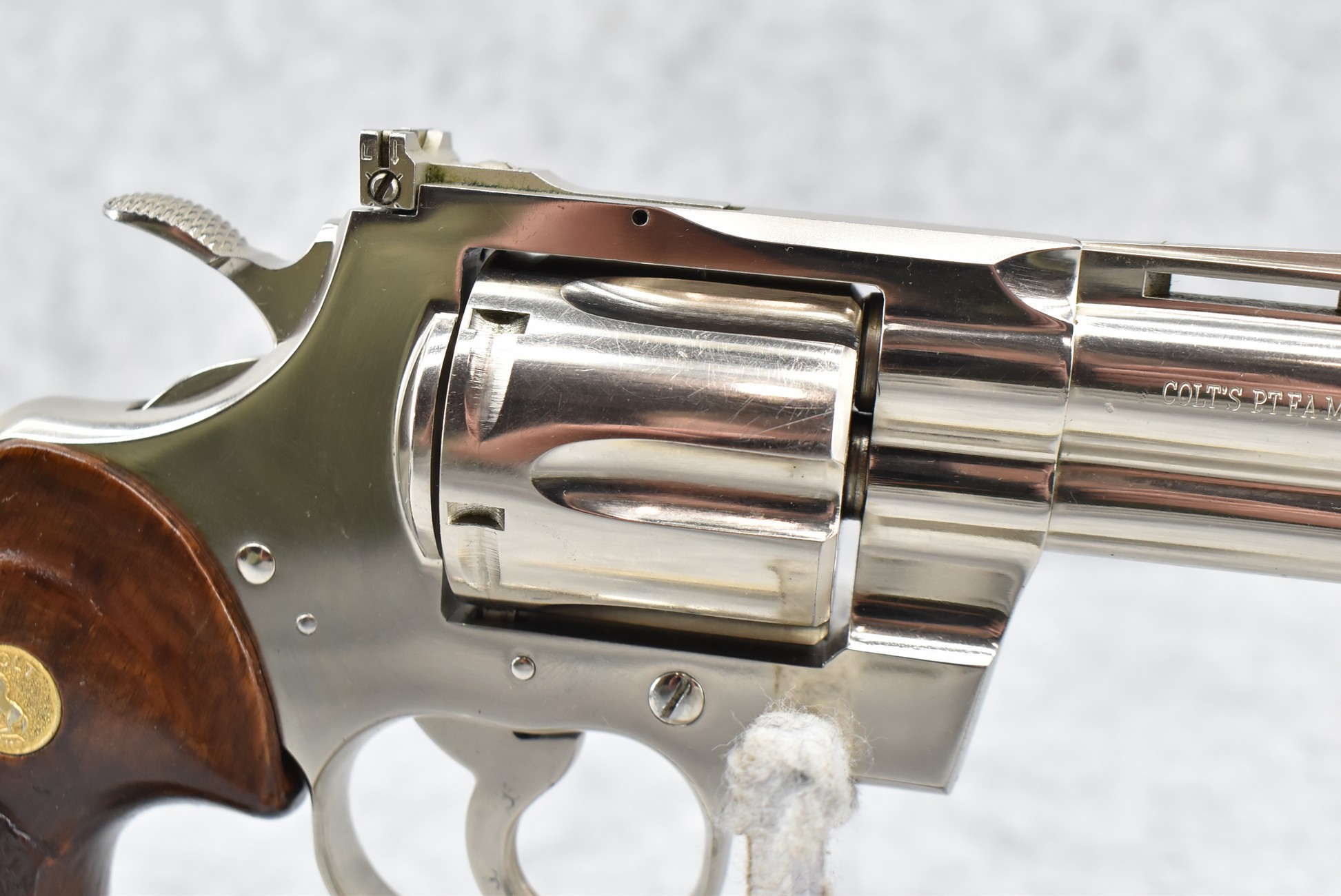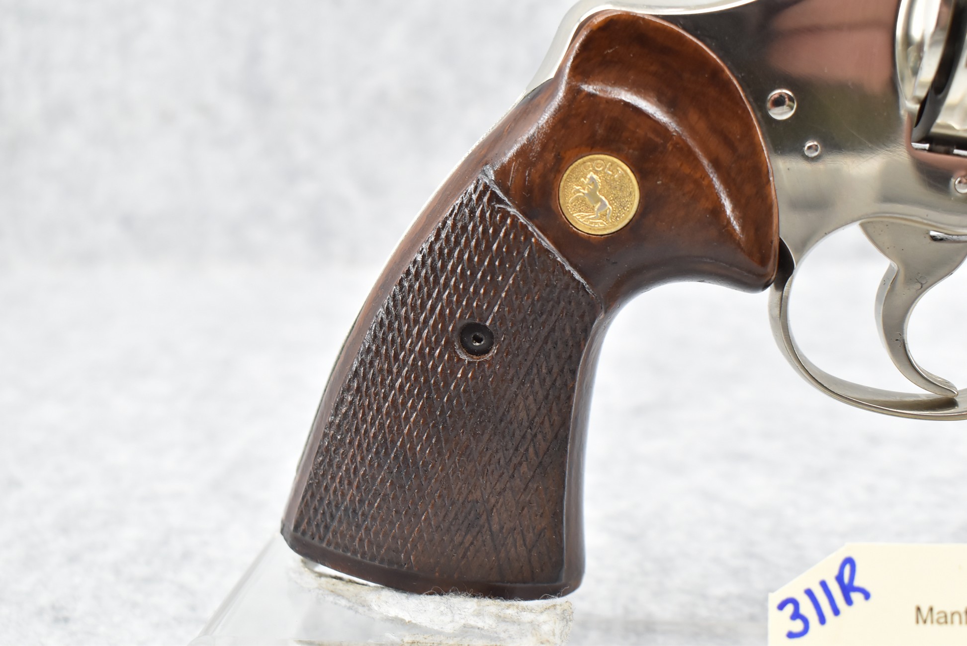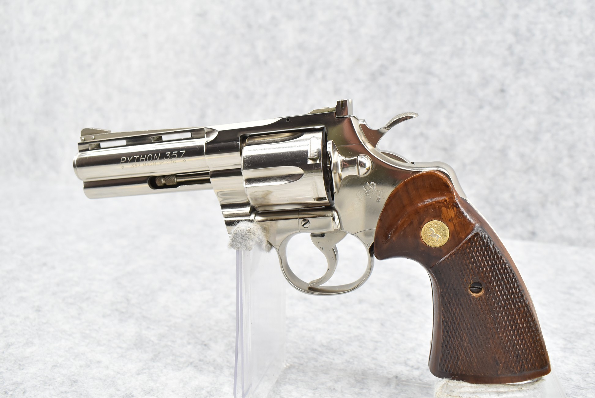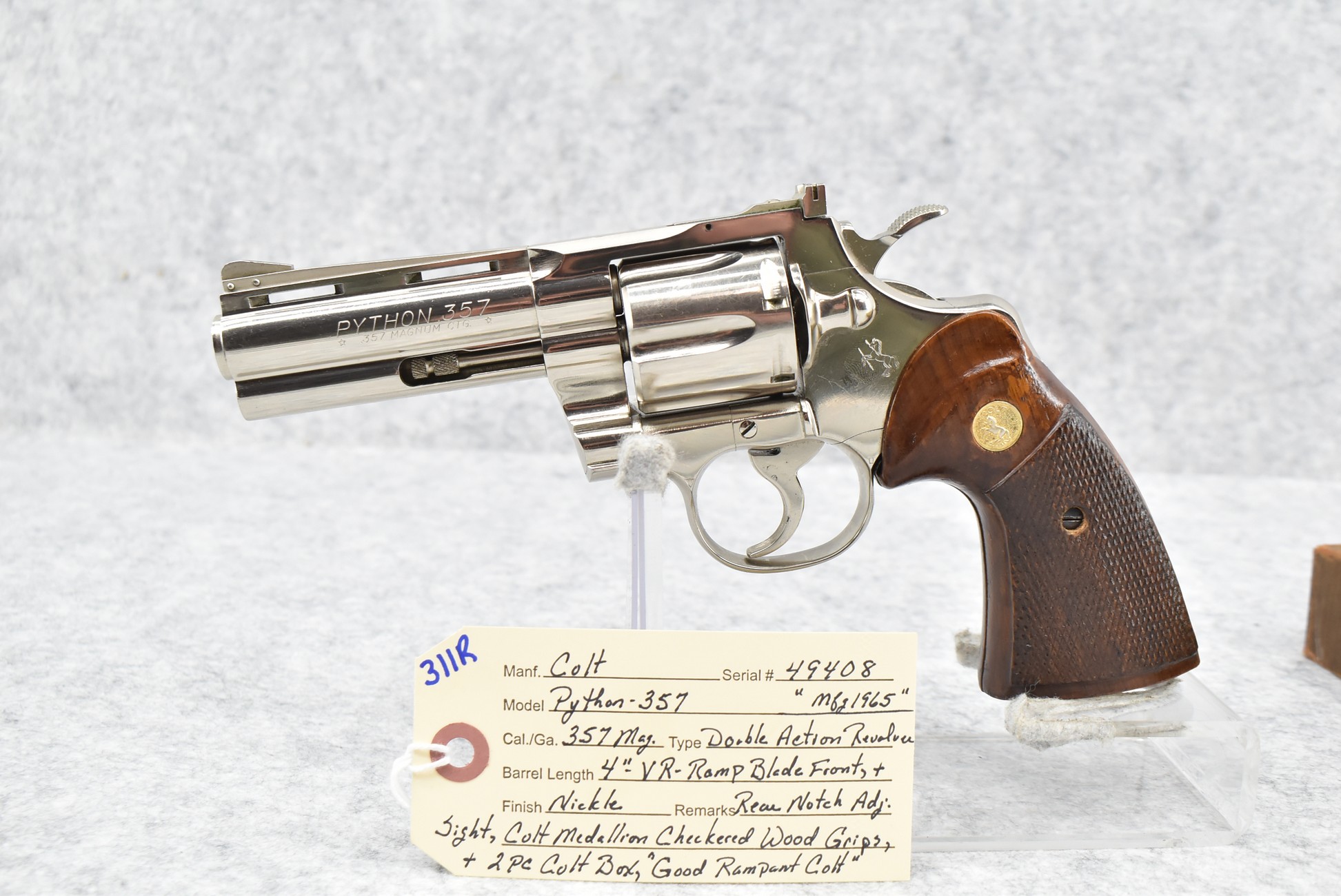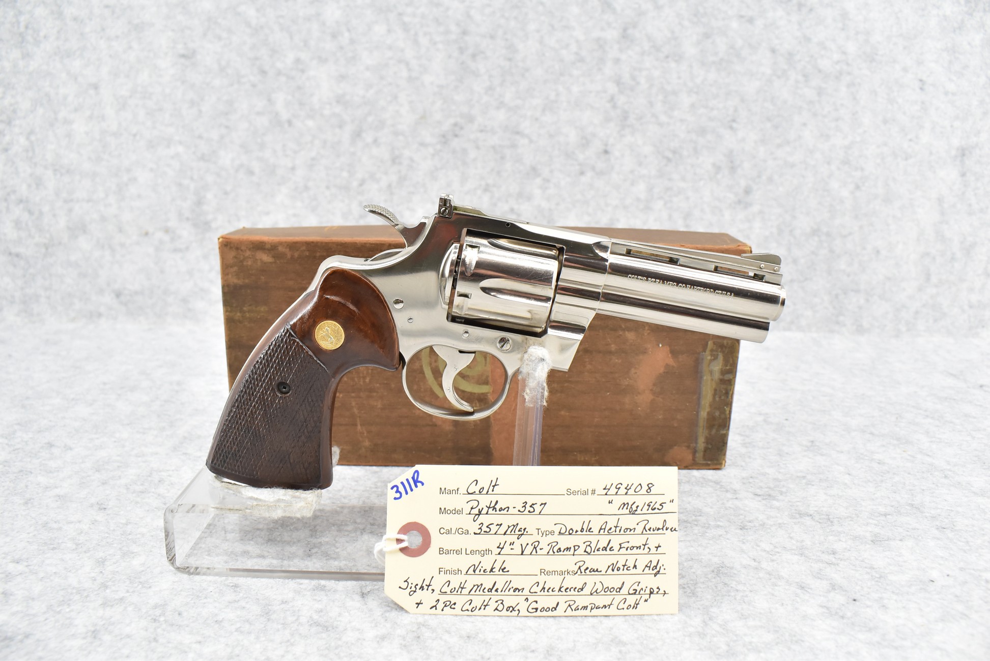 311R. Colt – Mod. Python – 357 Mag. Cal. Double Action Revolver – w/4” Vent-Rib Barrel w/Ramp Blade Front & Rear Notch Adj. Sights – Nickel Finish – w/Colt Medallion Checkered Wood Grips – w/Good Rampant Colt – w/A 2pc. Colt Box – Mfg. 1965