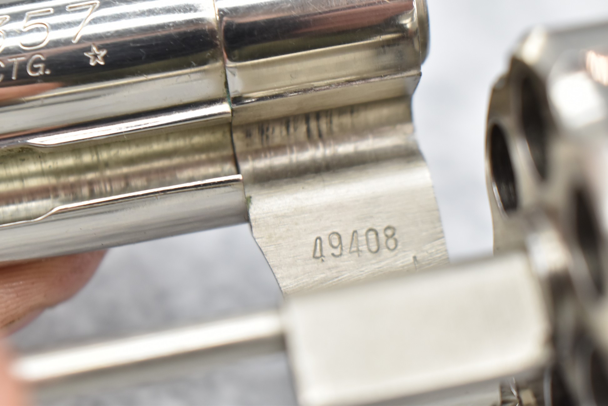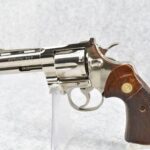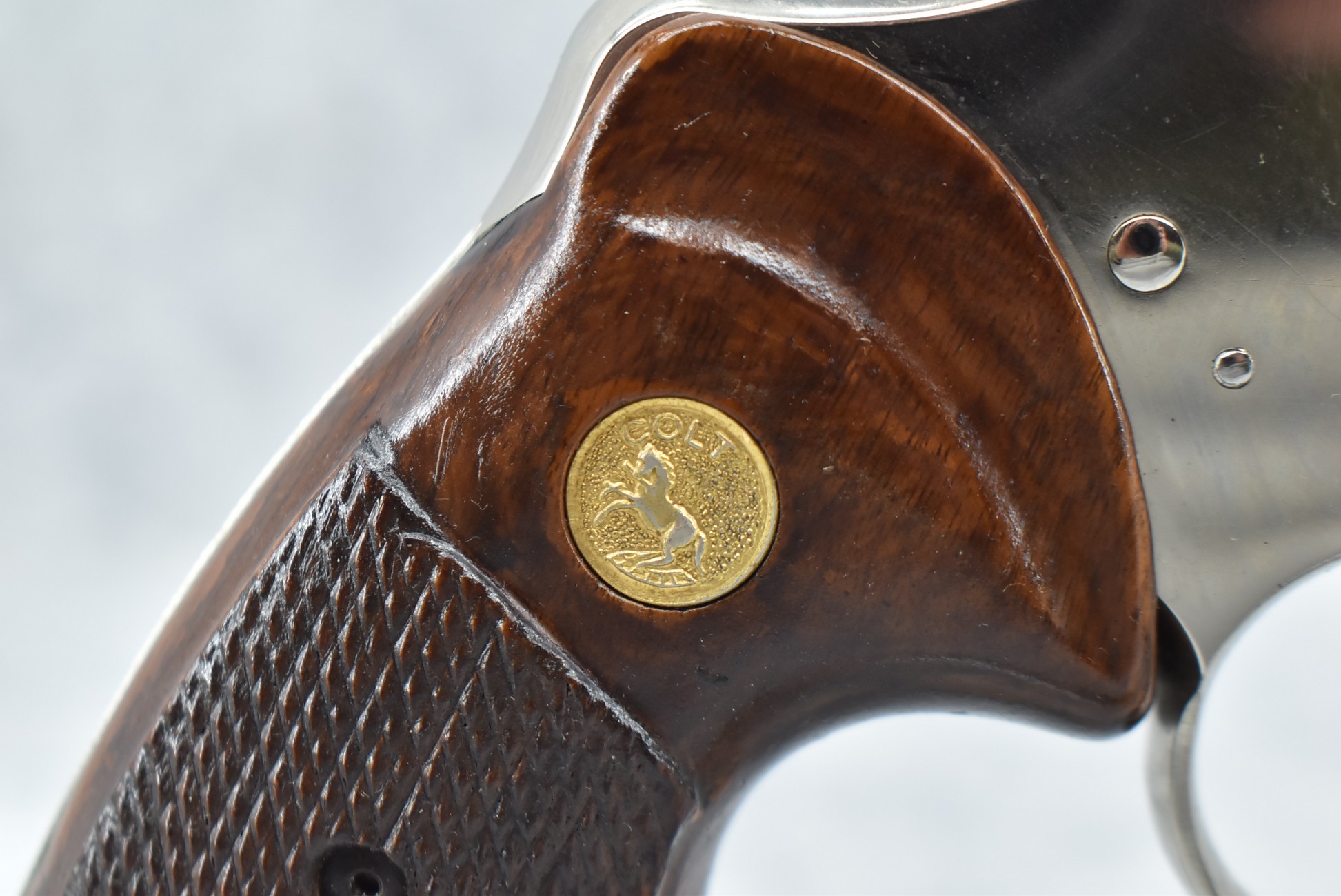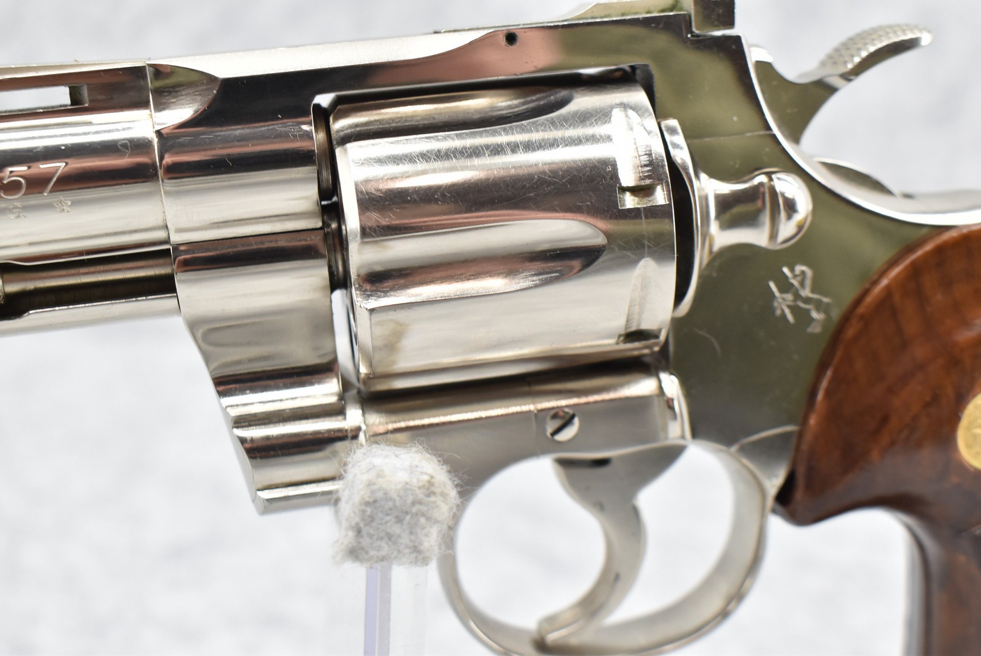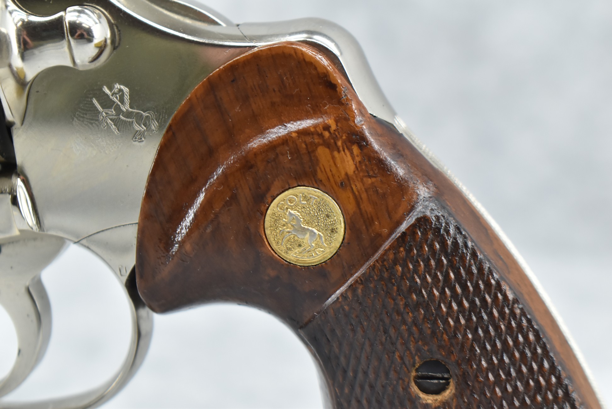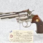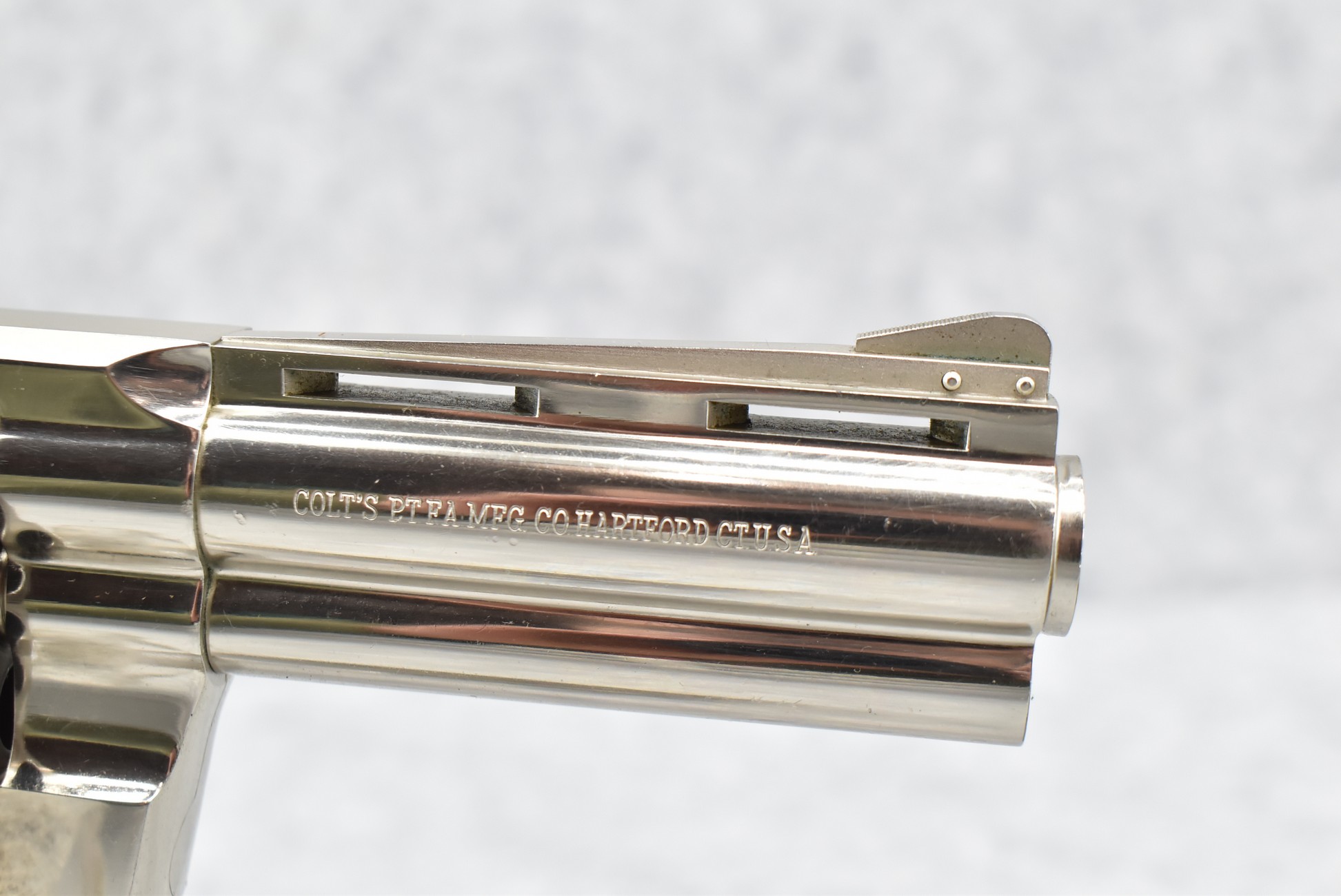 311R. Colt – Mod. Python – 357 Mag. Cal. Double Action Revolver – w/4” Vent-Rib Barrel w/Ramp Blade Front & Rear Notch Adj. Sights – Nickel Finish – w/Colt Medallion Checkered Wood Grips – w/Good Rampant Colt – w/A 2pc. Colt Box – Mfg. 1965