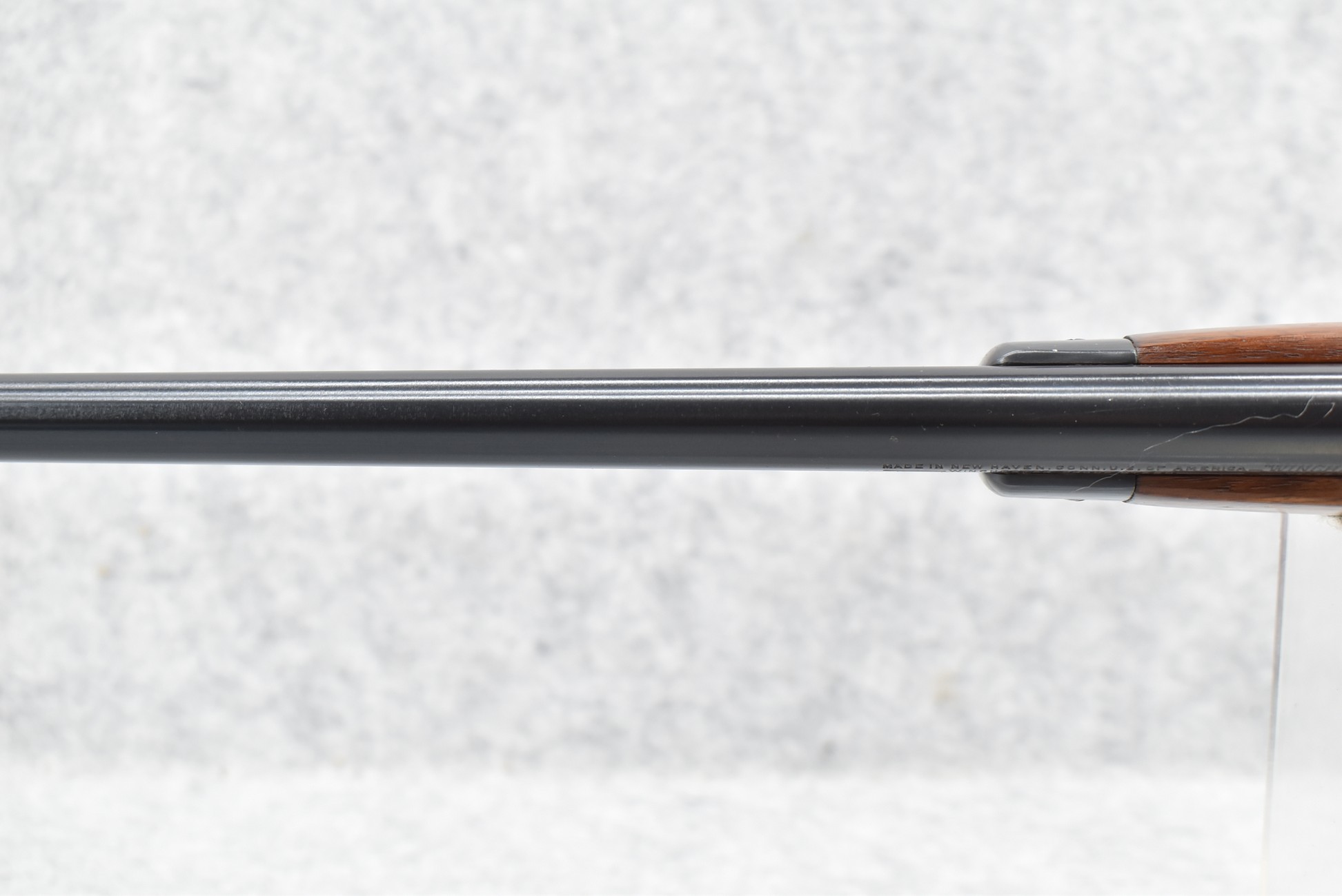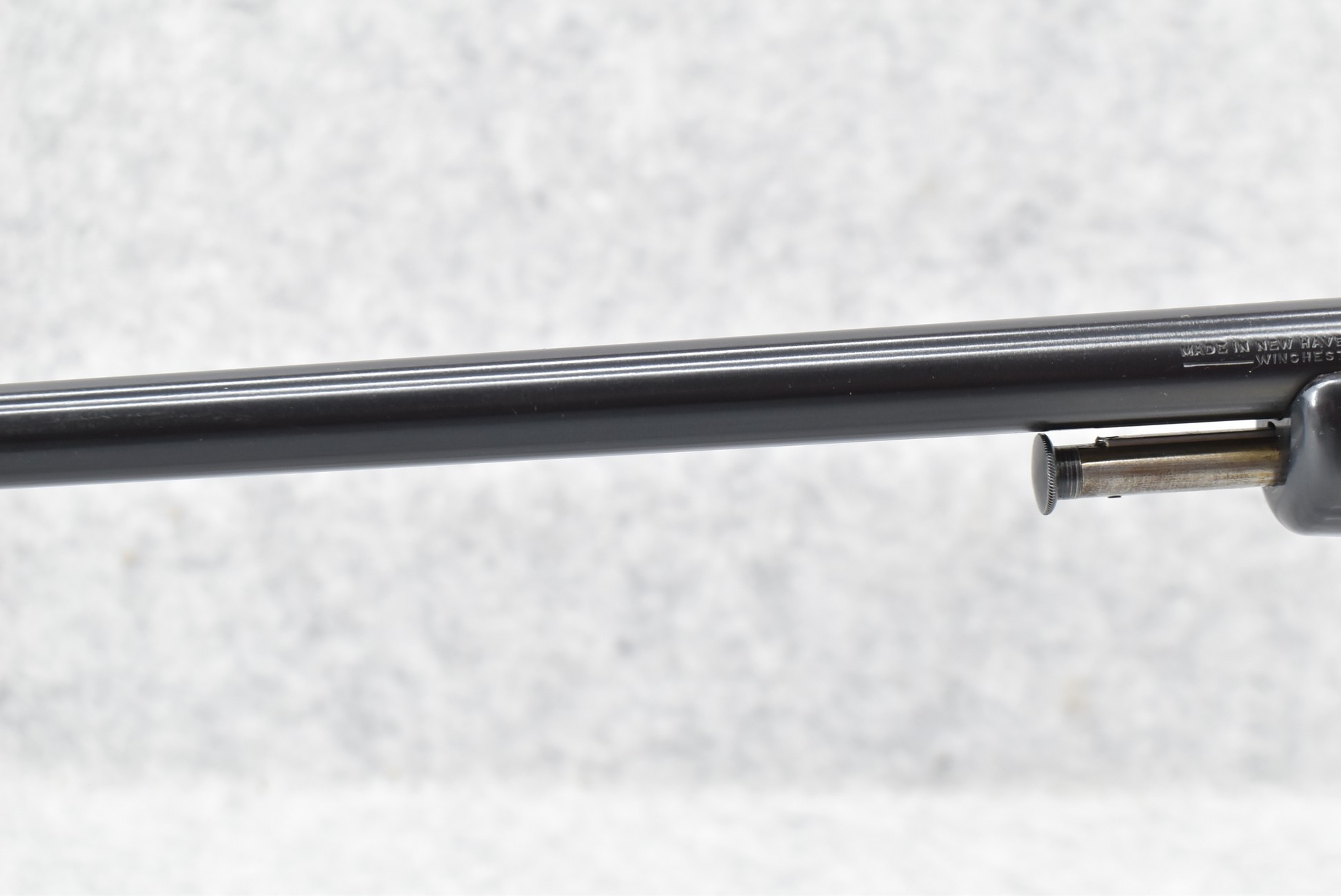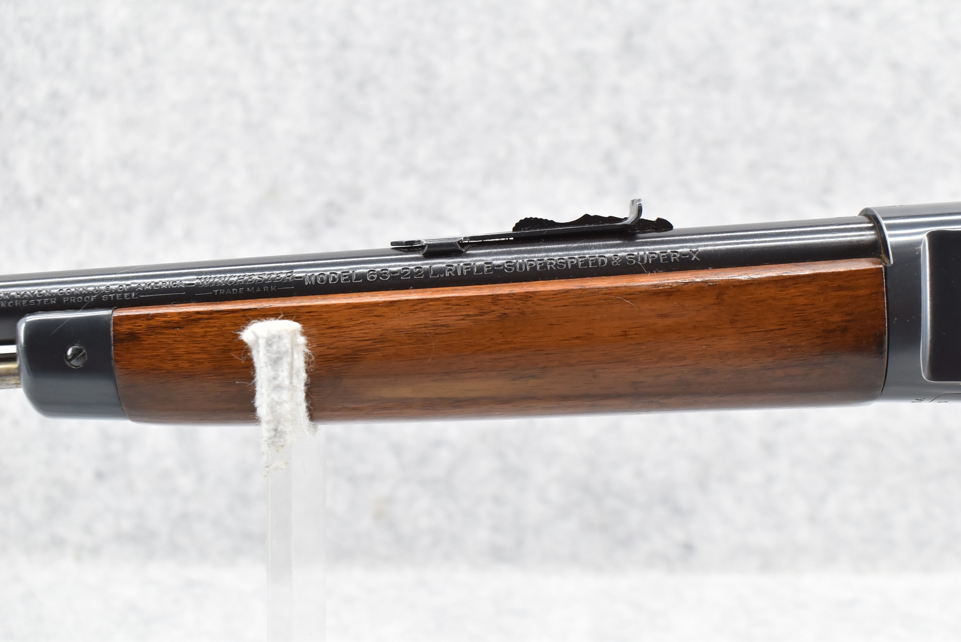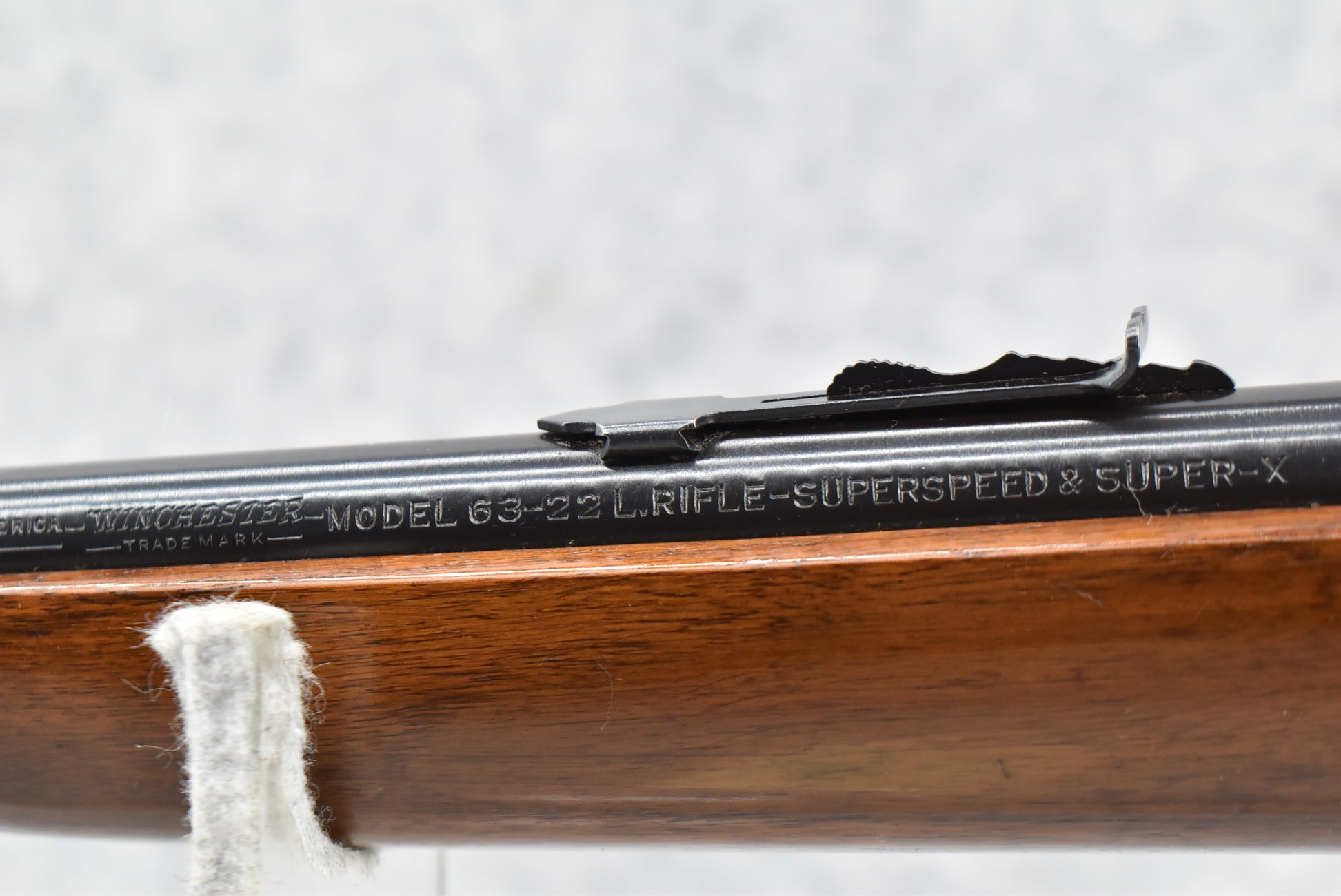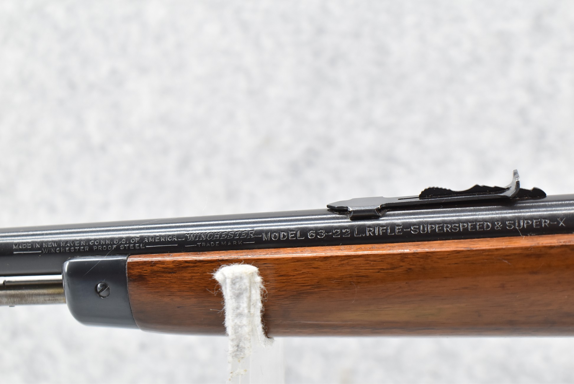 311R. Excellent! Winchester – Mod. 63 – 22LR Super Speed/Super X Cal. Semi-Auto Rifle – w/23” Barrel w/Beaded Front and Adjustable Sporting Rear Sights – Excellent Blued Finish – w/Pistol Grip Wood Stocks w/Factory Metal Butt Plate – w/Tubular Magazine Fed from Butt – Manufactured 1948 – As New w/Some Minor Handling Marks in Stock