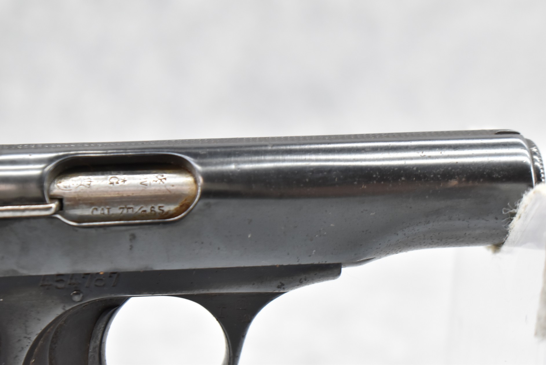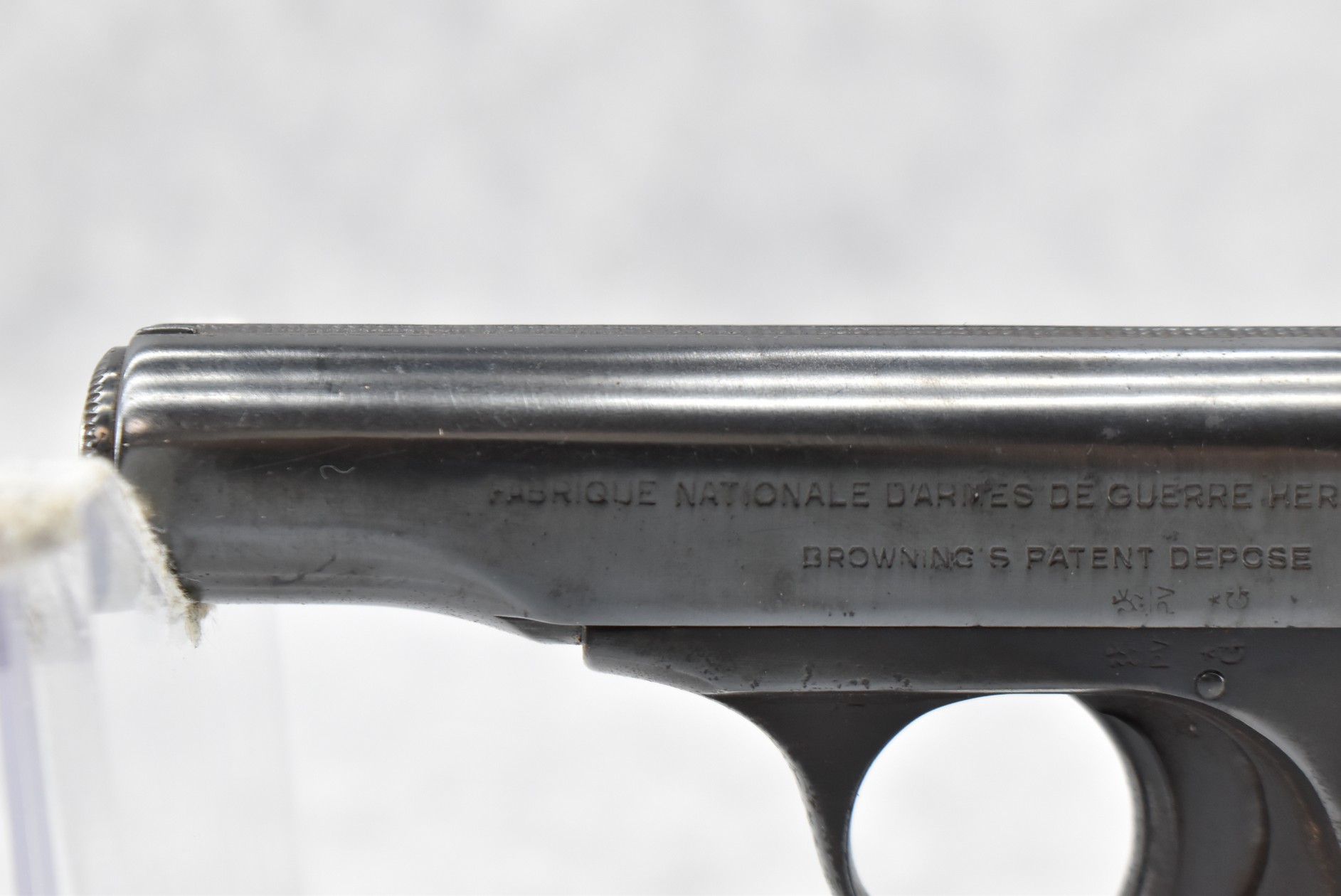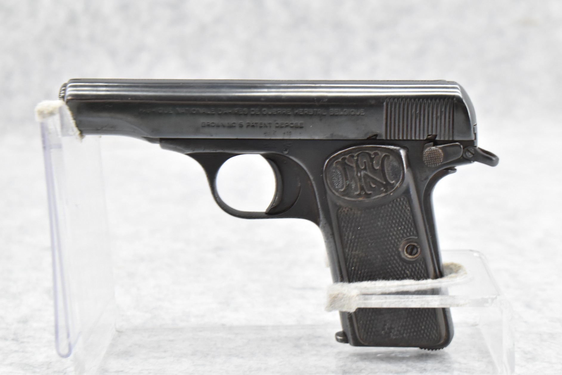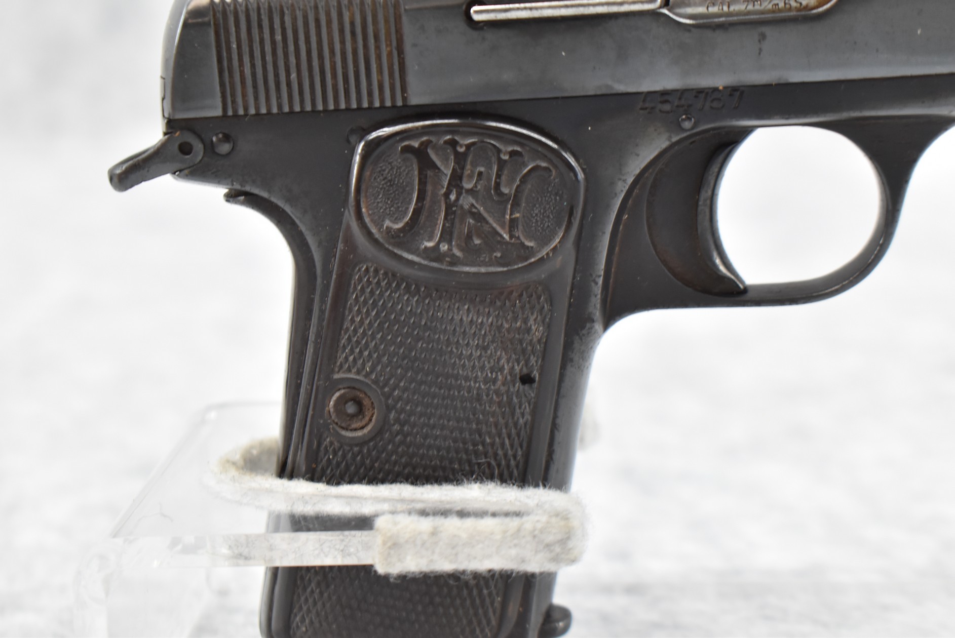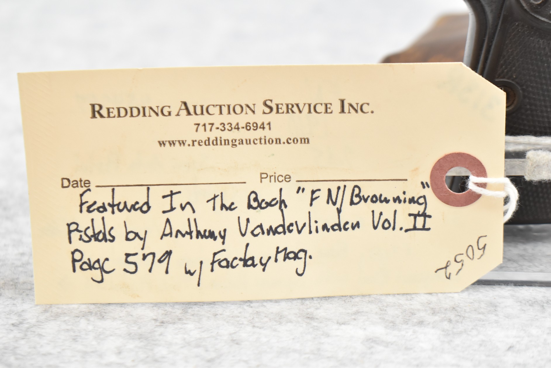 313R. FN – Mod. 1910 – 7.65 Cal. Semi-Auto Pistol – w/3 3/8” Barrel w/Sights – Re-Blued Finish – w/Factory Hard Rubber Grips – w/Factory Mag – Rare Japanese Purchase Contract w/Lanyard Ring w/Japanese Holster – This Pistol is Featured in the Book “FN/Browning Pistols, Vol. II” by Anthony Vanderlinden on Page 579