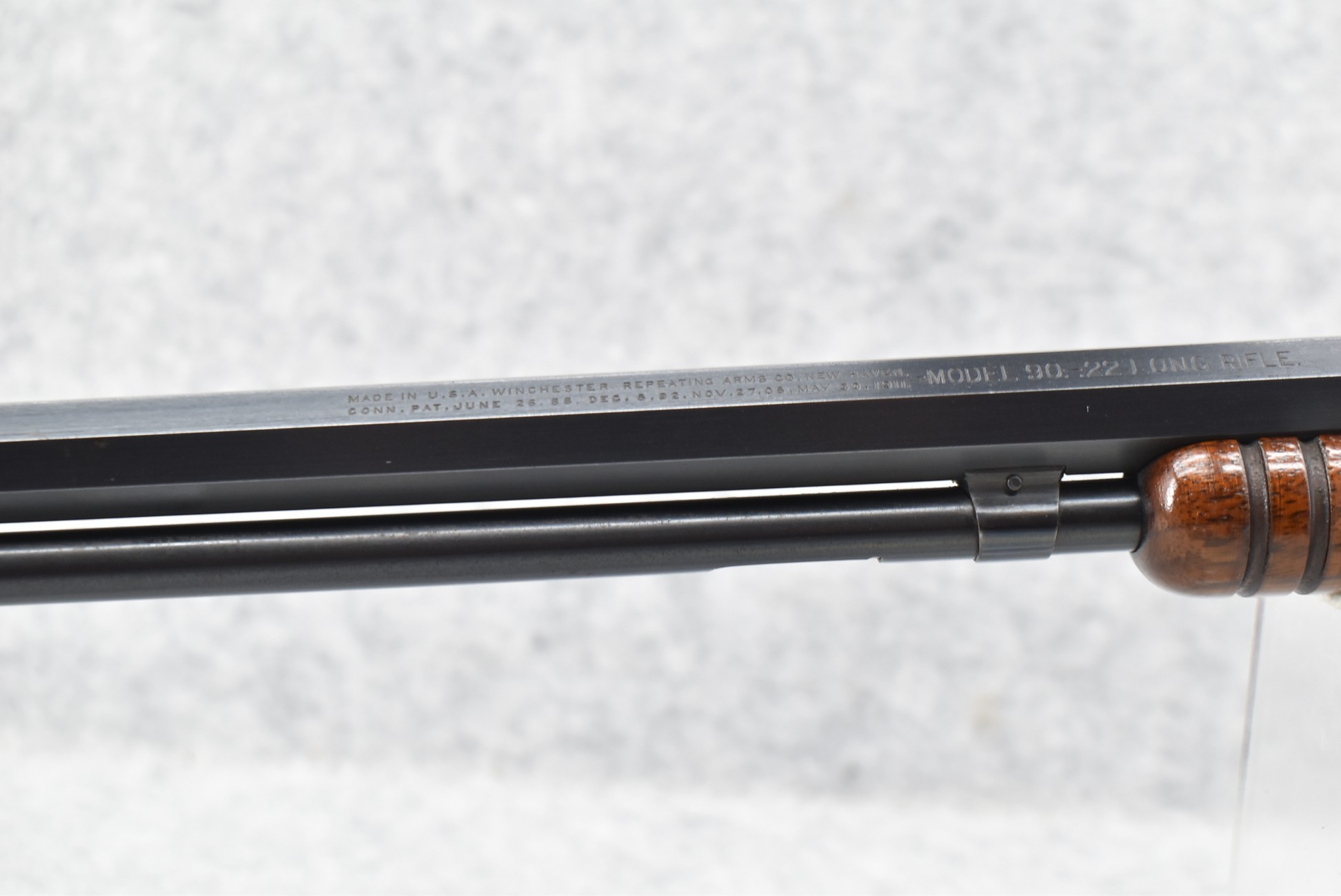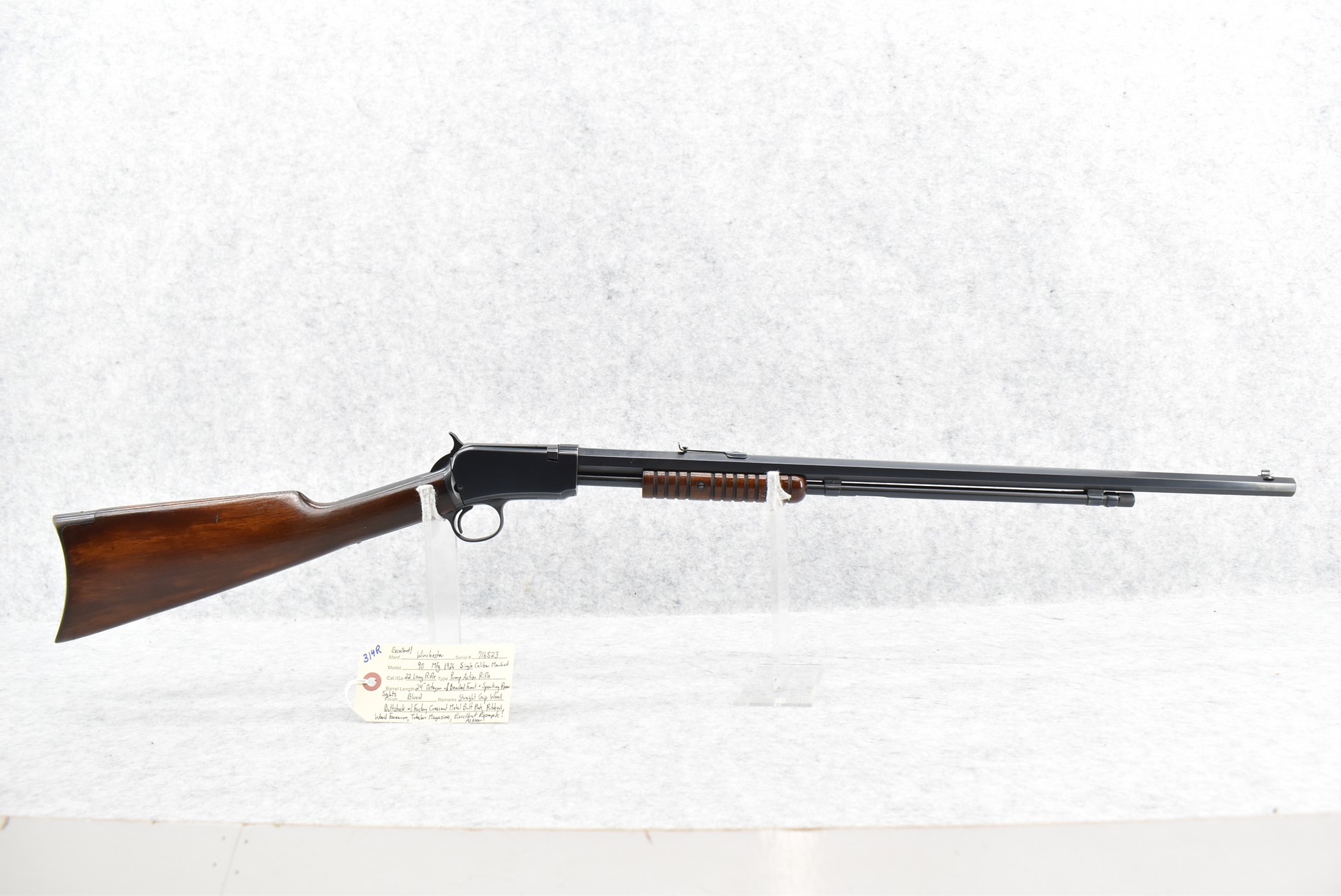 314R. Excellent! Winchester – Mod. 90 Single Caliber Marked – 22LR Cal. Pump Action Rifle – w/24” Octagon Barrel w/Beaded Front and Sporting Rear Sights – Blued Finish – w/Straight Grip Wood Buttstock and Ribbed Wood Forearm w/Factory Crescent Metal Butt Plate – w/Tubular Magazine – Manufactured 1926 – As New, Excellent Example!