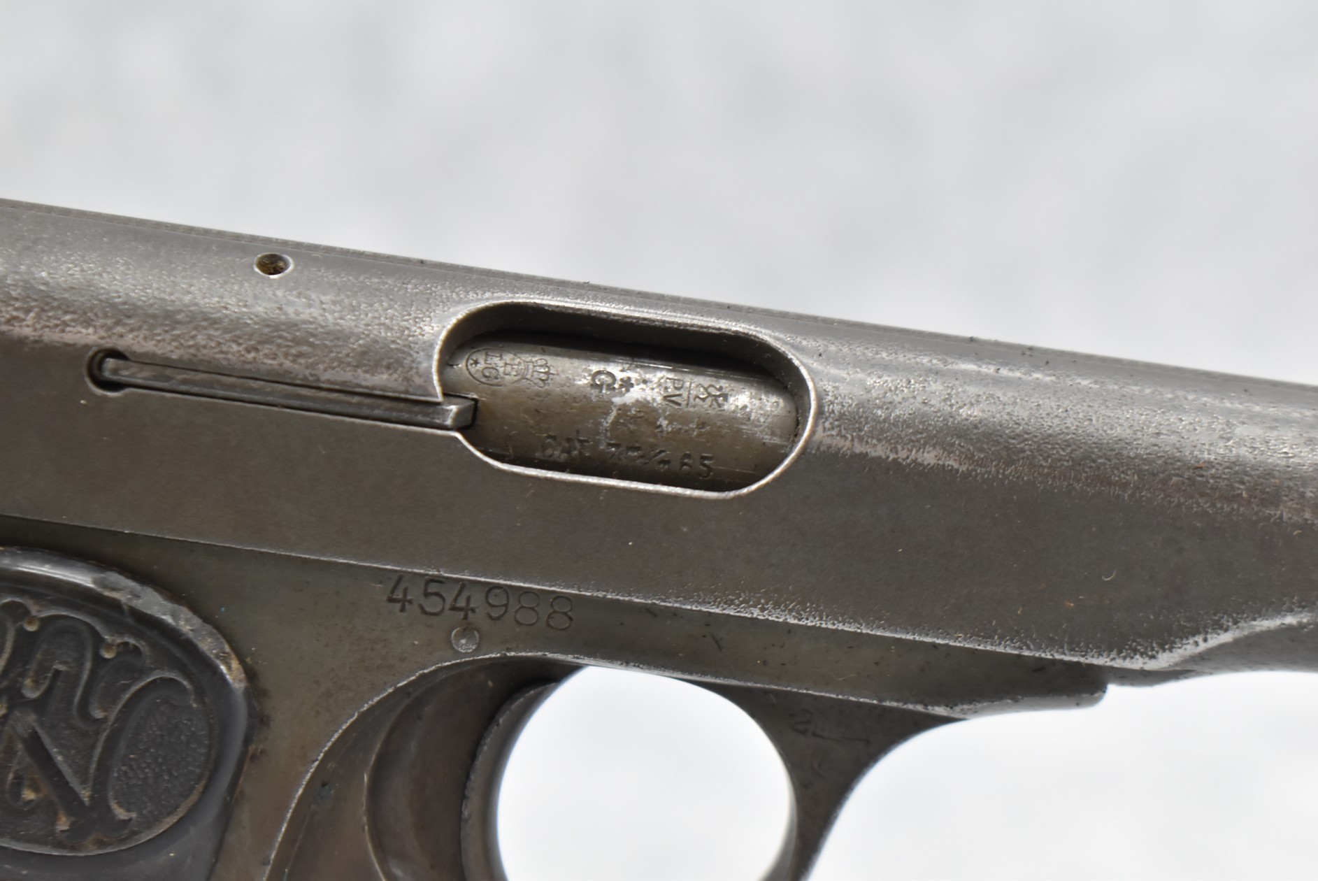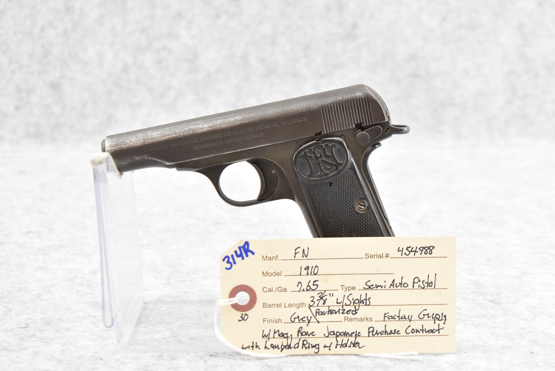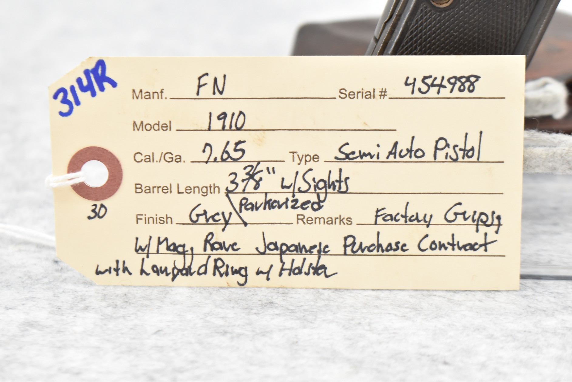 314R. FN – Mod. 1910 – 7.65 Cal. Semi-Auto Pistol – w/3 3/8” Barrel w/Sights – Gray/Parkerized Finish – w/Factory Grips – w/Mag – Rare Japanese Purchase Contract w/Lanyard Ring & Holster
