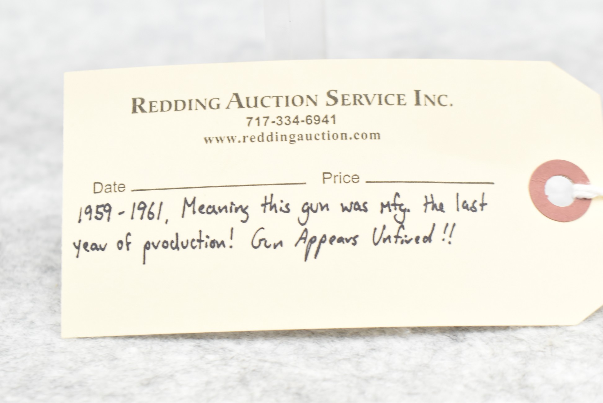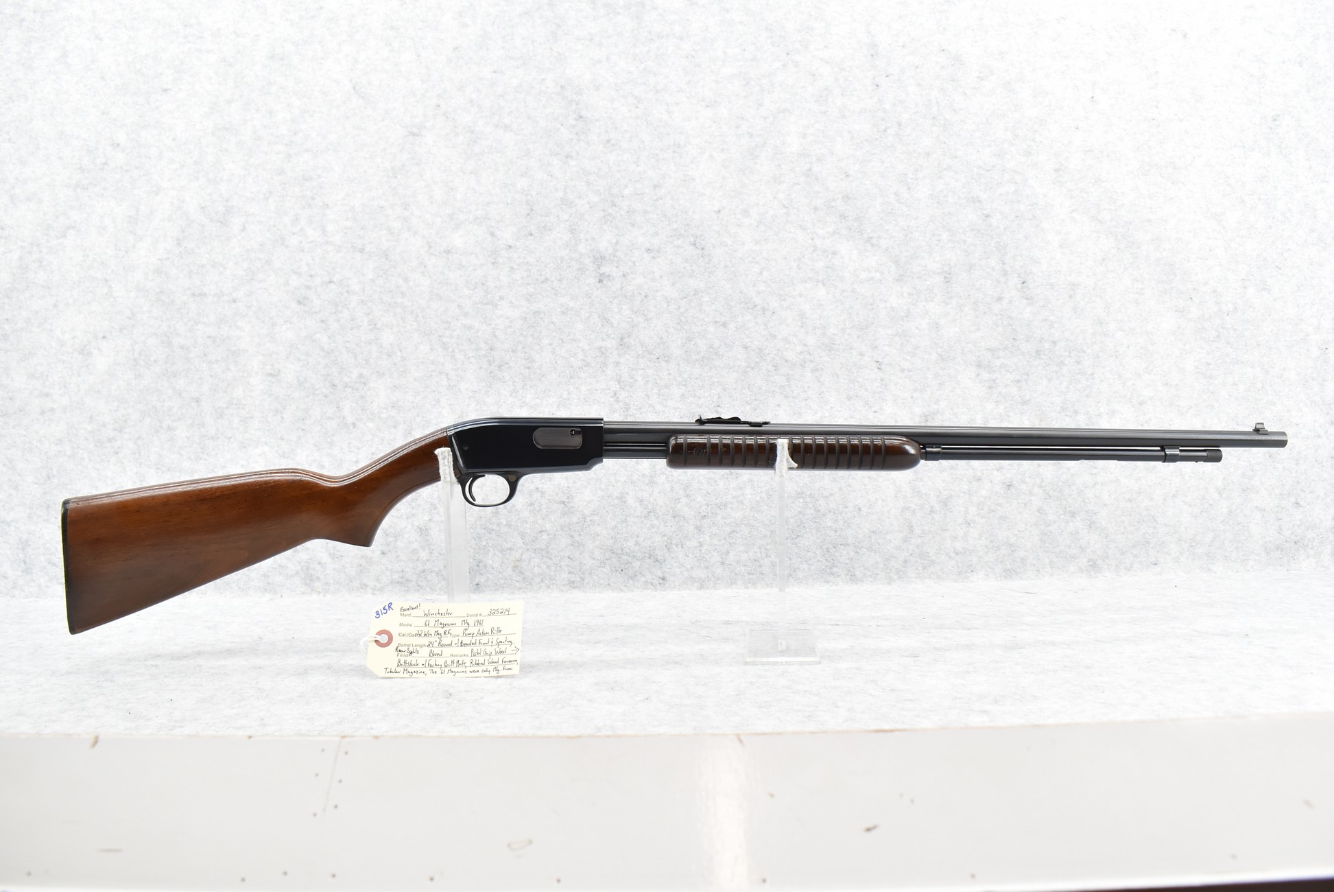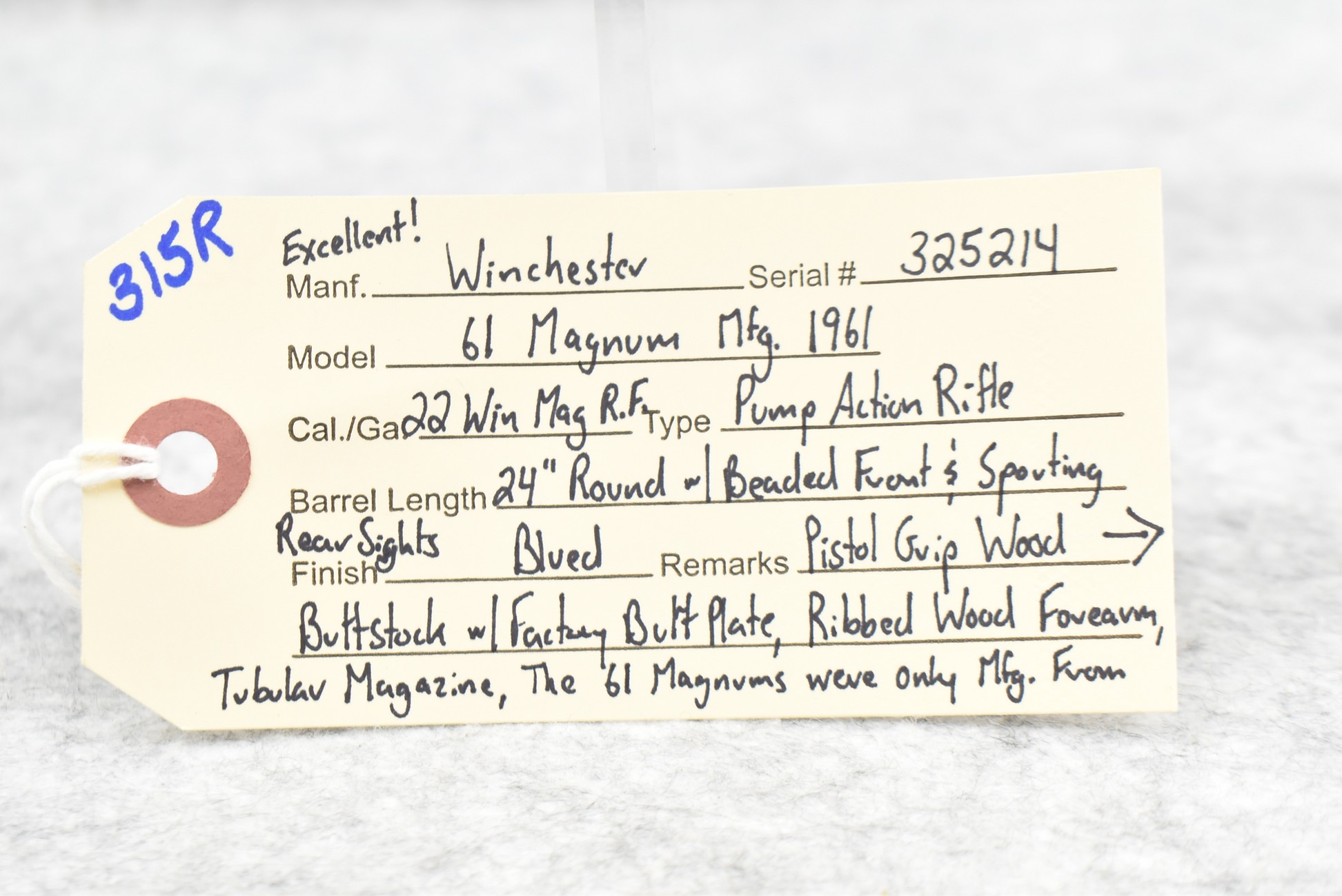 315R. Excellent! Winchester – Mod. 61 Magnum – 22 Win. Mag. Rimfire Cal. Pump Action Rifle – w/24” Round Barrel w/Beaded Front and Sporting Rear Sights – Blued Finish – w/Pistol Grip Wood Butt Stock and Ribbed Wood Forearm w/Factory Butt Plate – w/Tubular Magazine – Manufactured 1961 – The 61 Magnums were Only Manufactured from 1959-1961, Meaning this Gun was Manufactured the Last Year of Production! – Gun Appears Unfired!!