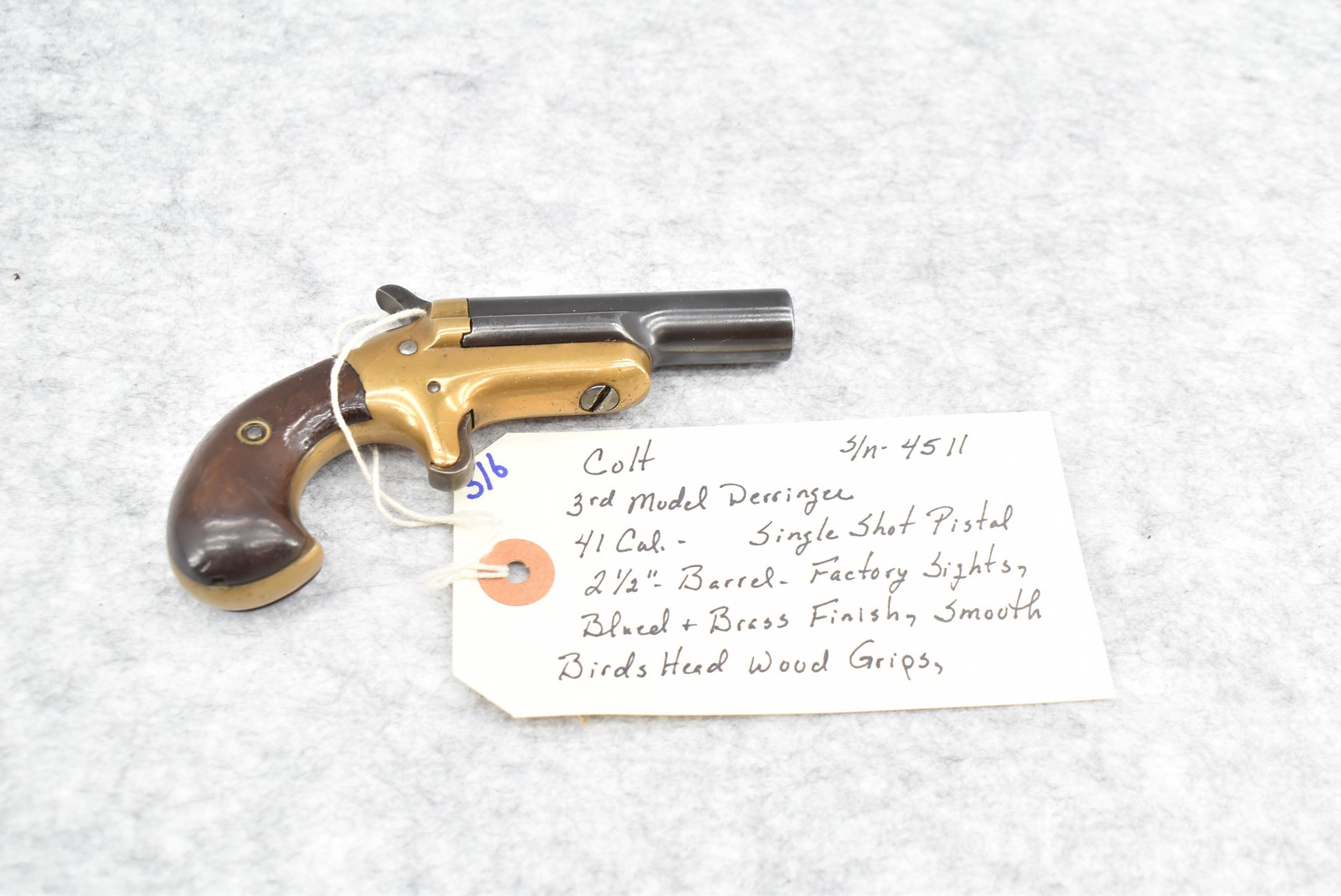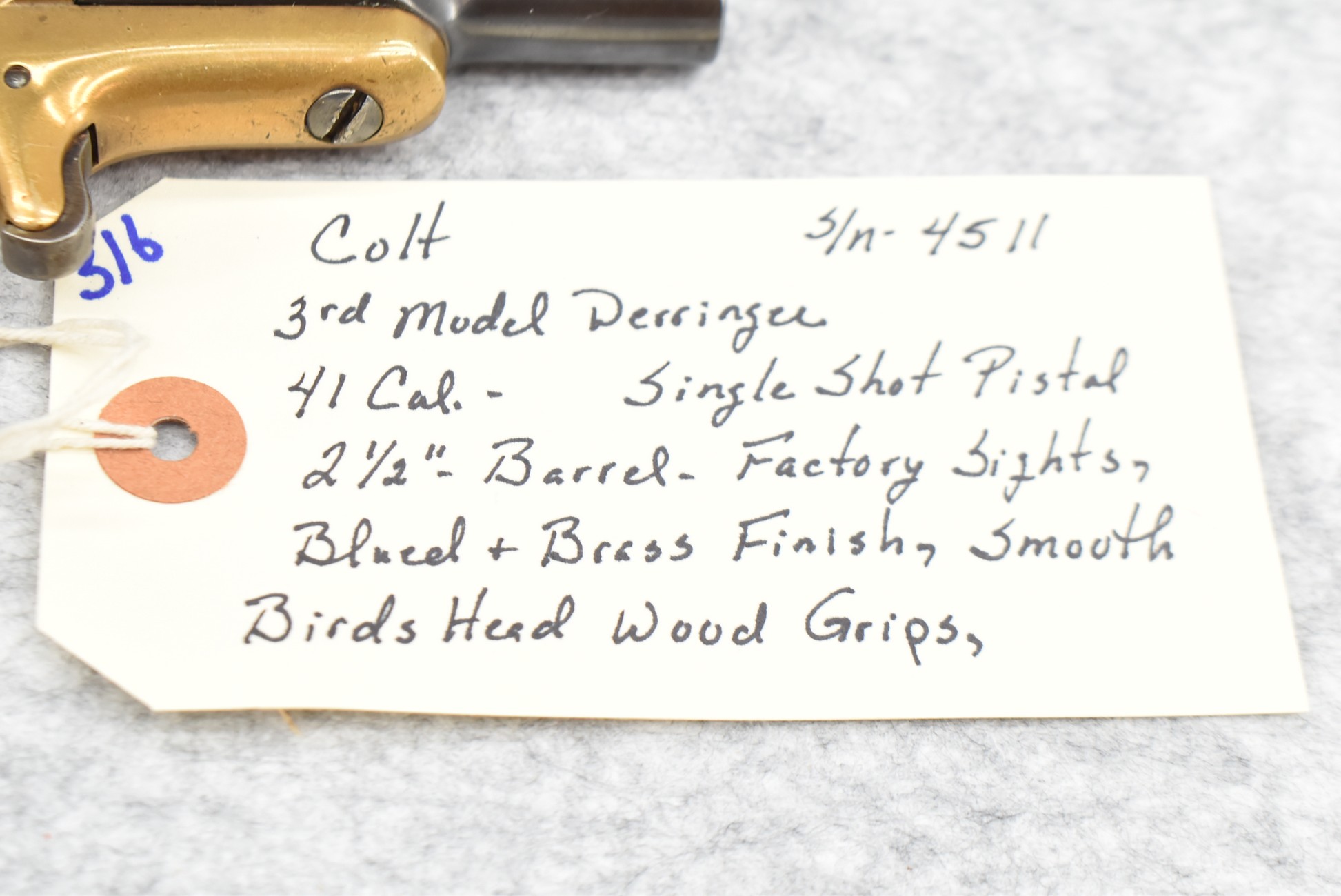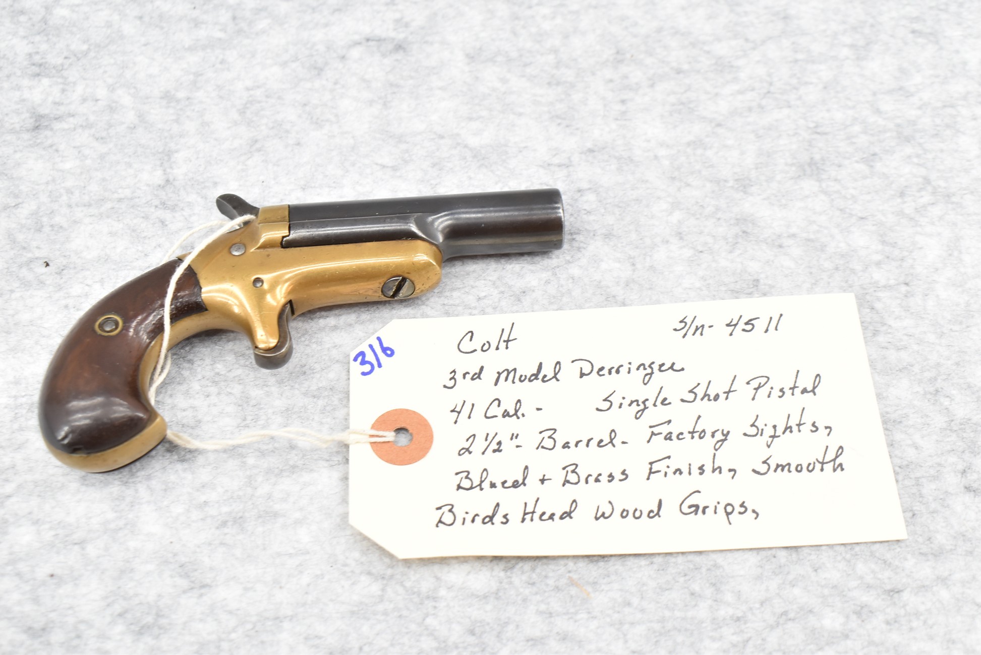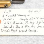 316. Colt – 3rd Model Derringer – 41 Cal. Single Shot Derringer – w/2 ½” Barrel w/Factory Sights – Blued/Brass Finish – w/Smooth Birds Head Wood Grips