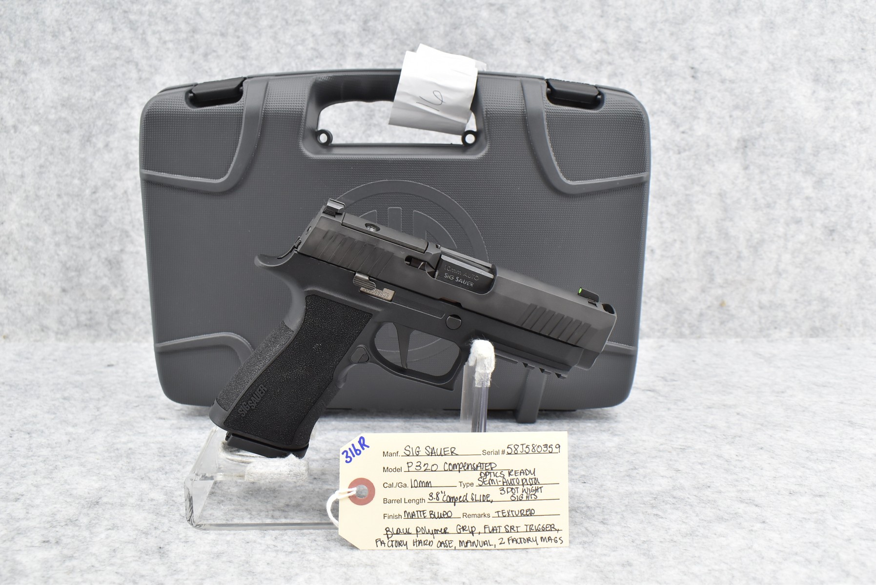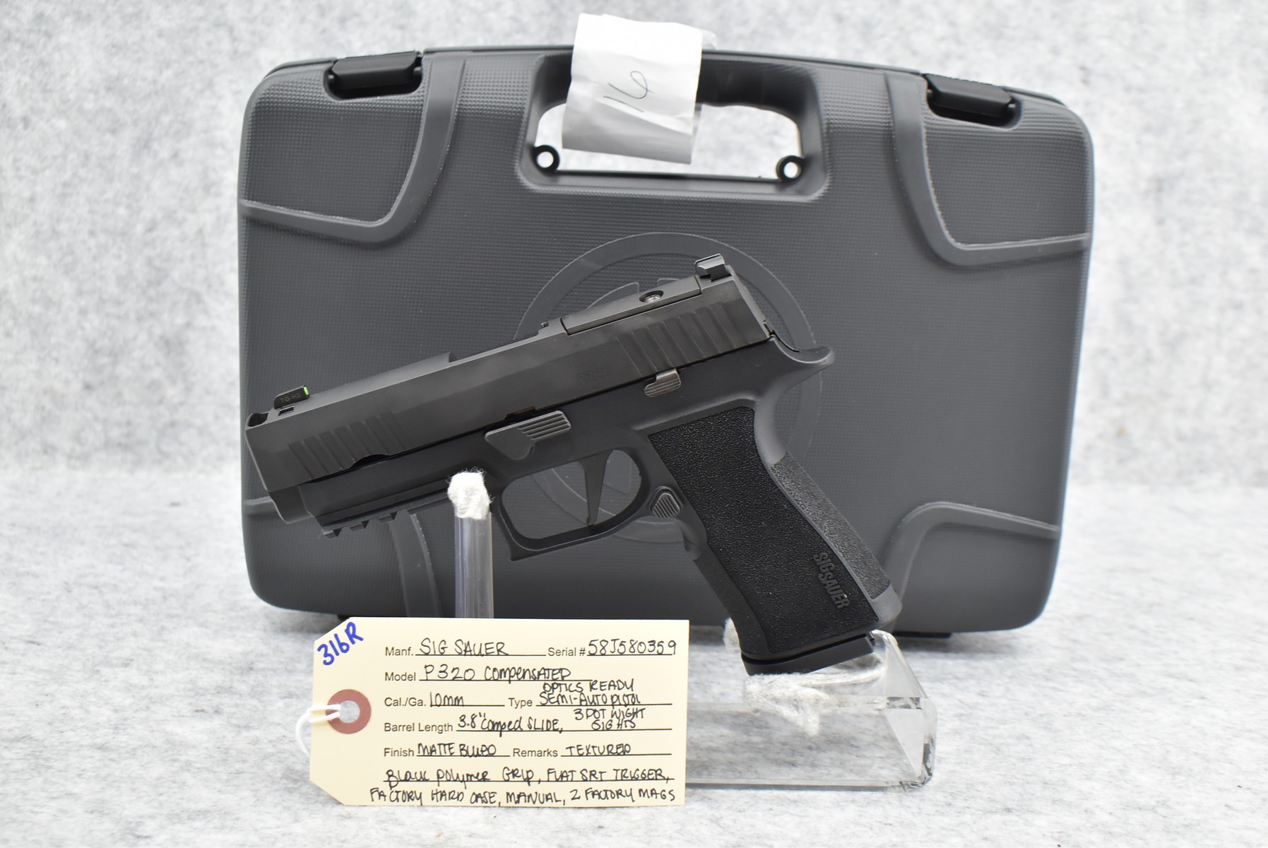316R. Sig Sauer – Mod. P320 Compensated – 10mm Semi-Auto Pistol – w/3.8” Barrel w/3-Dot Night Sights – Matte Blued Finish – w/Comped Slide – w/Black Polymer Grip – w/Flat SRT Trigger – w/Factory Hard Case, Manual & 2 Factory 15Rd Mags