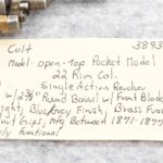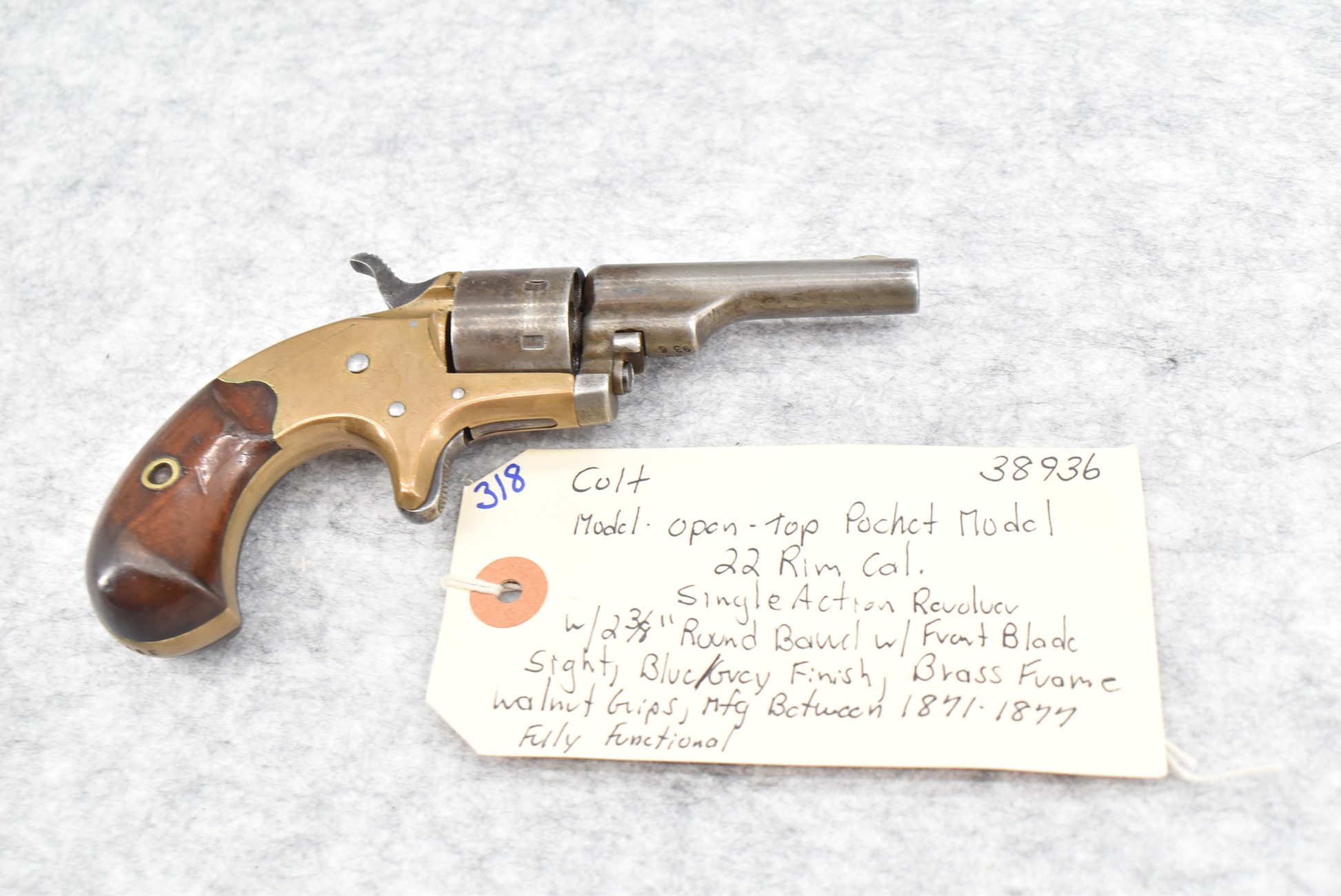 318. Colt – Mod. Open-Top Pocket Model – 22 Rim Cal. Single Action Revolver – w/2 3/8” Round Barrel w/Front Blade Sight – Blued/Gray Finish w/Brass Frame – w/Walnut Grip – Mfg. Between 1871-1877 – Fully Functional