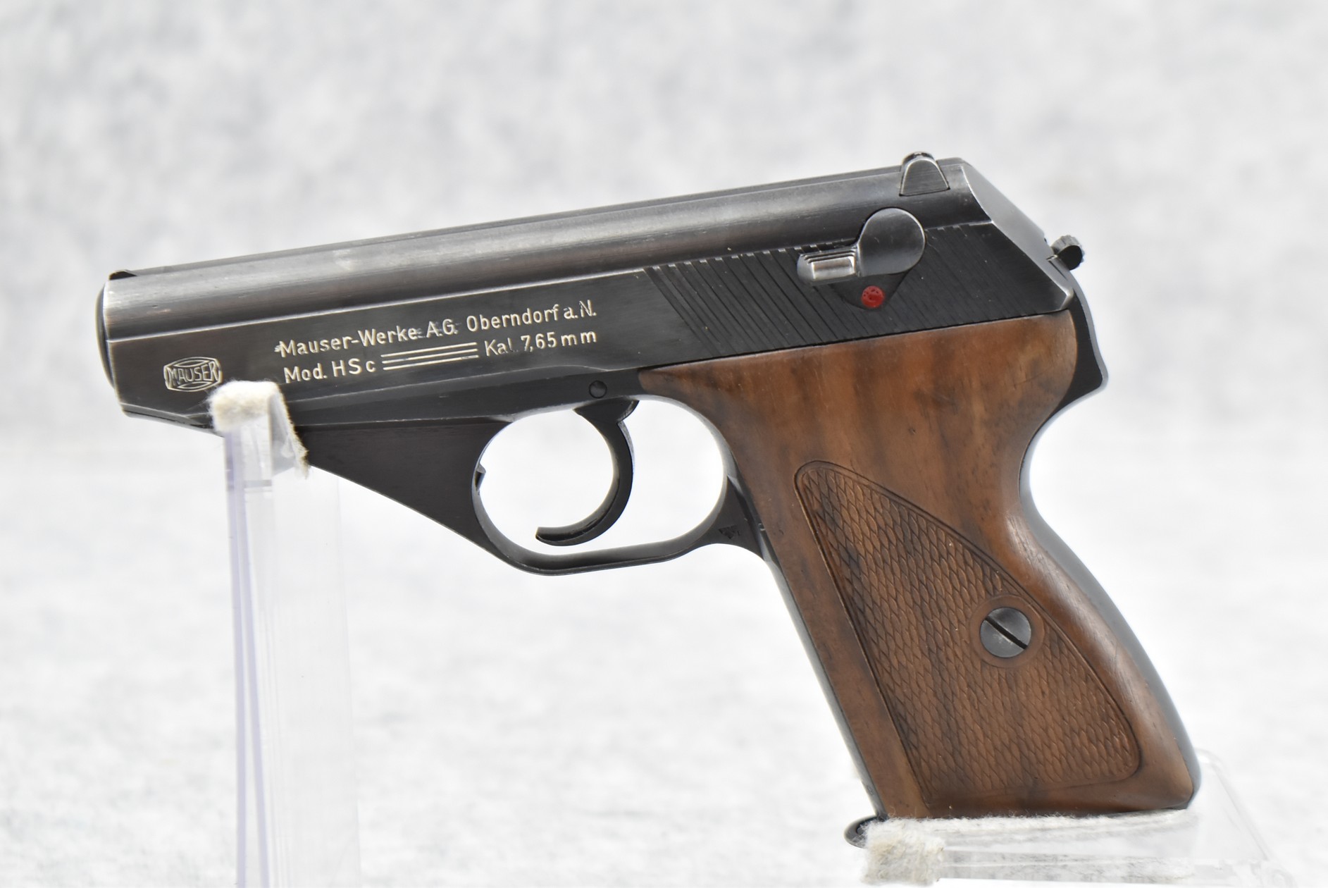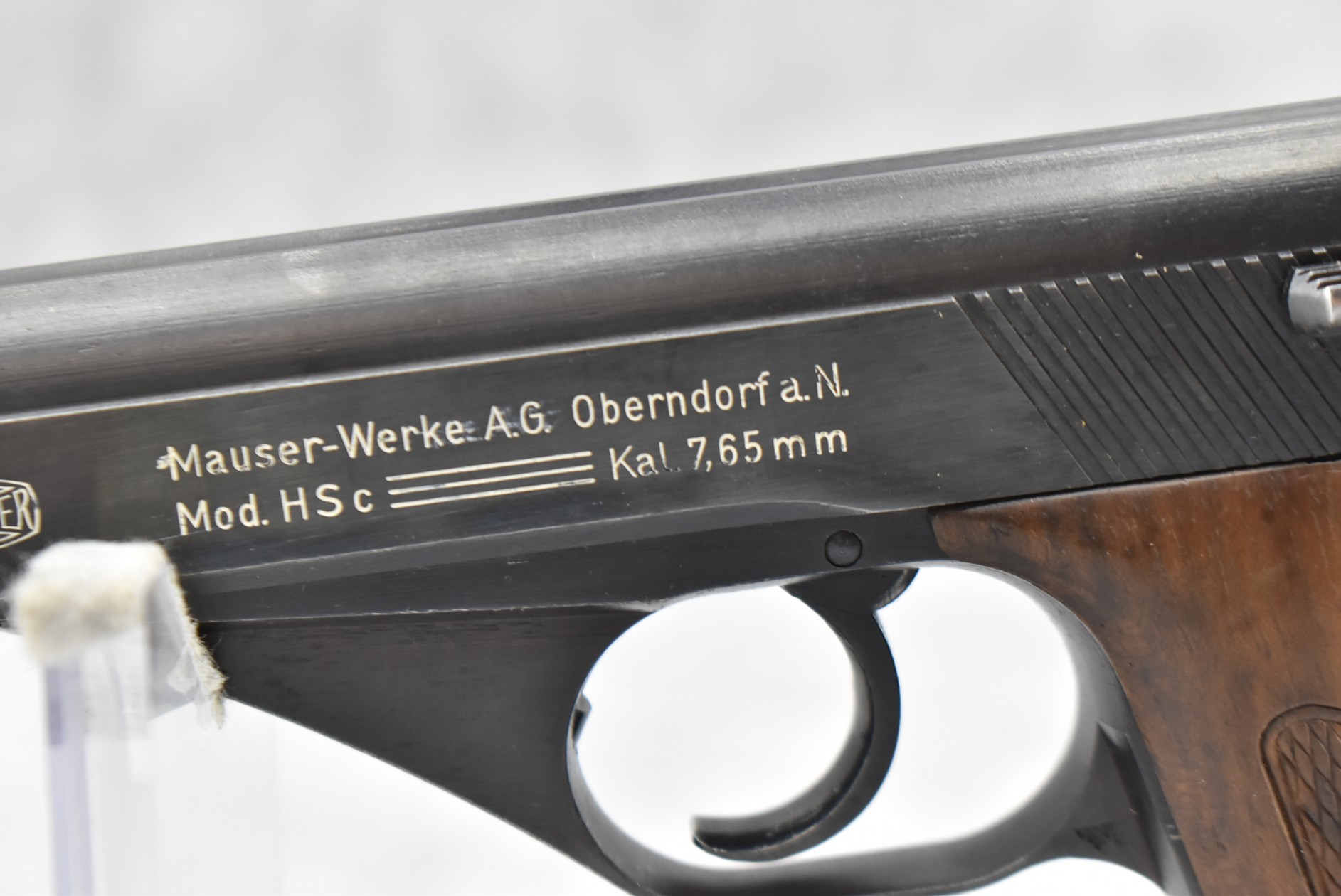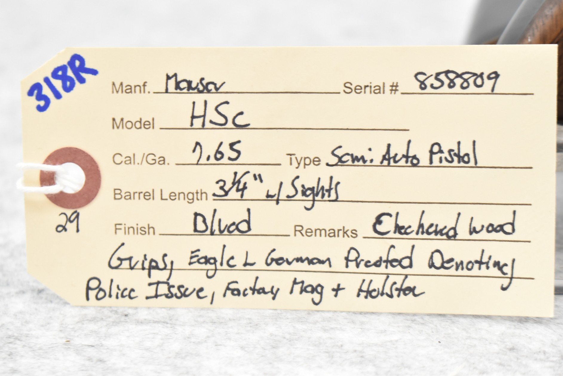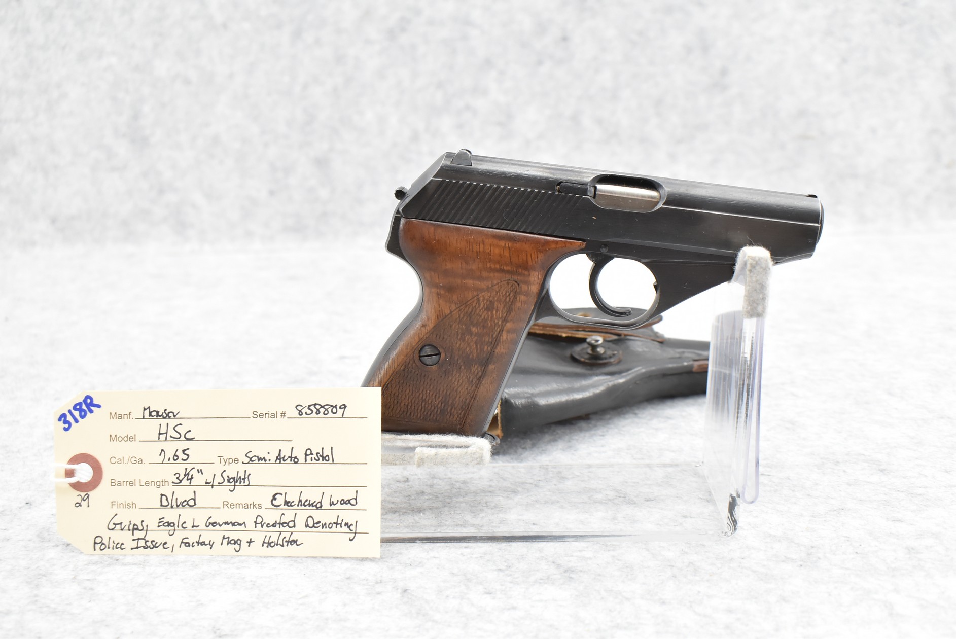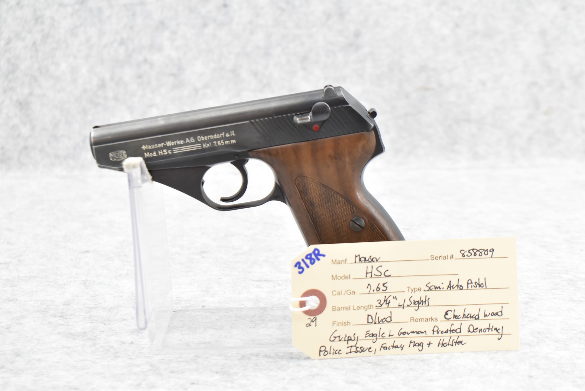 318R. Mauser – Mod. HSc – 7.65 Cal. Semi-Auto Pistol – w/3 ¼” Barrel w/Sights – Blued Finish – w/Checkered Wood Grips – Eagle L German Proofed Denoting Police Issue – w/Factory Mag & Holster