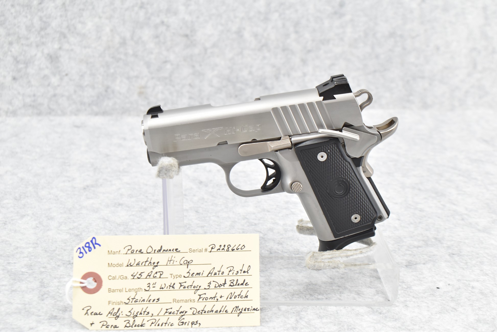 318R. Para Ordnance – Mod. Warthog Hi-Cap – 45 ACP Cal. Semi-Auto Pistol – w/3” Barrel w/Factory 3-Dot Blade Front & Notch Rear Adj. Sights – Stainless Finish – w/Para Black Plastic Grips – w/Factory Detachable Magazine