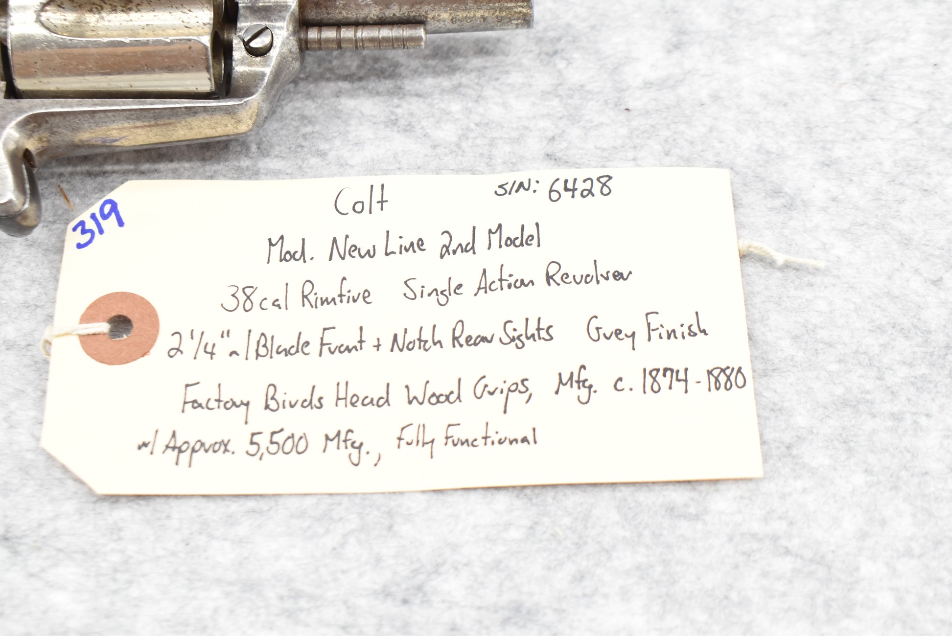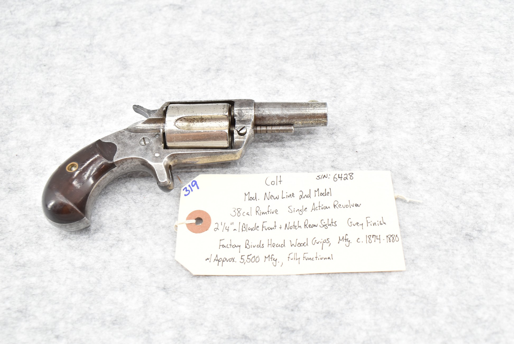 319. Colt – Mod. New Line 2nd Model – 38 Cal. RF Single Action Revolver – w/2 ¼” Barrel w/Blade Front & Notch Rear Sights – Gray Finish – w/Factory Birds Head Wood Grips – Approx. 5,500 Mfg. Between Circa 1874-1880 – Fully Functional