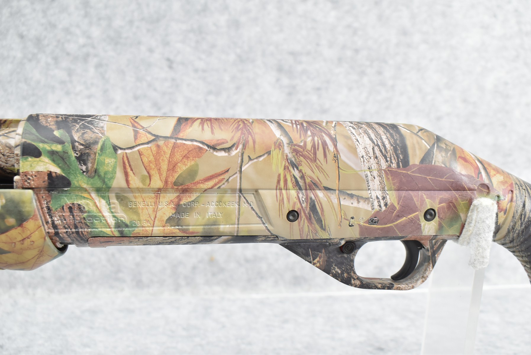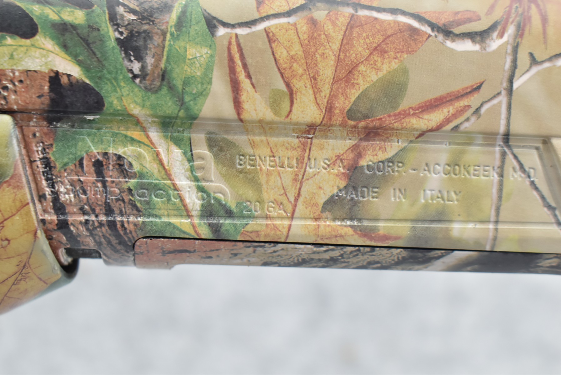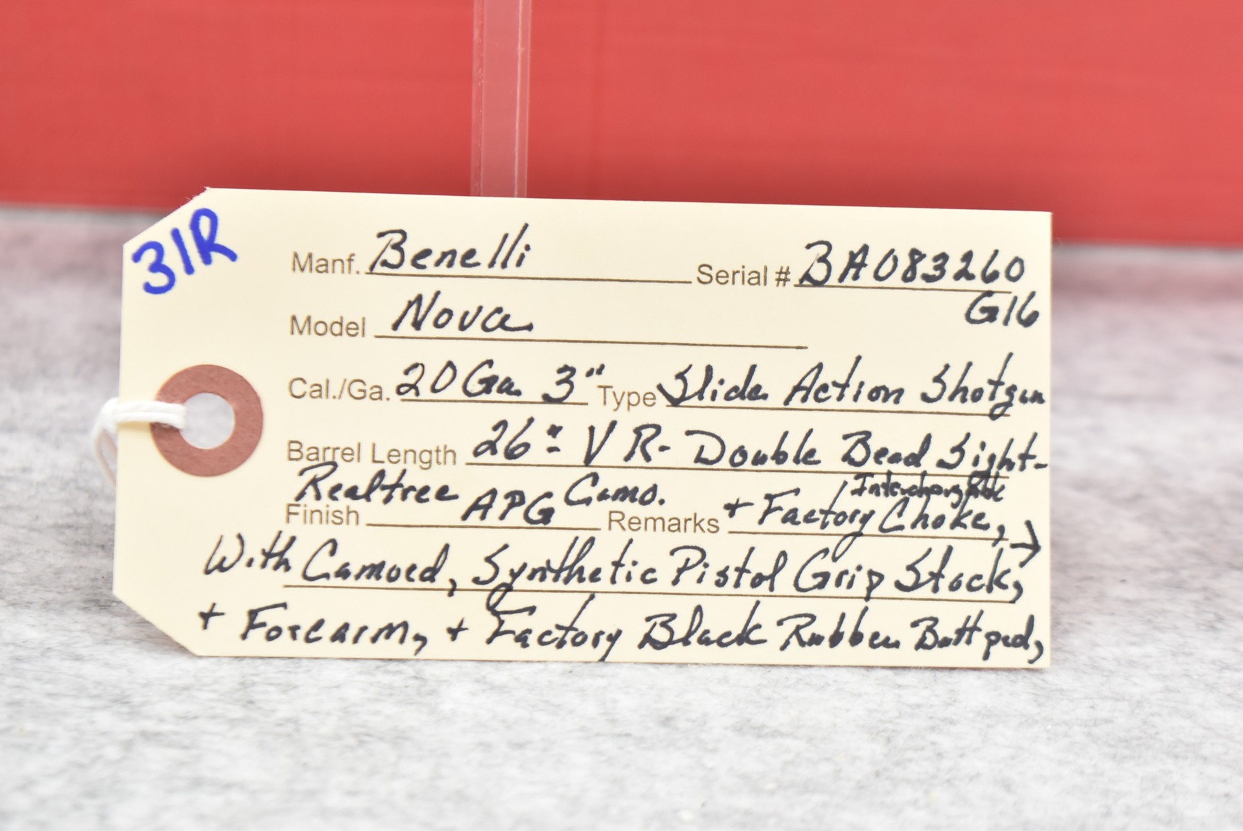 31R. Benelli – Mod. Nova – 20ga. 3” Pump Action Shotgun – w/26” Vent-Rib Barrel w/Double Bead Sight & Factory Interchangeable Choke – Realtree APG Full Camo Coverage – w/Camoed Synthetic Pistol Grip Stocks w/Factory Butt Pad – Appears Unfired w/Box, Manual & Chokes