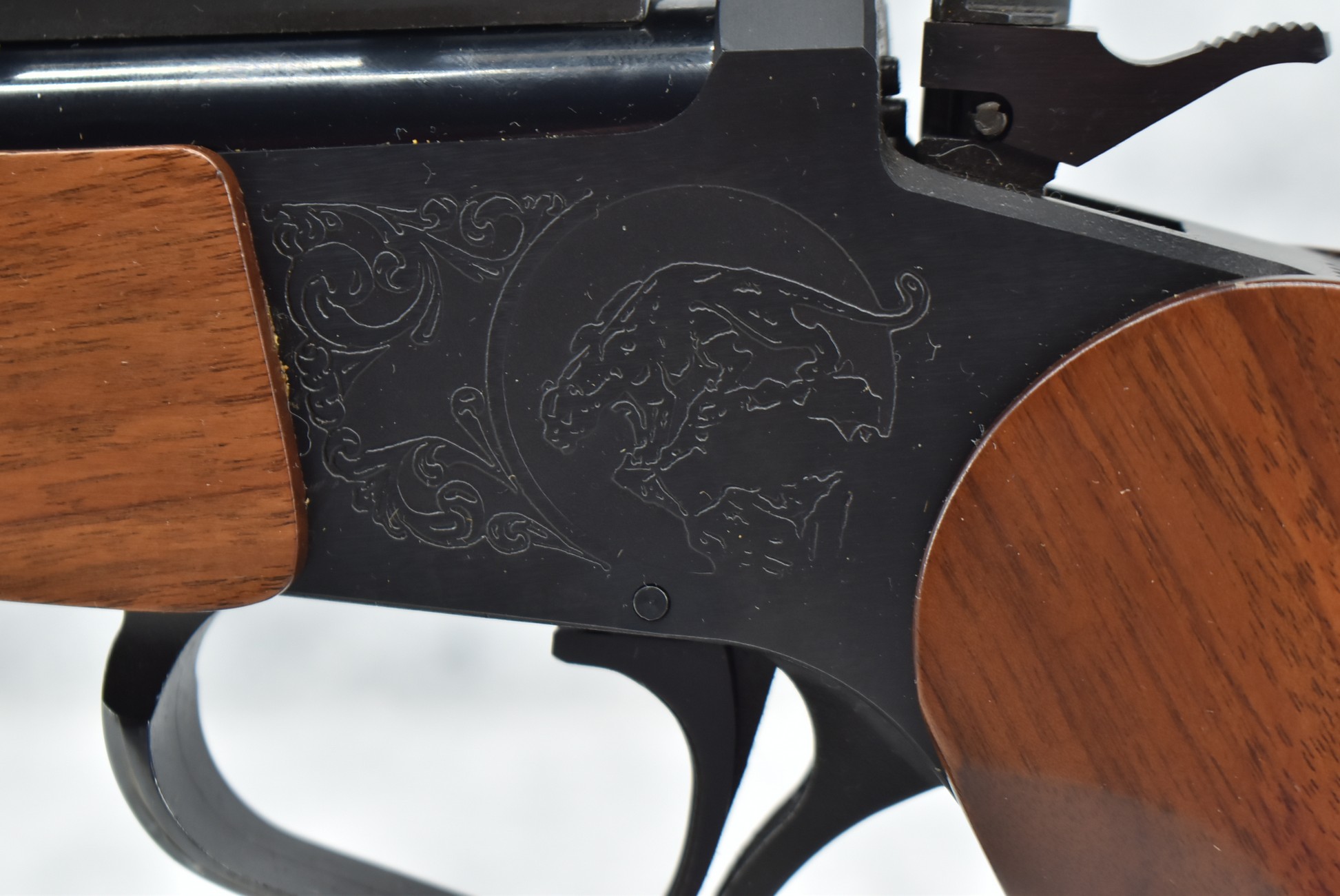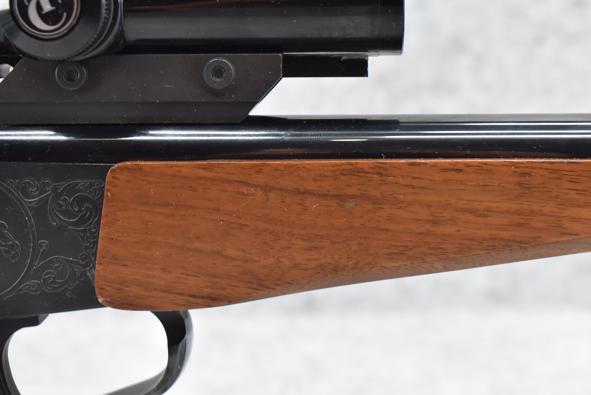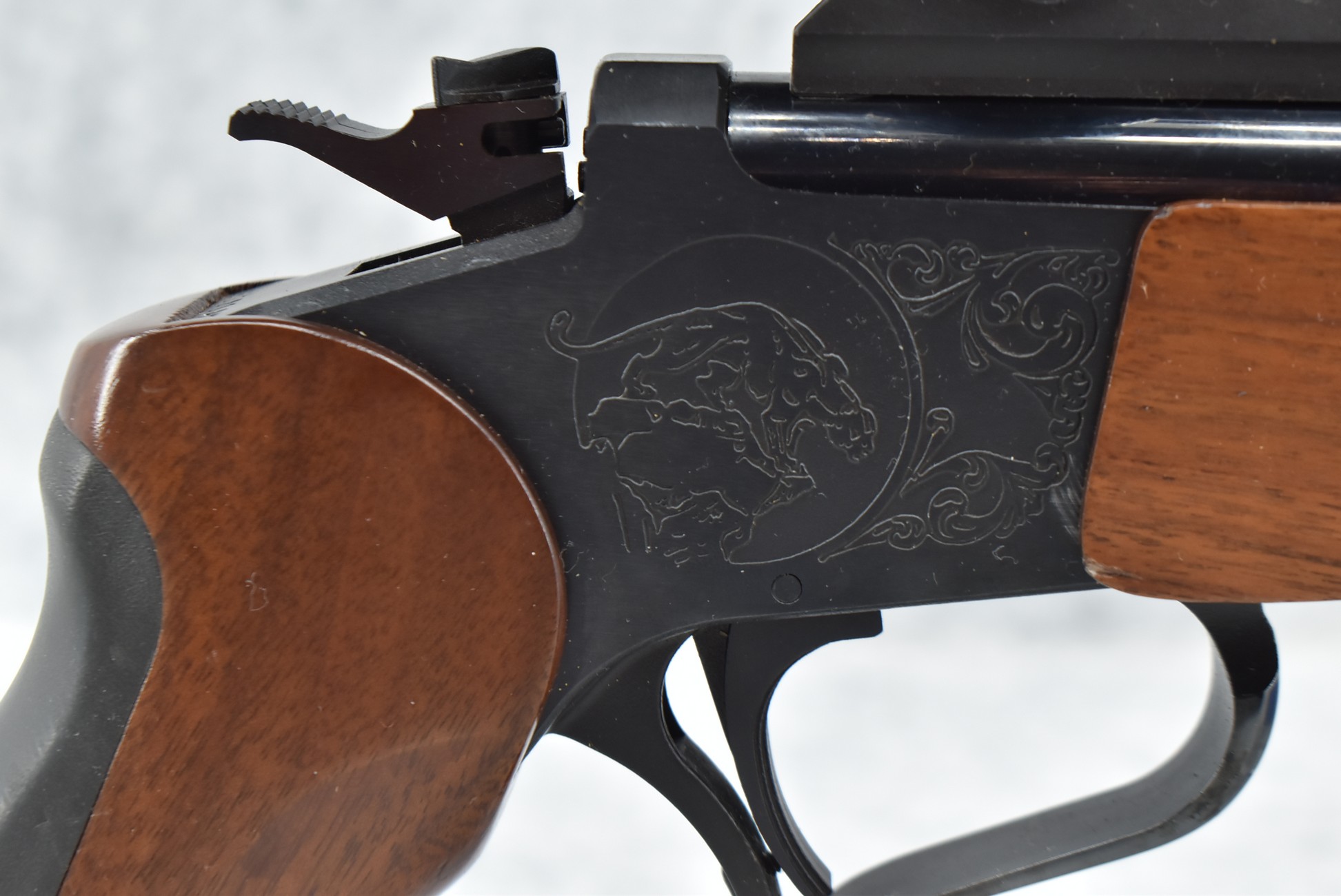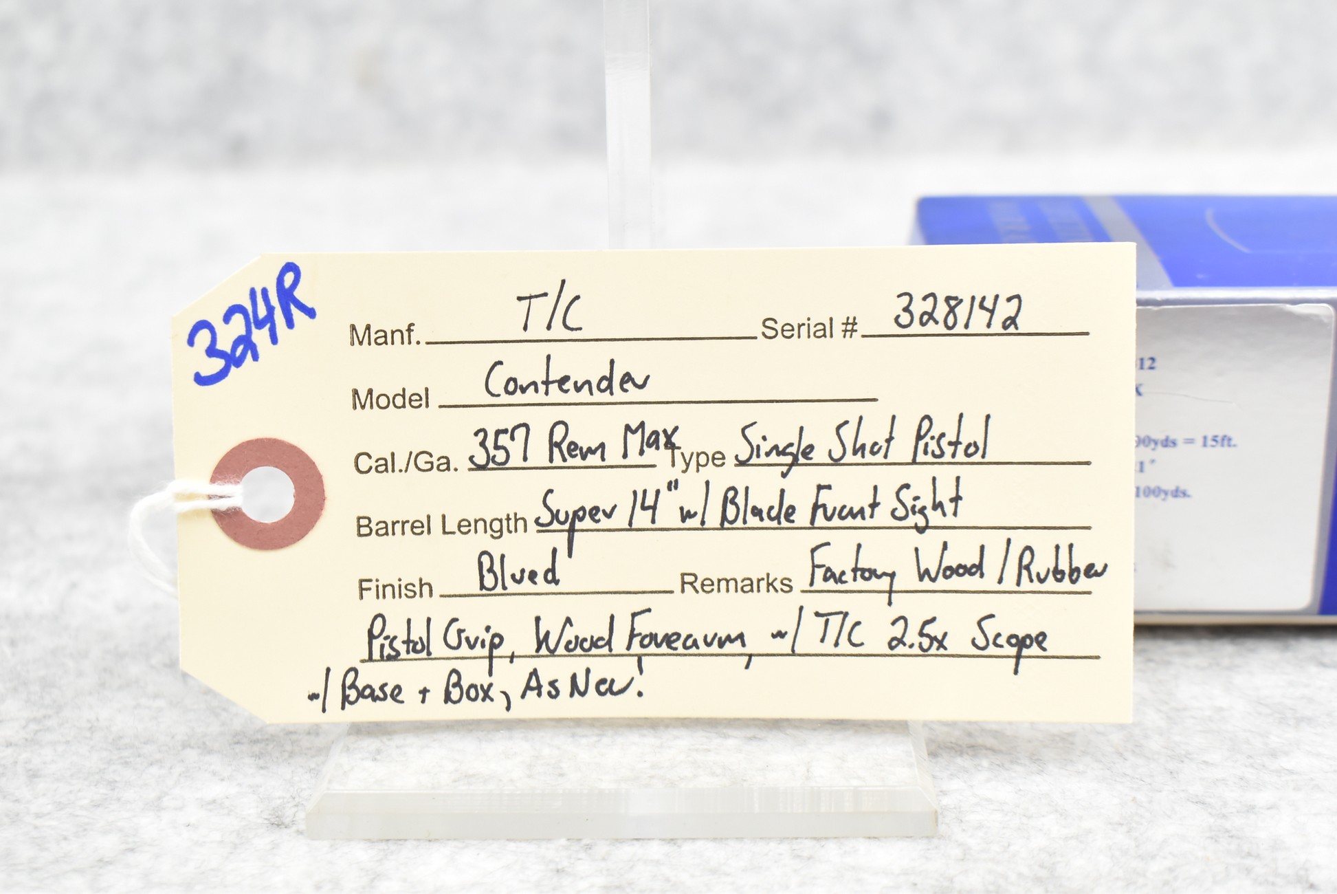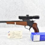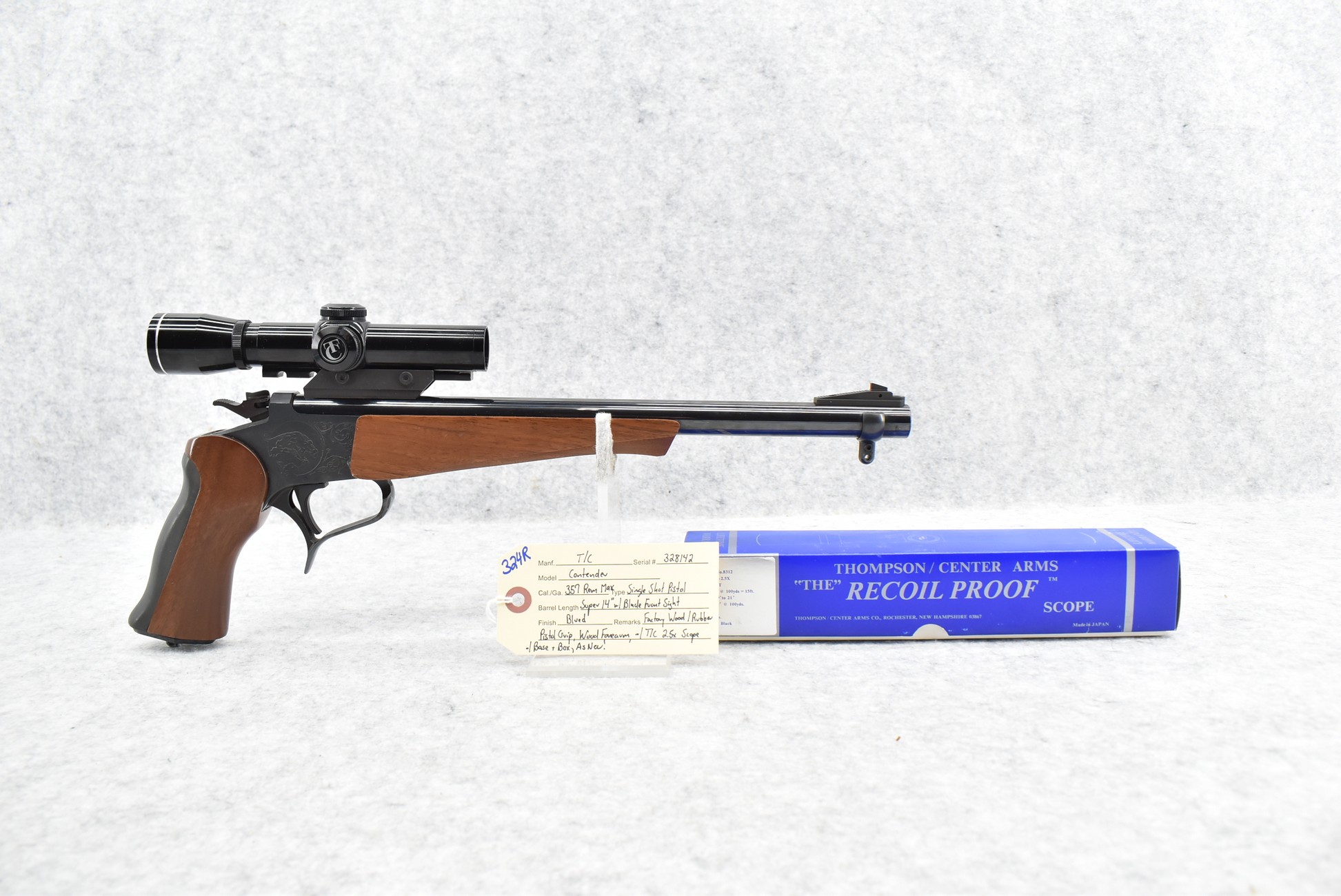 324R. Thompson Center – Mod. Contender – 357 Rem. Max. Cal. Single Shot Pistol – w/Super 14” Barrel w/Blade Front Sight – Blued Finish – w/Factory Wood/Rubber Pistol Grip & Wood Forearm – w/Thompson Center 2.5x Scope w/Base – As New w/Scope Box!